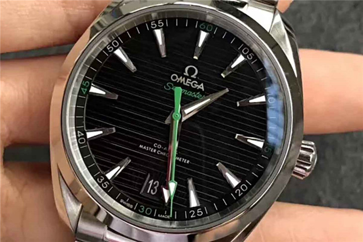 VS欧米茄海马系列150M绿针高尔夫款复刻腕表漆黑色表盘上的垂直纹理,大三针的设计。饰有绿色转印“Seamaster”(海马)字样,时间刻度和时标显示采用白色和绿色的设计,秒针也采用绿色的设计,令时间的读取一目了然,这充满活力的绿色不知又将令多少男士心醉了。