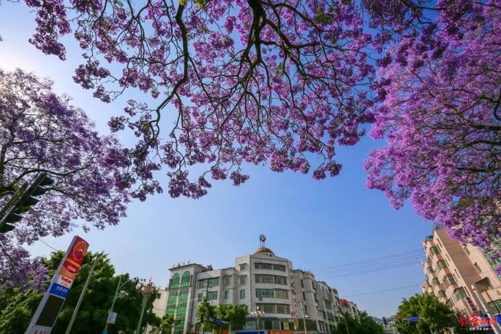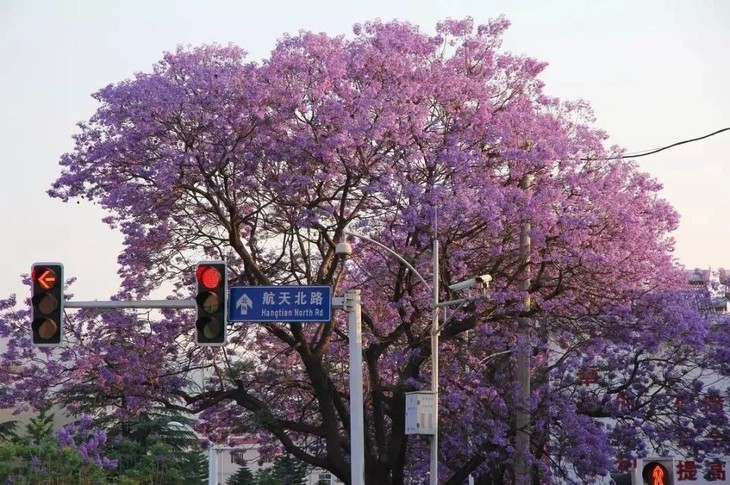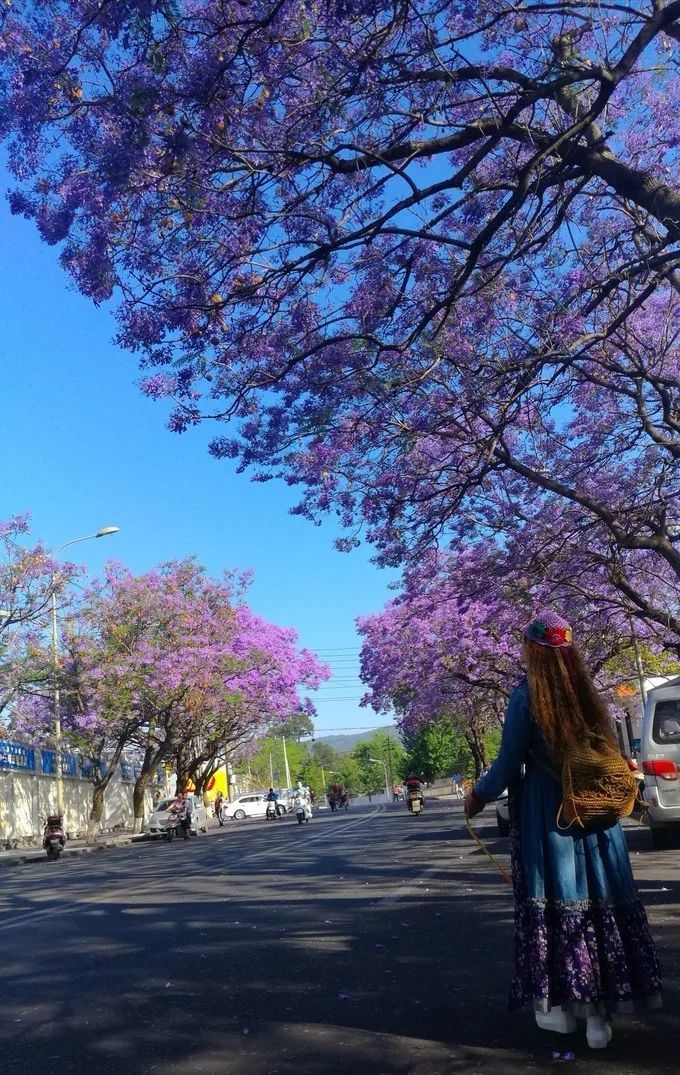 但其实在我国,也有一座被当做中转站的低调小城,同样藏有这些悲伤浪漫的蓝花楹,一到4-5月,便成为了蓝紫色的海洋!