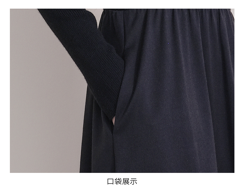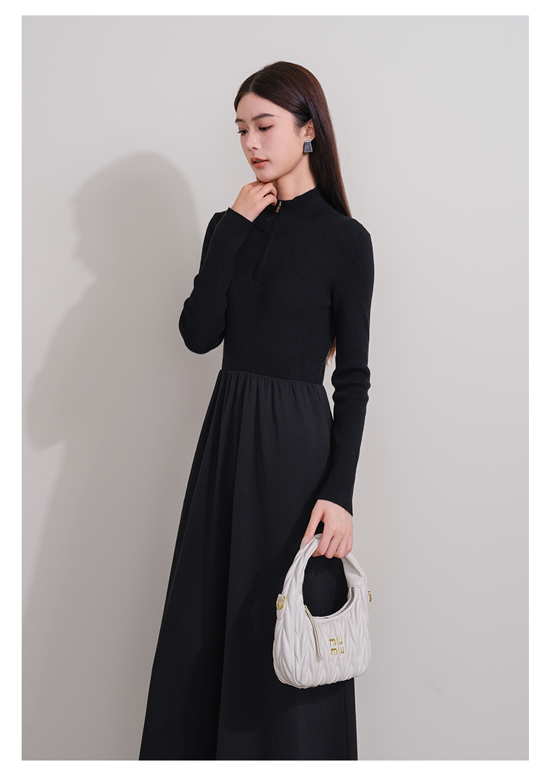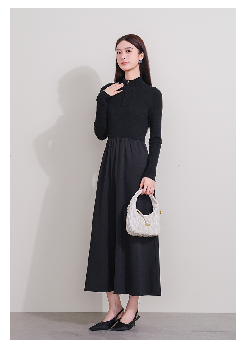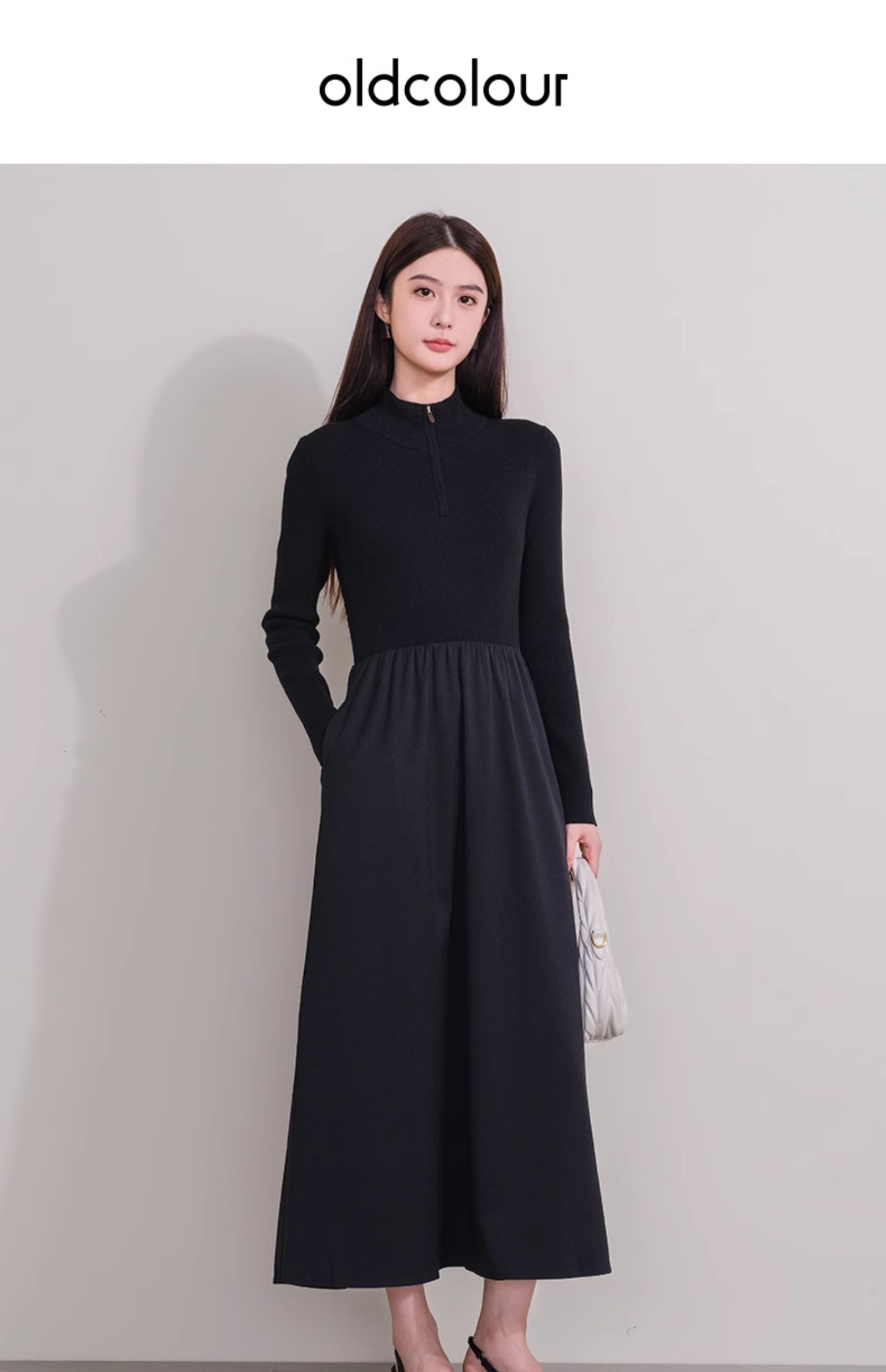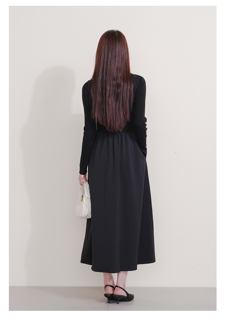 oldcolour冬季新款黑色拼接修身高腰A字长款针织连衣裙P421001A1