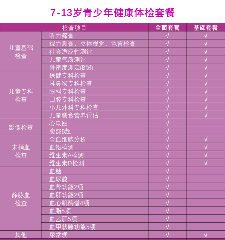 【儿童体检】7-13岁青少年健康体检套餐
