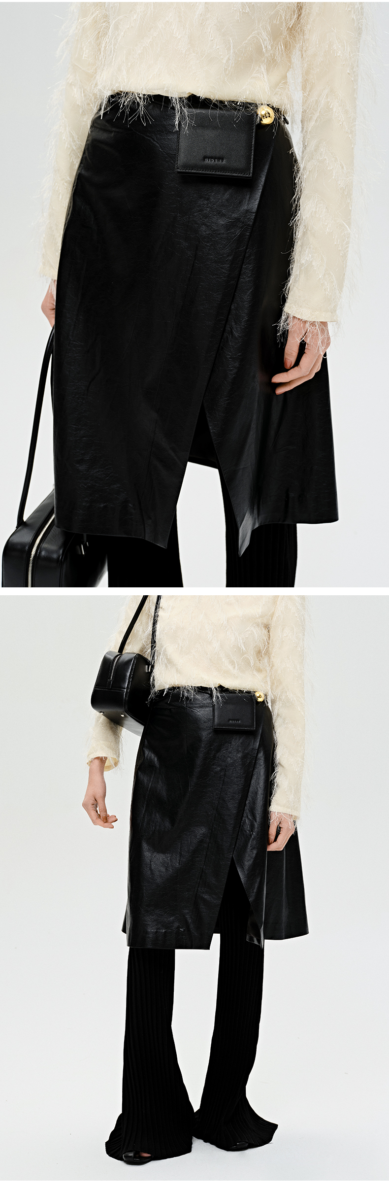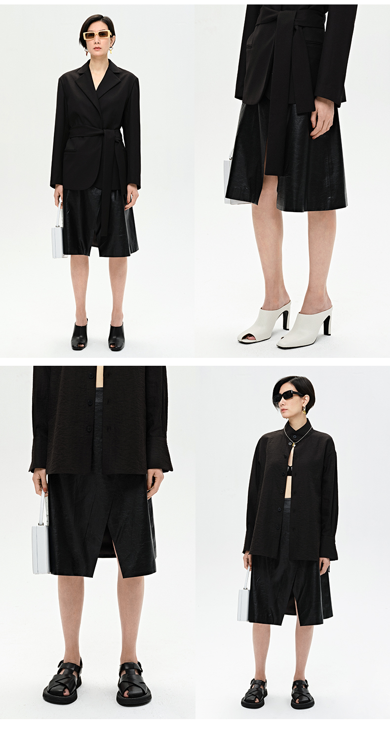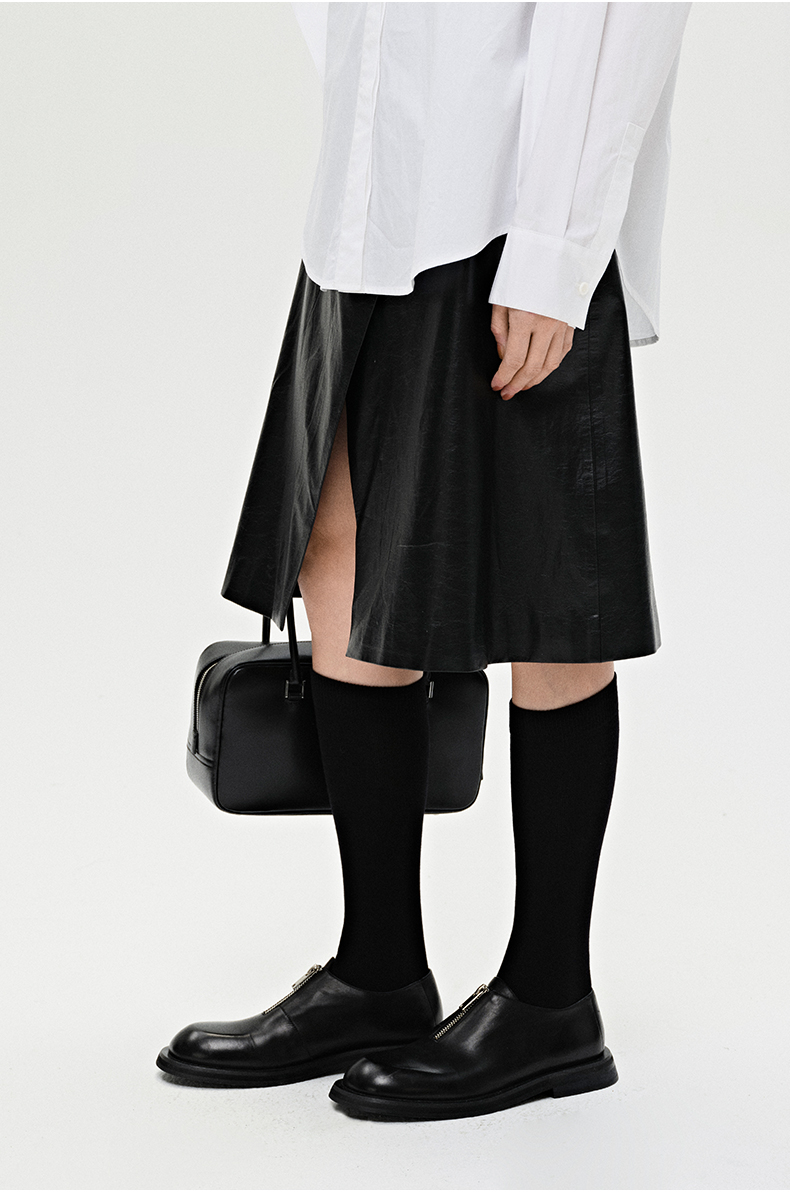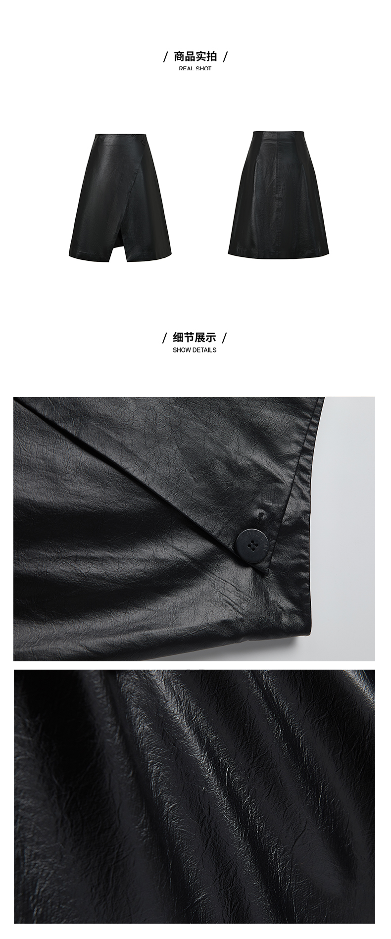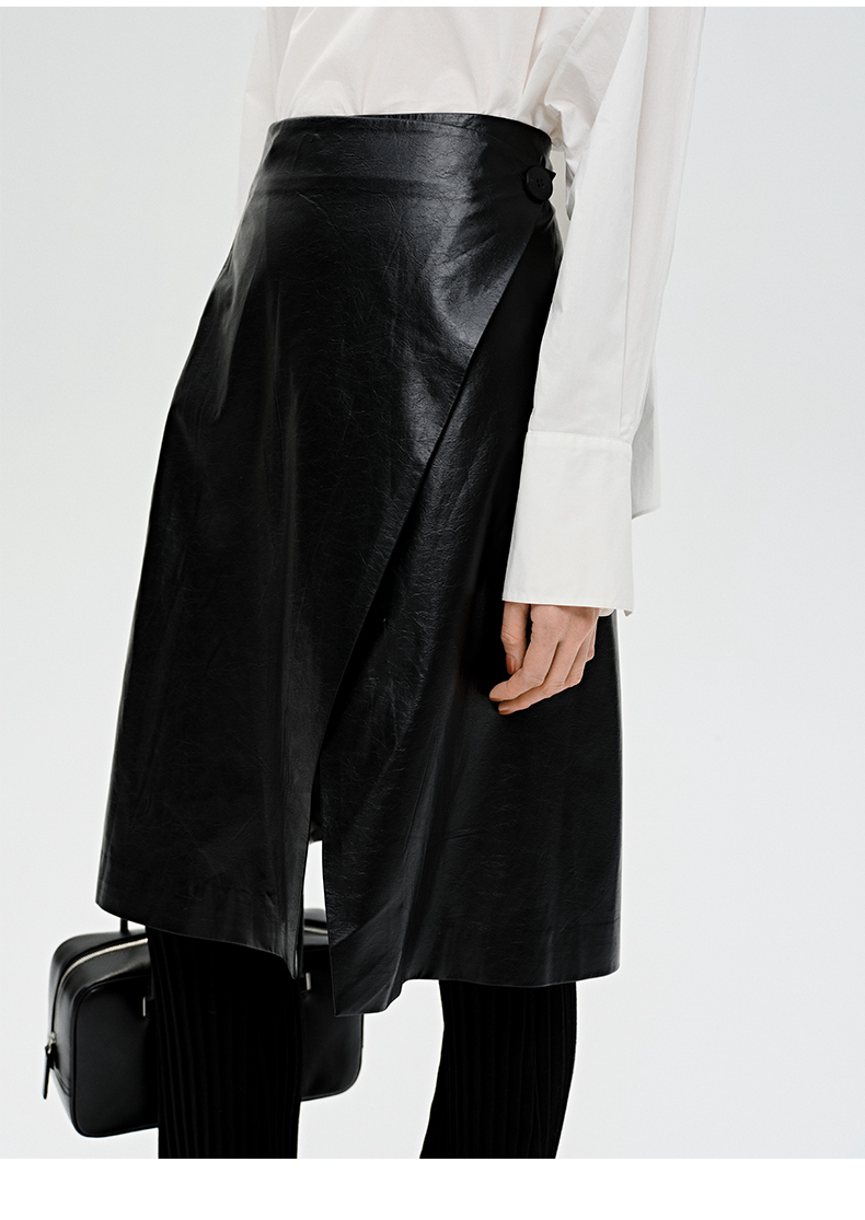 HIDEMI 褶皱做旧感环保皮黑色一粒扣不对称半身裙