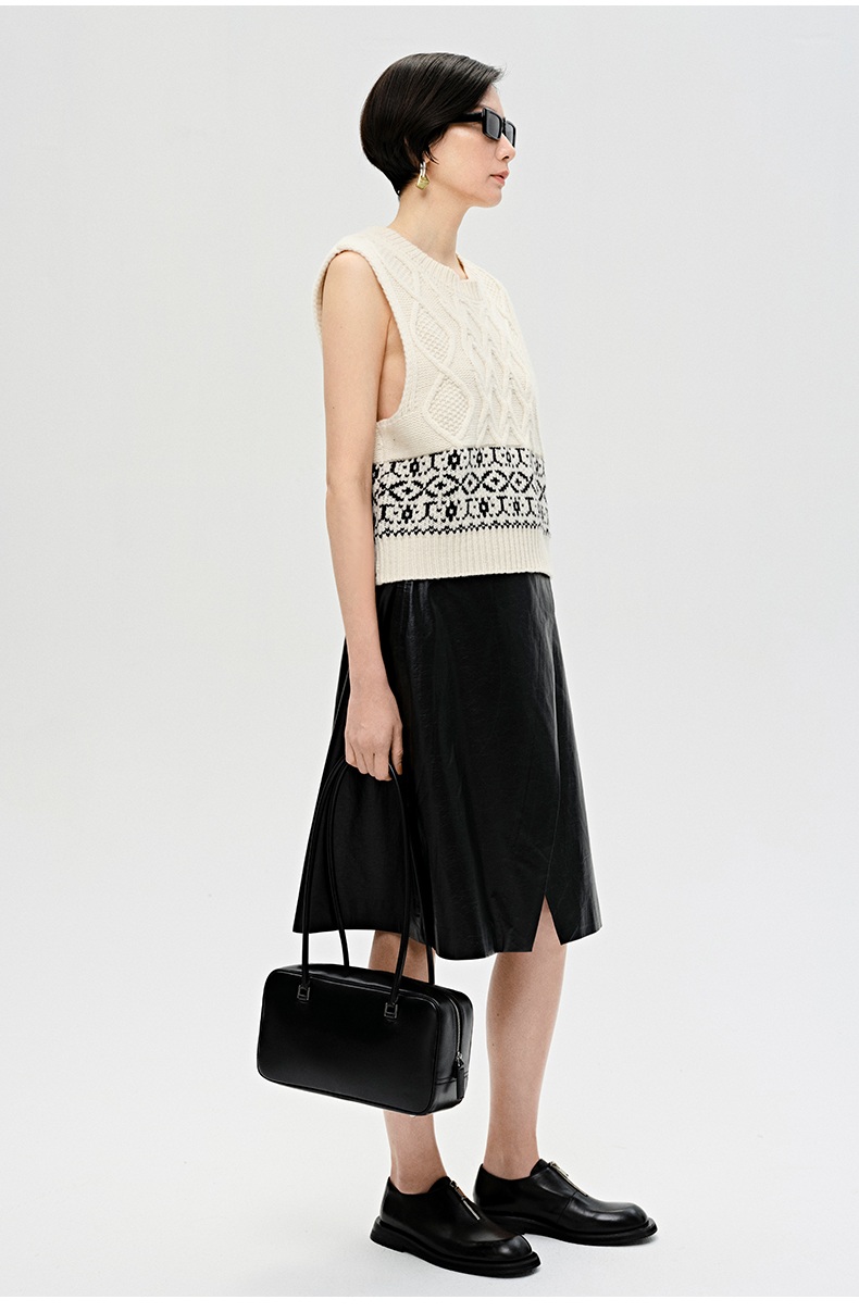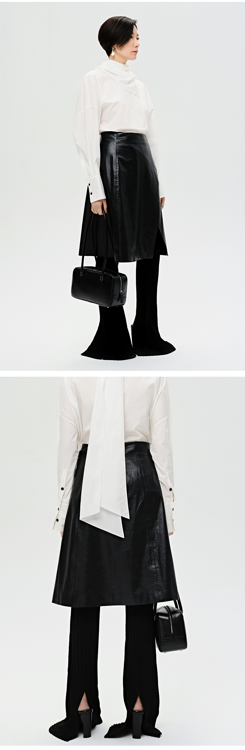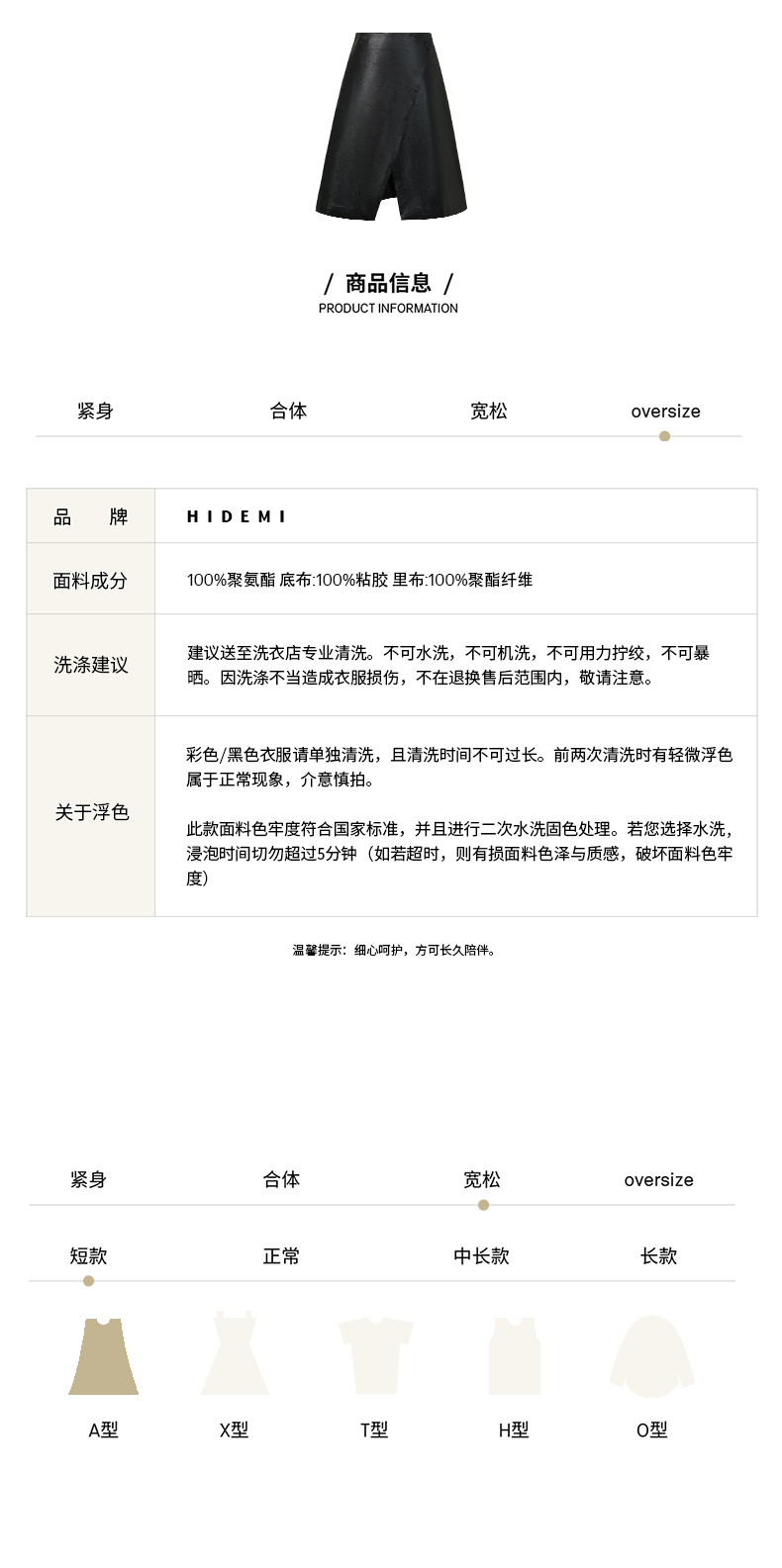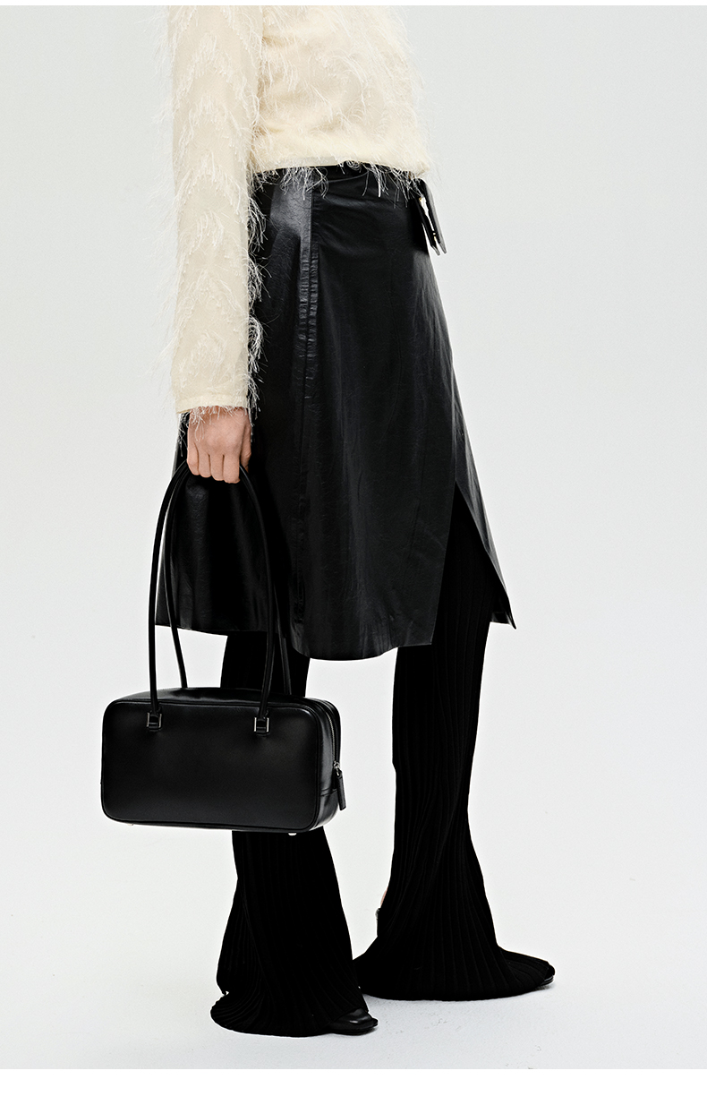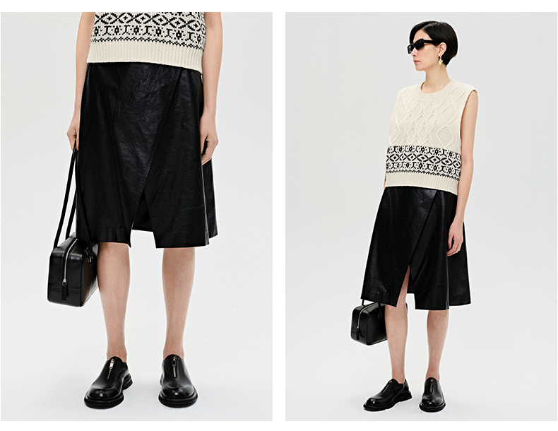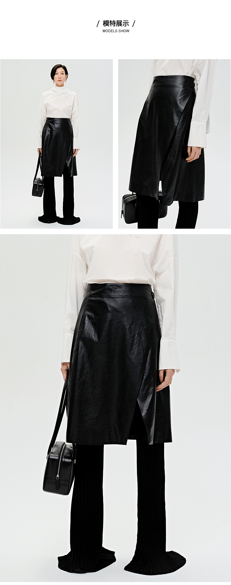 HIDEMI 褶皱做旧感环保皮黑色一粒扣不对称半身裙