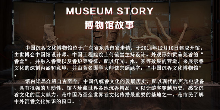 - 中国沉香文化博物馆坐落于古代[香市]东莞市寮步镇,是东莞政府倾力打造的重点文化项目,由世博会中国馆设计者,中国工程院院士、华南理工大学建筑学院院长何镜堂主持设计,以精美的现代[香盒]寓意香文化的深刻内