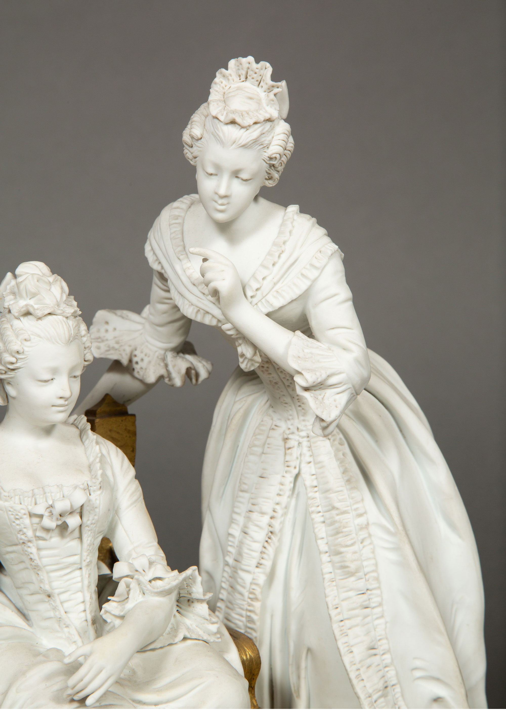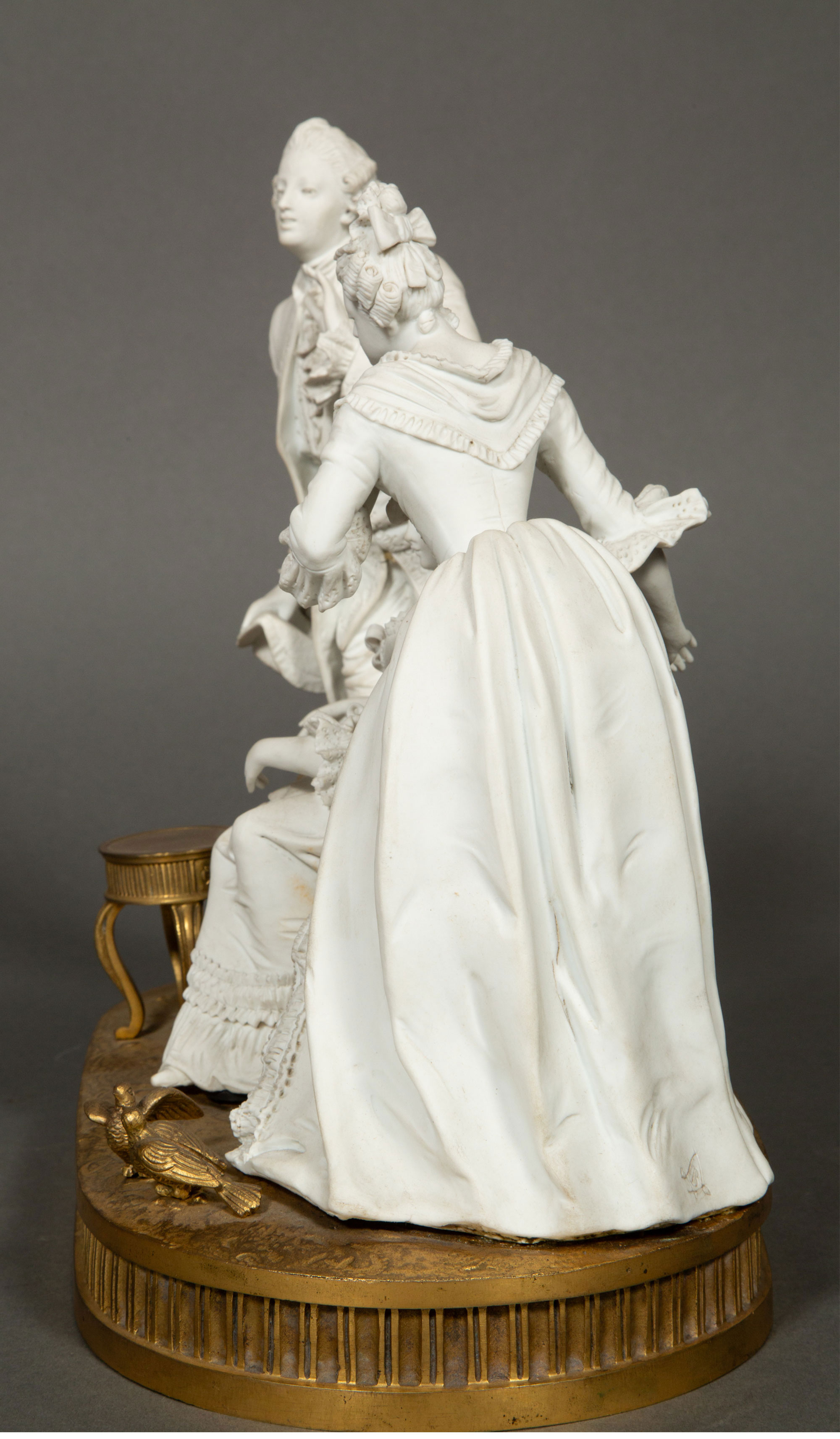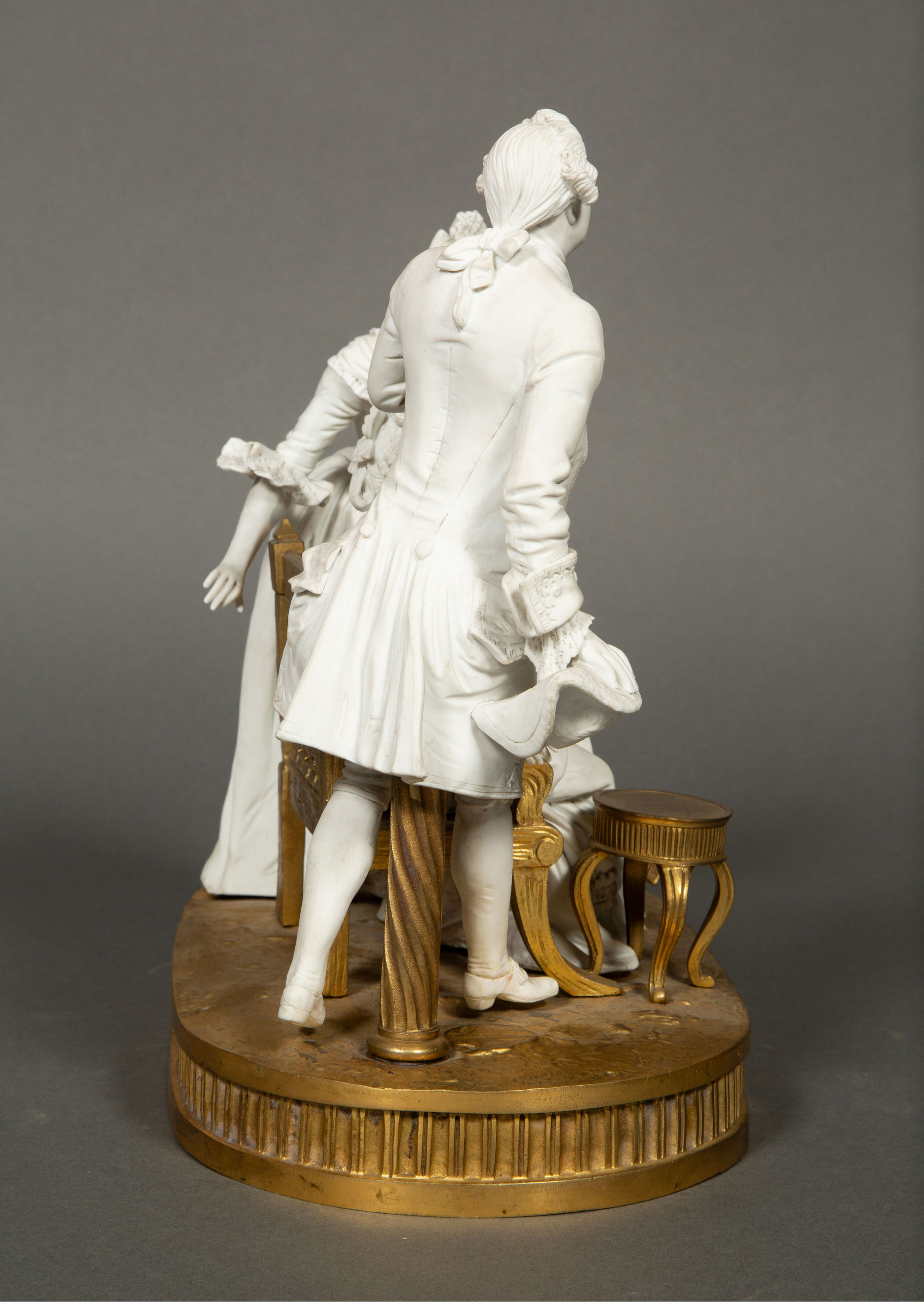 19世纪法国出品铜鎏金精雕底座装饰古典宫廷男女主题素胎瓷人物群雕
