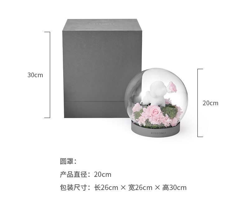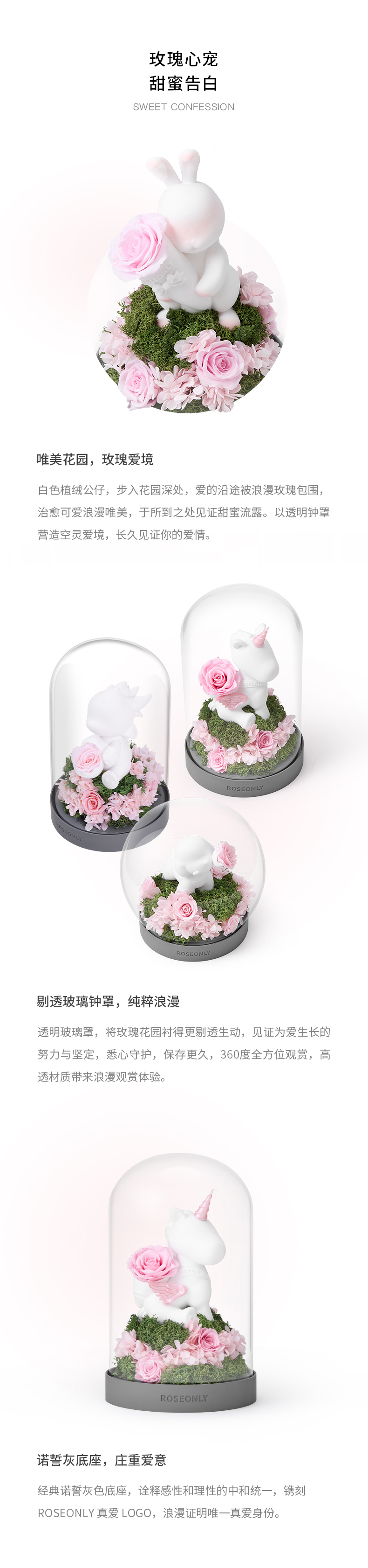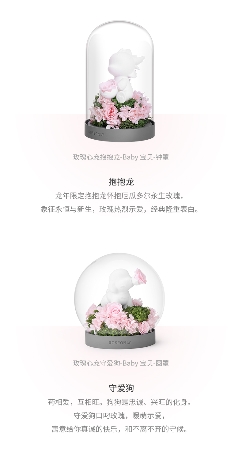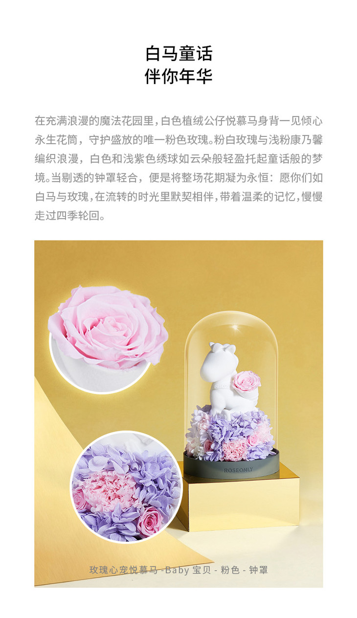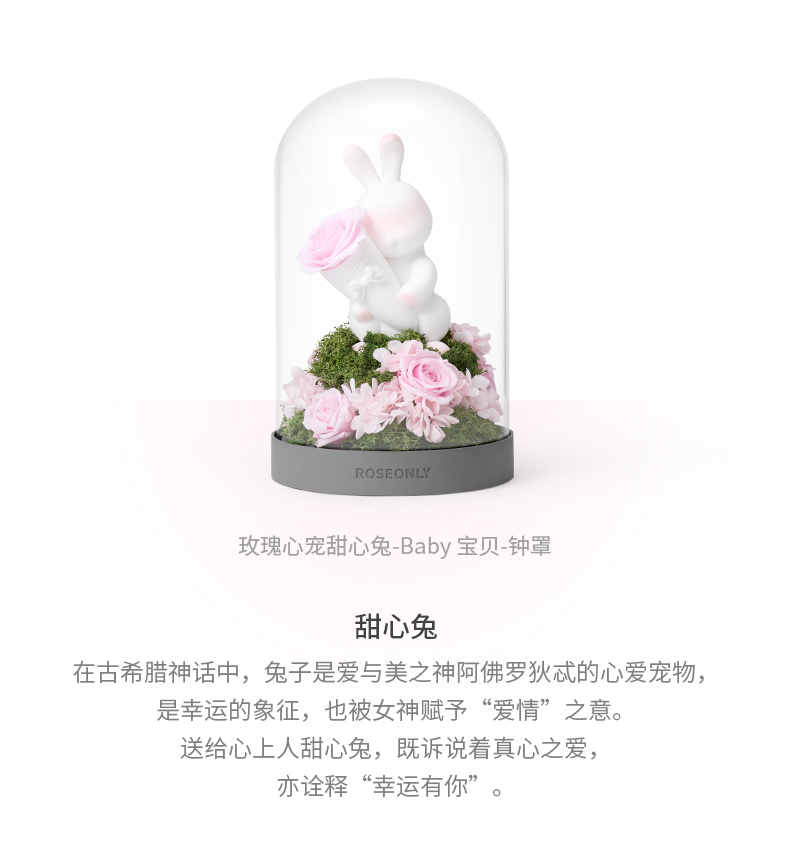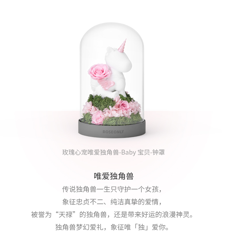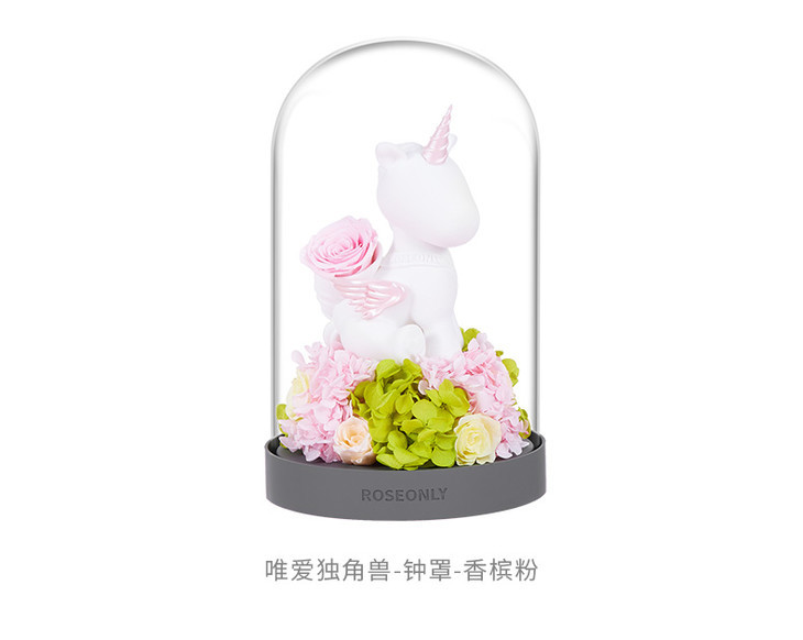【水晶之恋】ROSEONLY诺誓 水晶之恋 永生玫瑰花 Baby宝贝系列 钟罩圆罩 白兔 白独角兽 白守爱狗 送朋友送家人