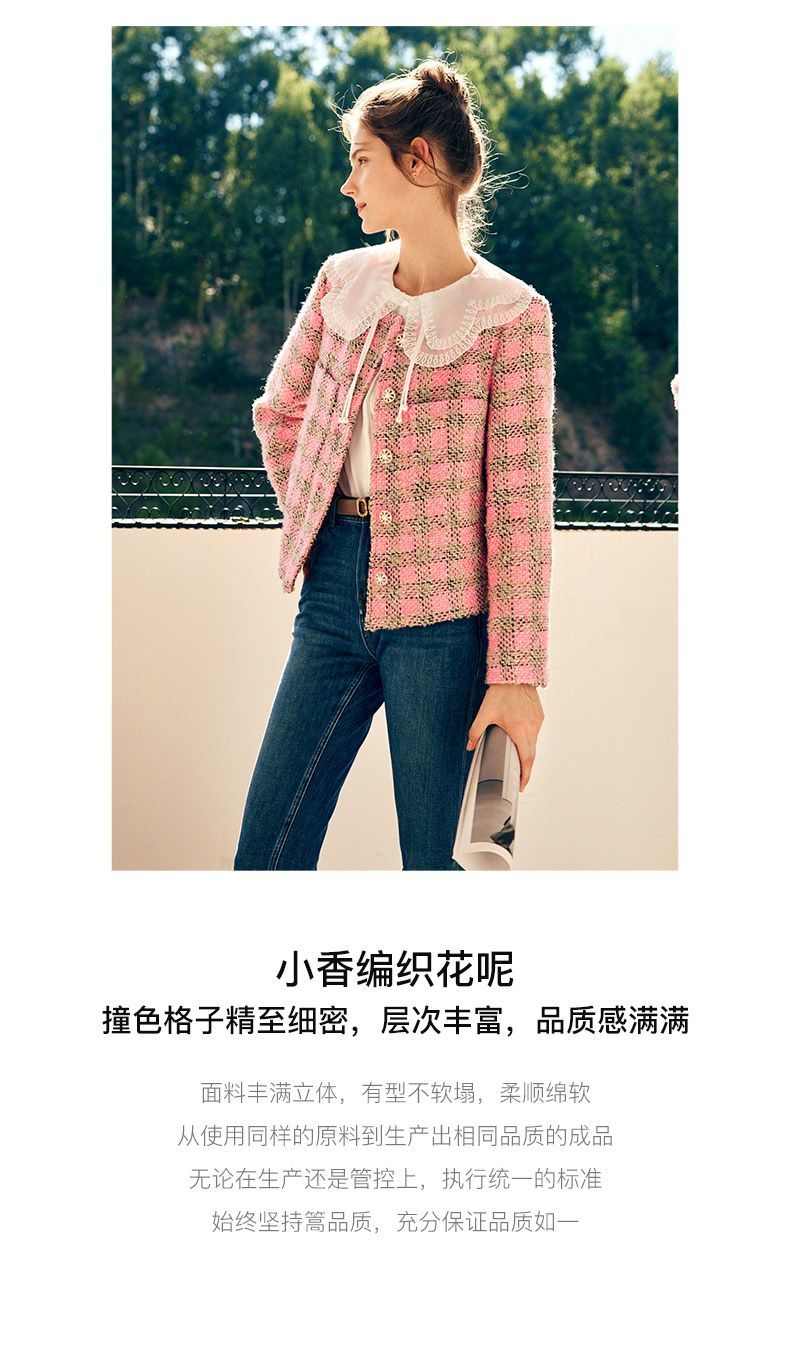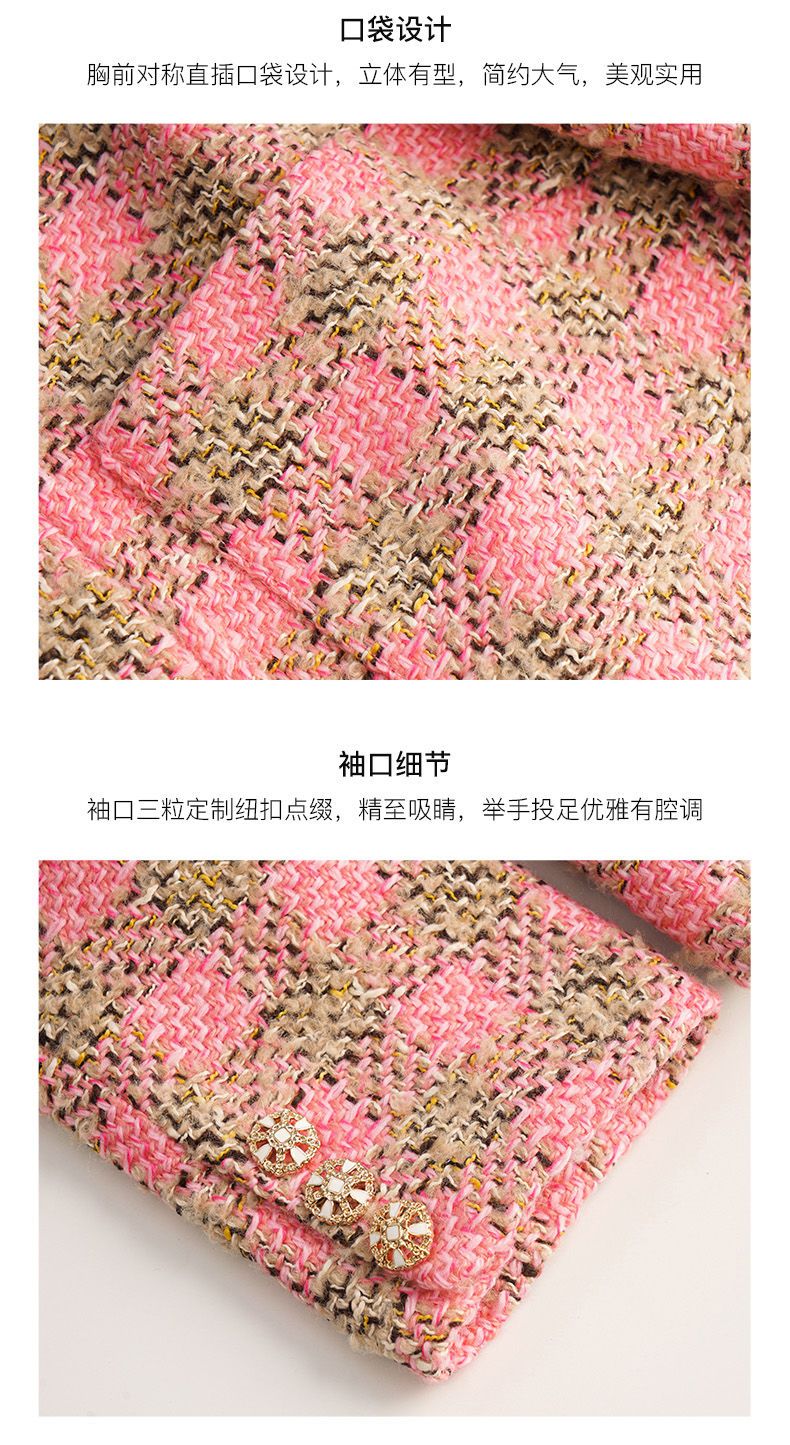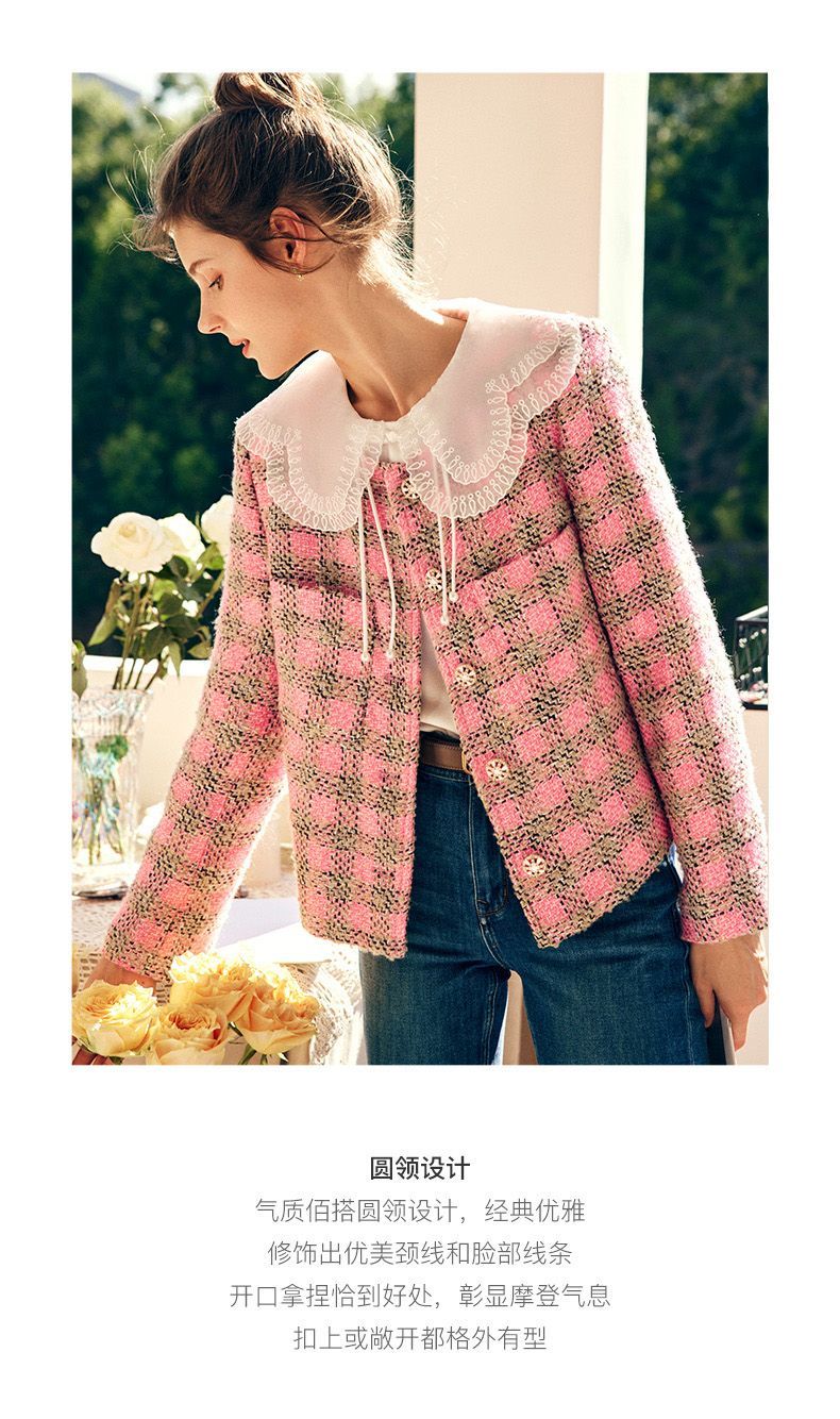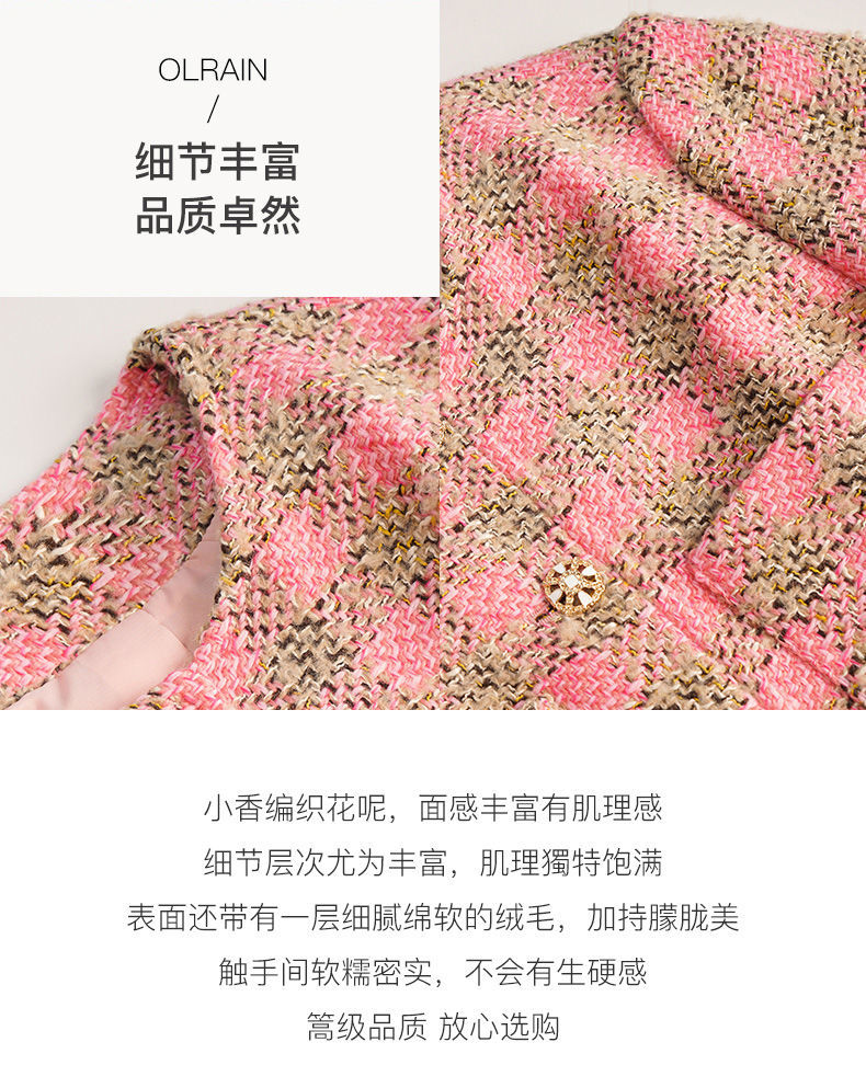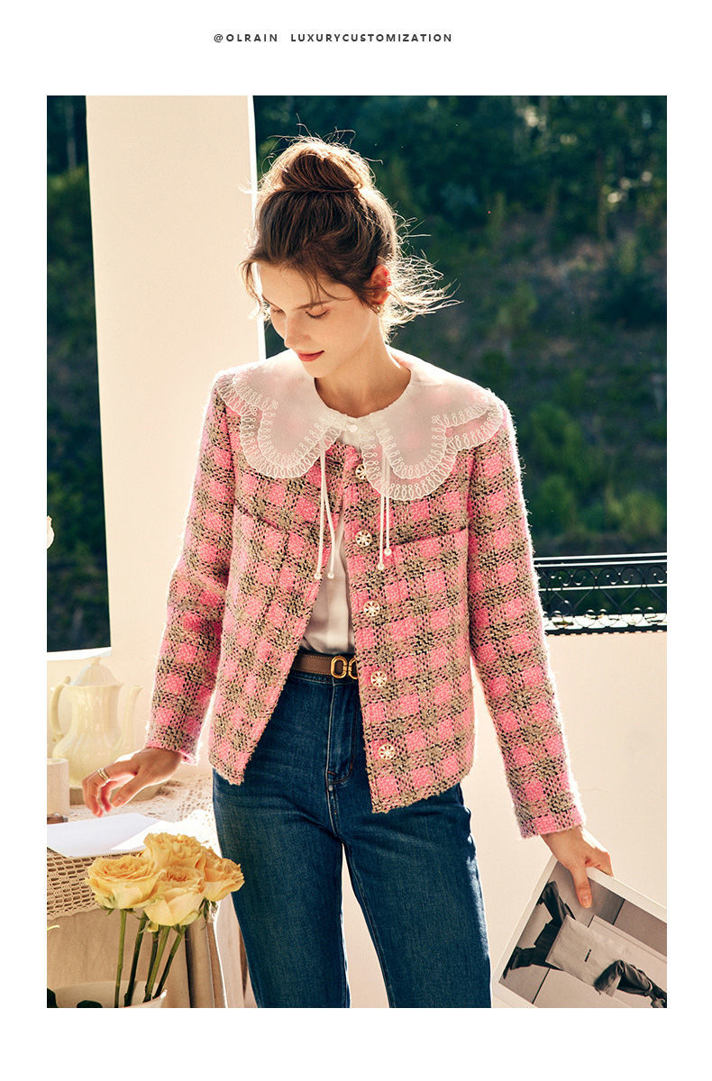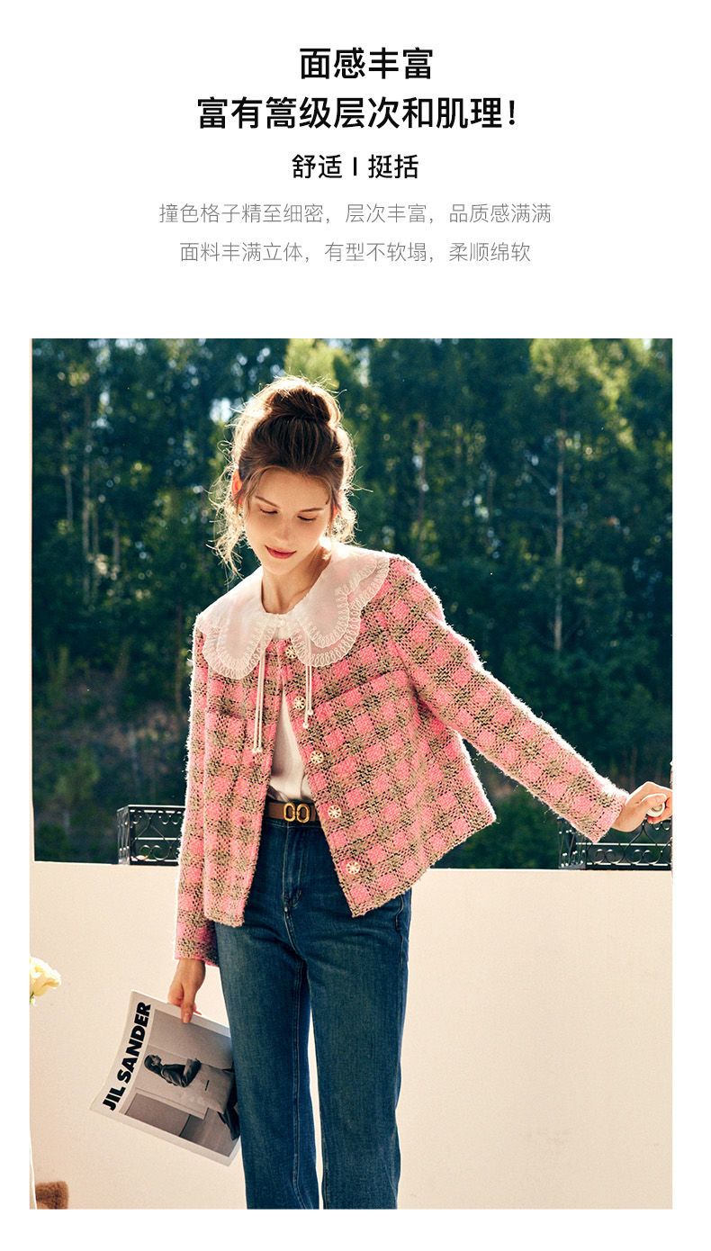 OLrain欧芮儿法式粉色小香风短外套女秋季2022年新款减龄格子上衣