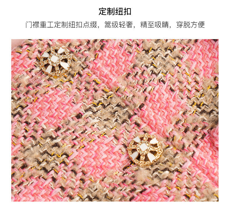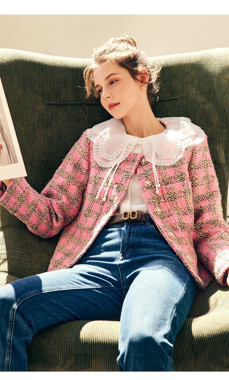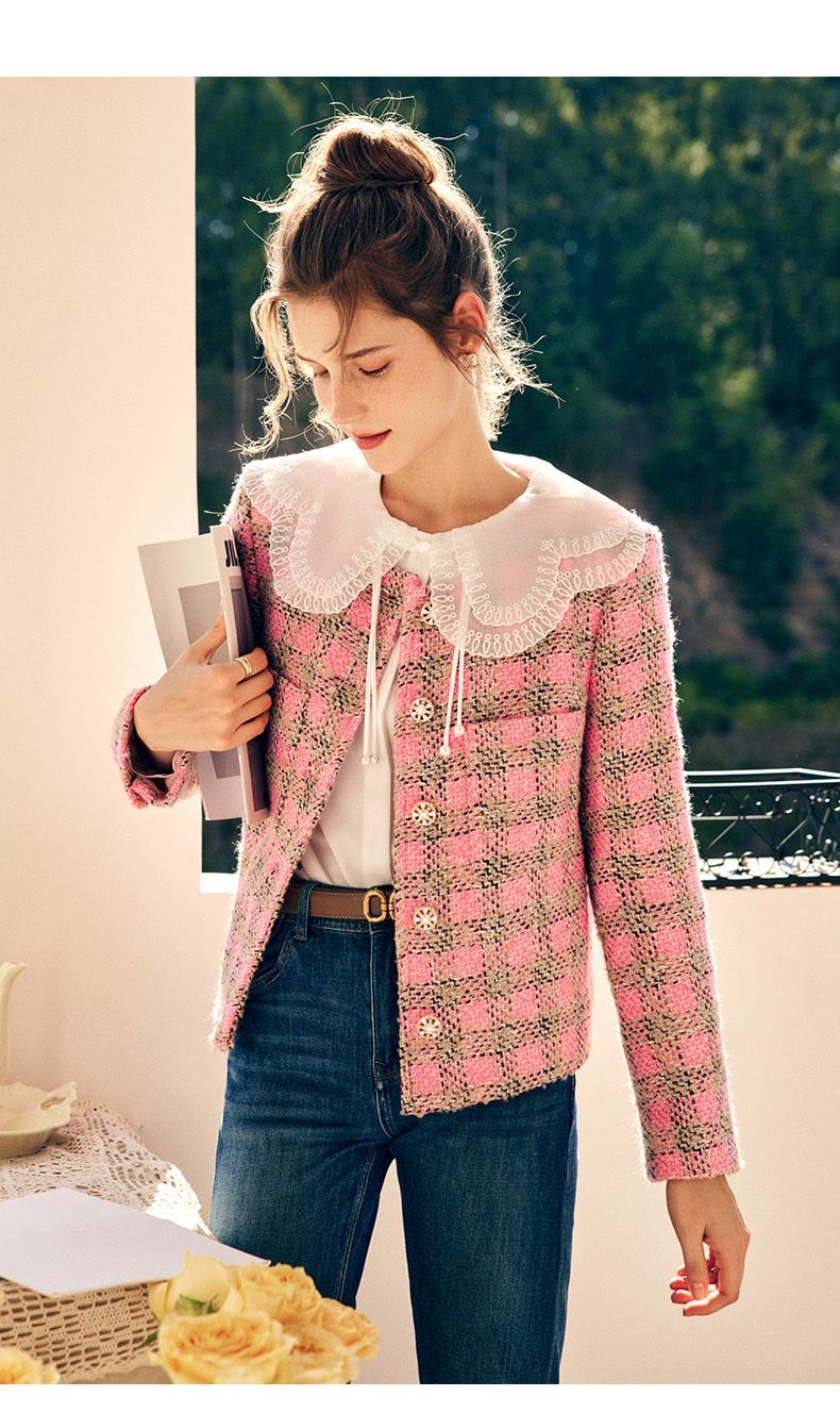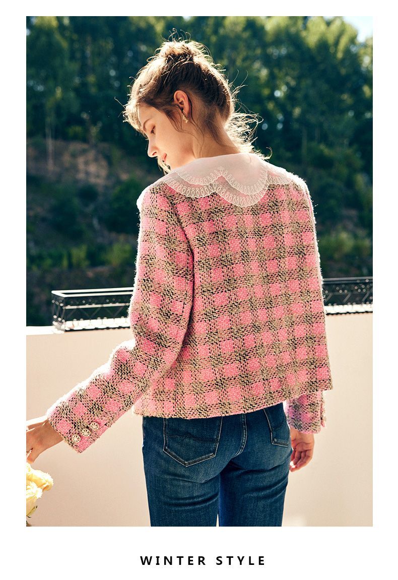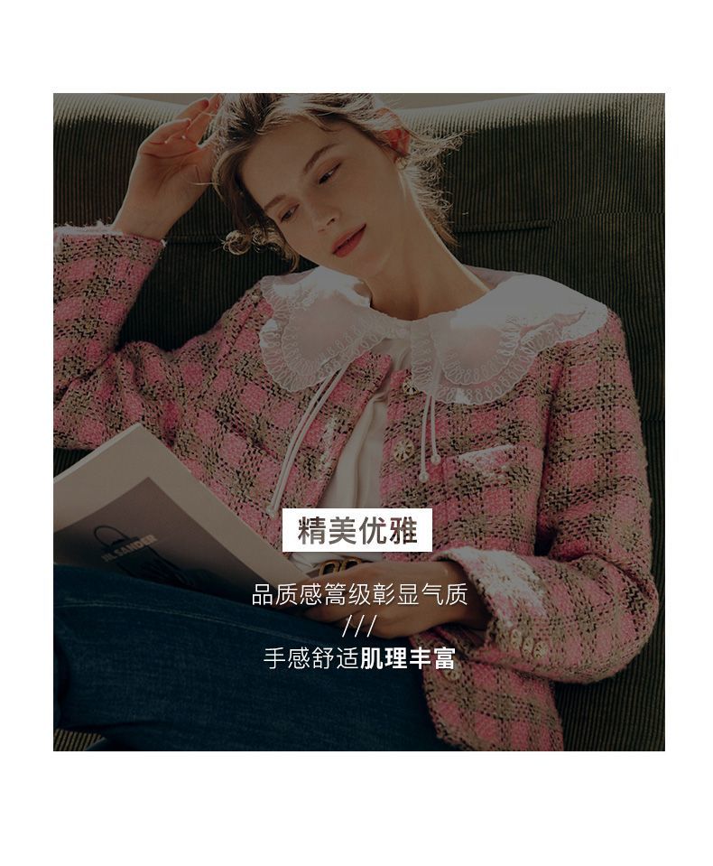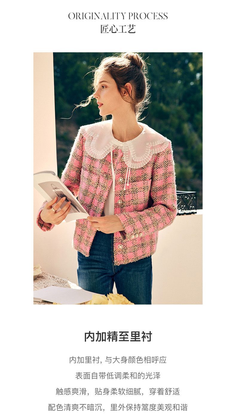 OLrain欧芮儿法式粉色小香风短外套女秋季2022年新款减龄格子上衣