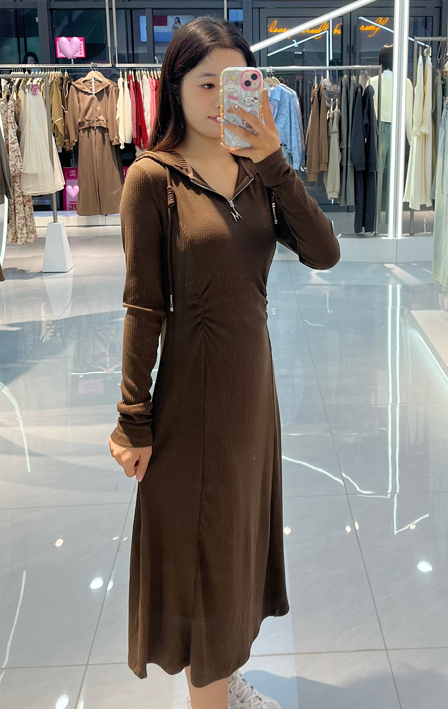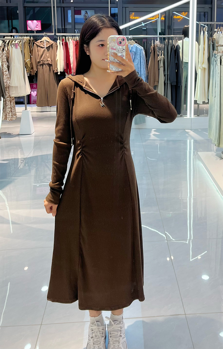 P&X设计师女装秋季长袖修身打底针织连衣长裙 824308391 咖色