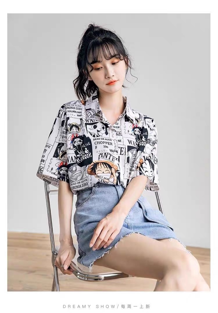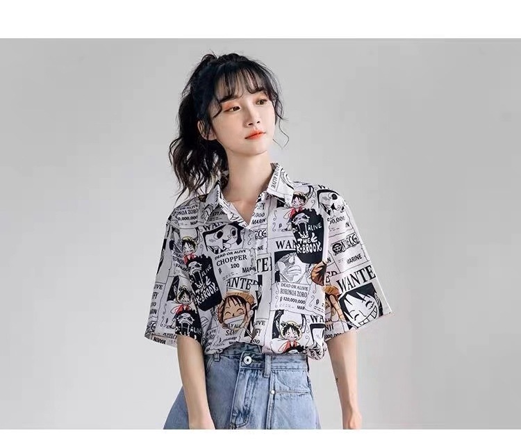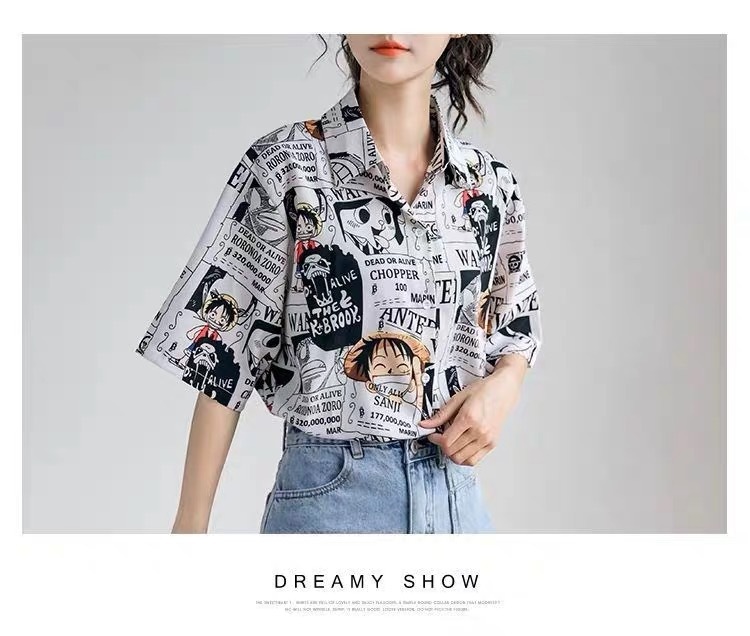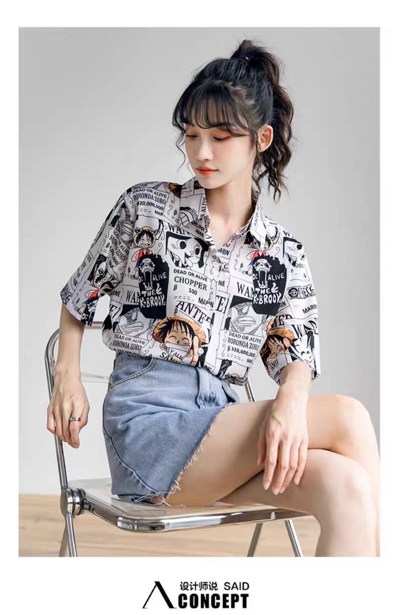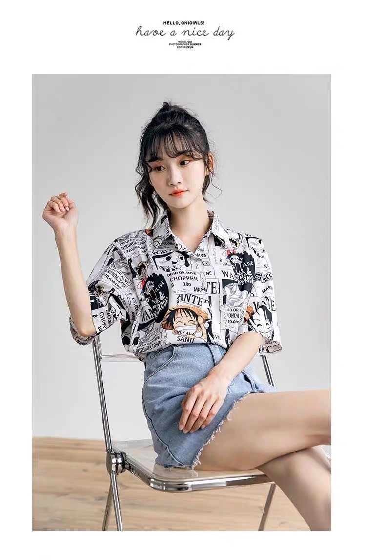 新款夏季薄款韩版宽松卡通印花上衣潮衬衫女设计感短袖清凉短袖出游服饰女装