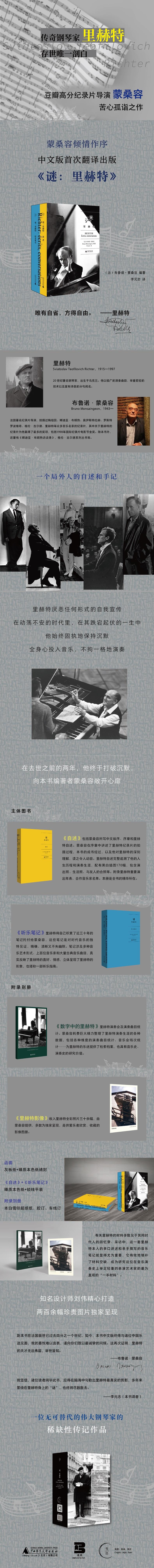 里赫特(Sviatoslav Richter,1915-1997)是20世纪著名钢琴家,出生于乌克兰。他以极广的演奏曲目、举重若轻的技术以及富有诗意的分句闻名。1995年,里赫特指定著名音乐纪录片导演布鲁诺·蒙桑容为其作传。在接下来的两年时间里,两人进行了多次对谈,他们之间的友谊与信任也与日俱增。这段交往的成果,除了获誉无数的里赫特纪录片之外,还有这本《谜:里赫特》。