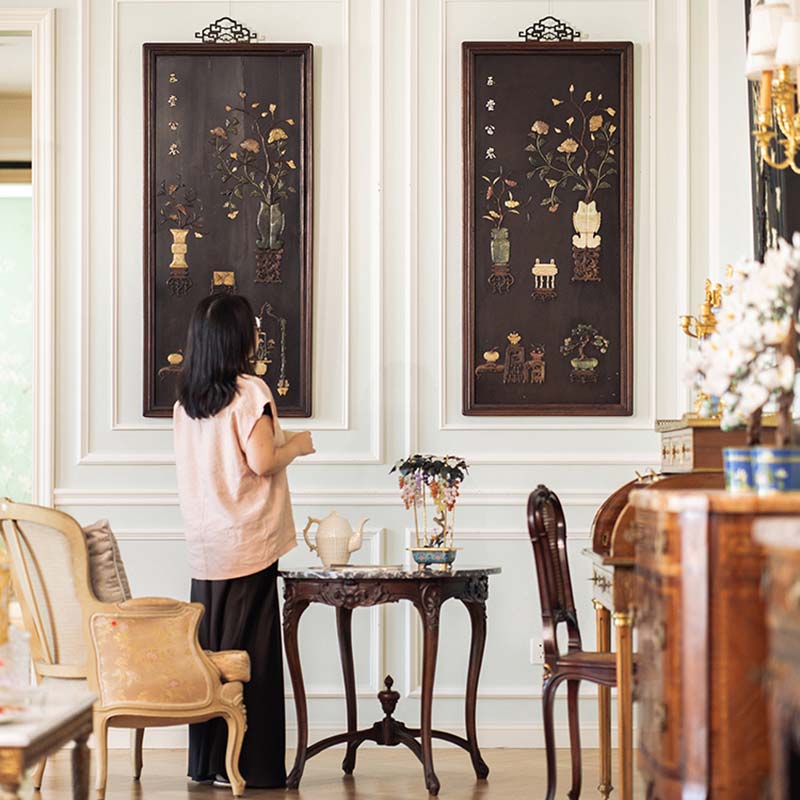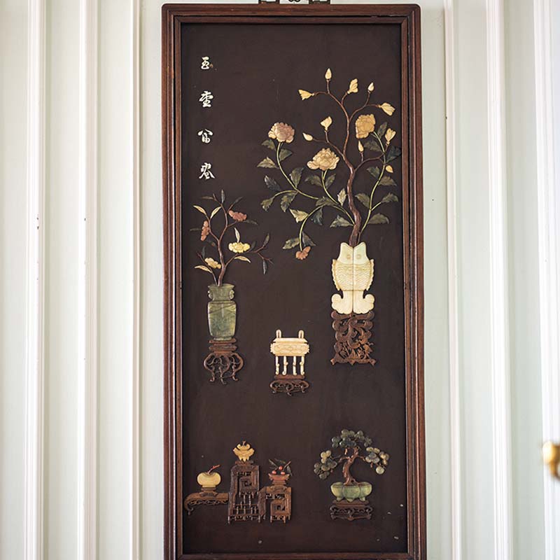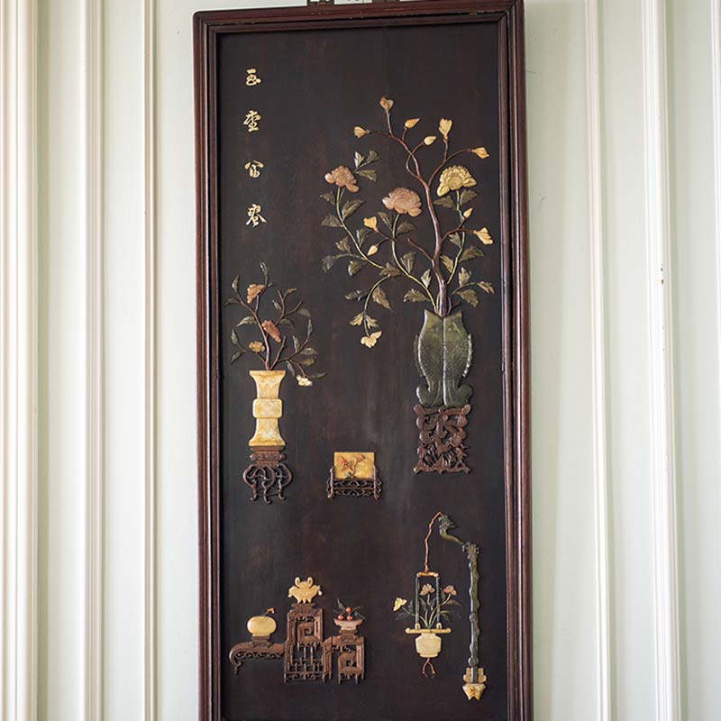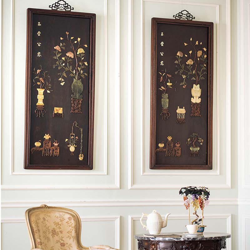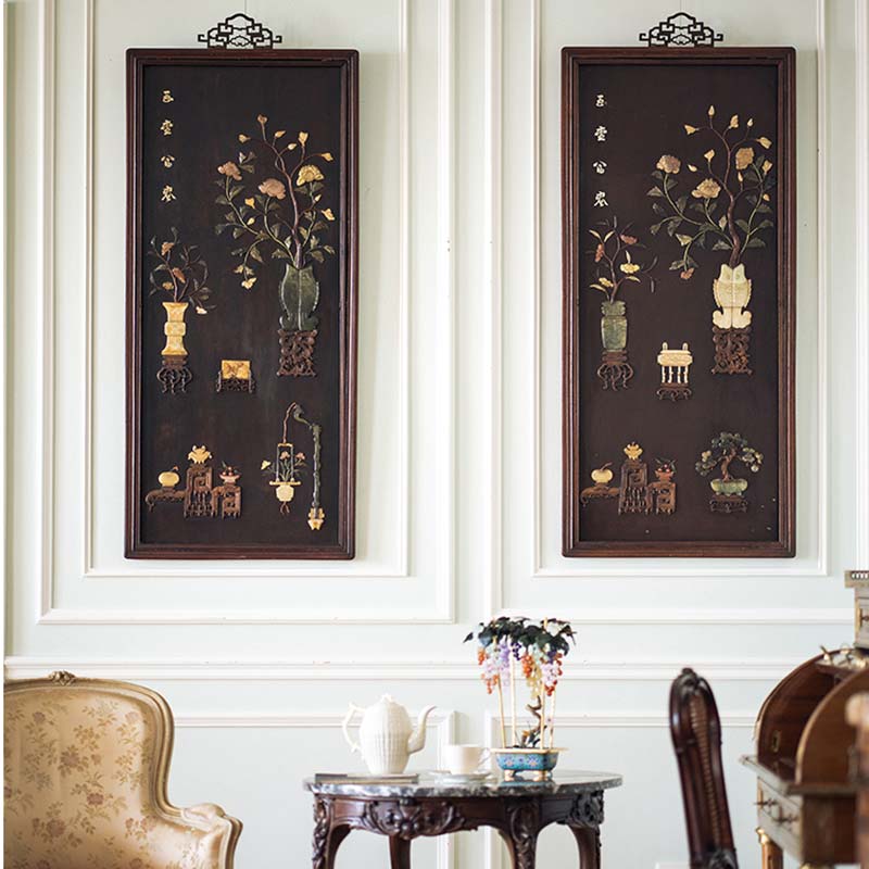 20世纪初中国出品博古清供主题木胎百宝嵌挂屏一对