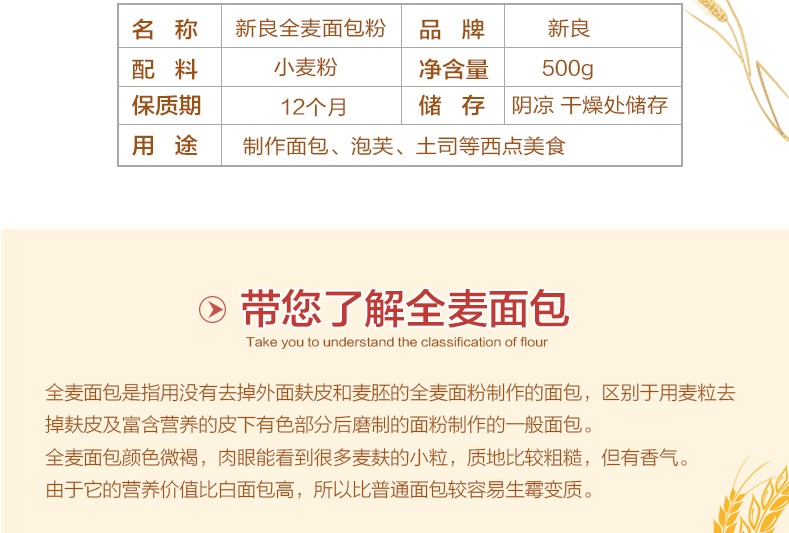 新良全麦面包粉 500g 全麦面粉面包面粉 高筋面粉