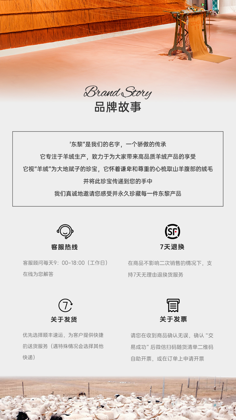 东黎羊绒是赤峰东荣集团自主品牌,自有牧场/羊绒制品全产业链优势,实现了羊绒从“牧场”到“商场”的华丽转变。