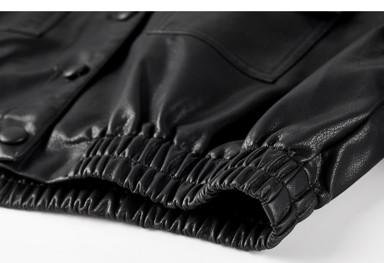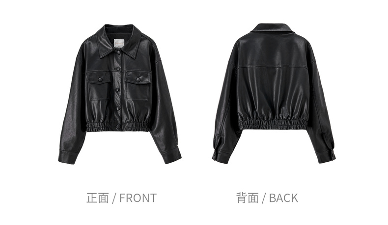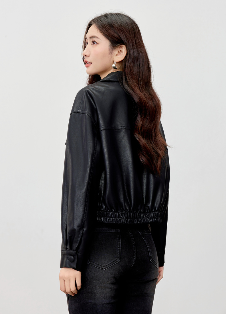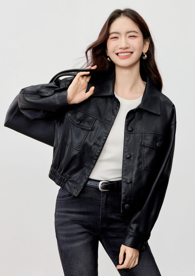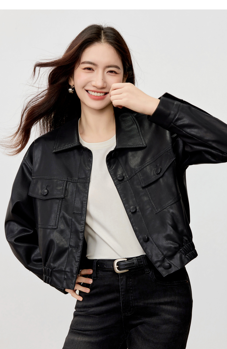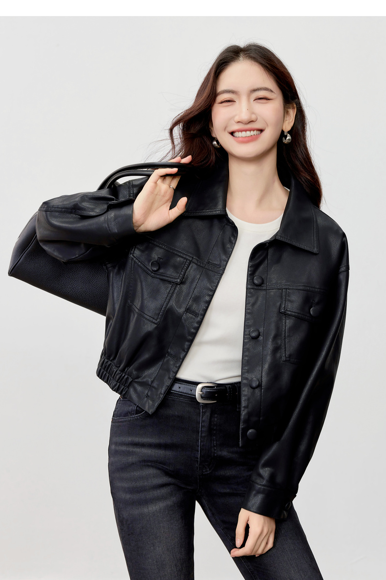 【内购】【再生纤维素】摩登通勤单排扣松紧下摆宽松显瘦PU机车皮衣外套-W53GA2744