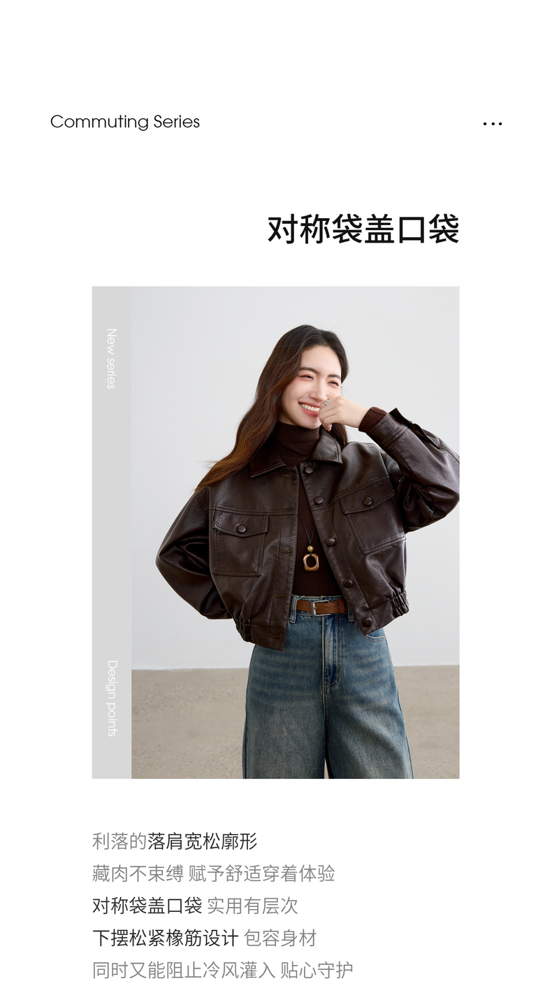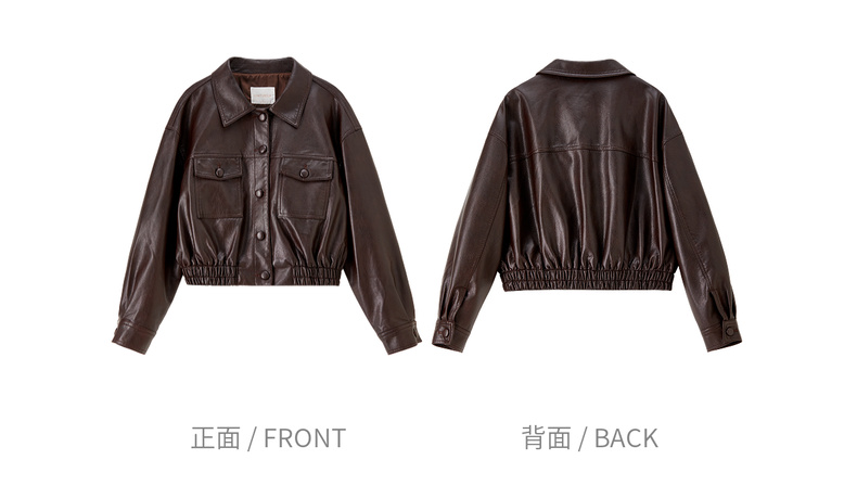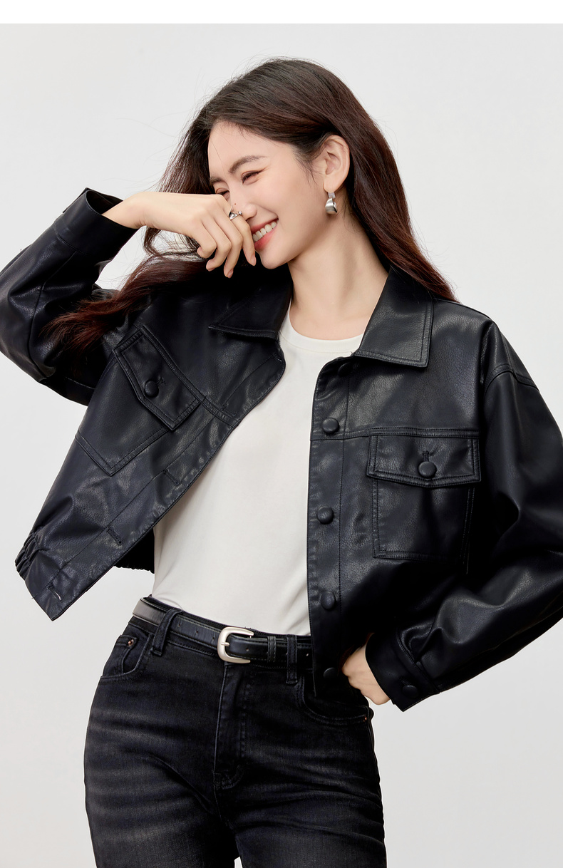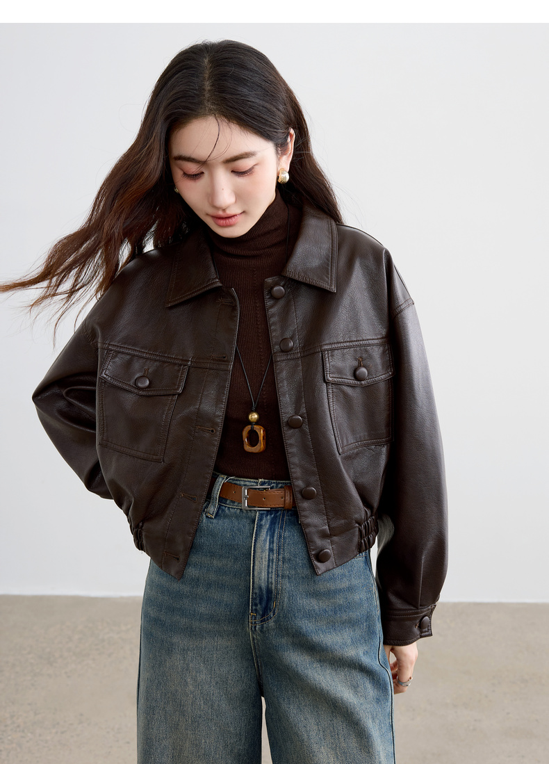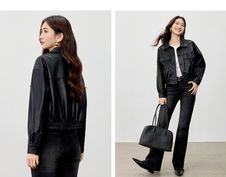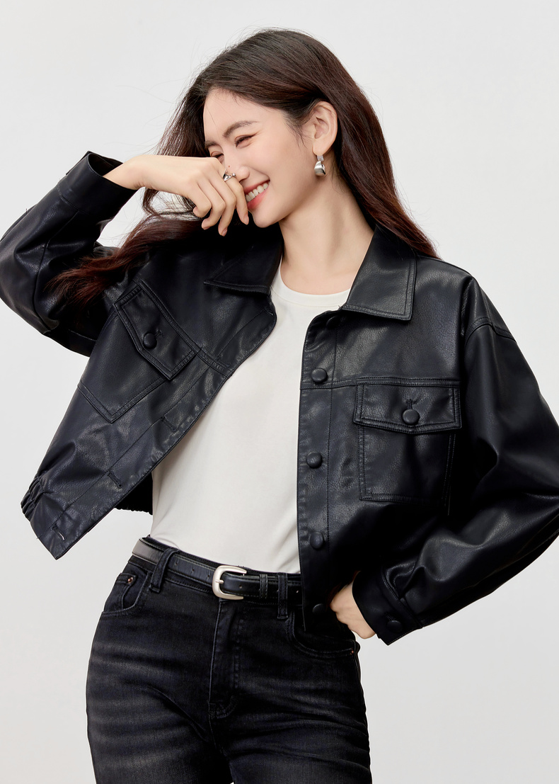 【内购】【再生纤维素】摩登通勤单排扣松紧下摆宽松显瘦PU机车皮衣外套-W53GA2744