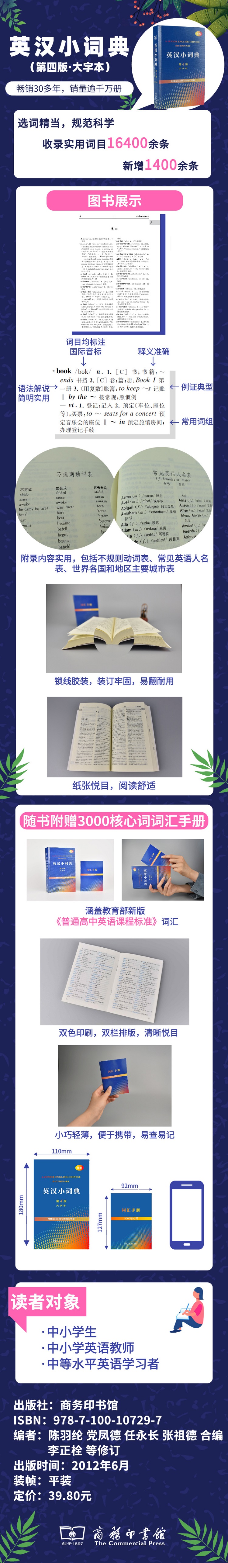 《英汉小词典》畅销30余年,历经3次修订,累计销量逾千万册,深受中小学师生和广大英语学习者喜爱。