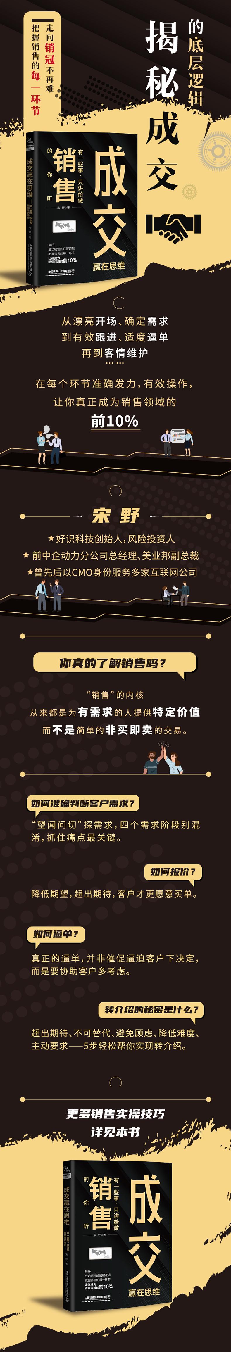 《成交赢在思维:有一些事,只讲给做销售的你听》囊括了一名销售人员从认知、开场、探寻需求、处理异议、跟进逼单、转介绍、自我总结与赋能七个阶段的误区、技巧与心得,通过浅显易懂的沟通之道、举一反三的案例回放,让你学会四两拨千斤地去思考,可能辞藻并不优美,篇幅也很有限,但只要你认真去看、去理解,相信它能让你的销售工作更加游刃有余。