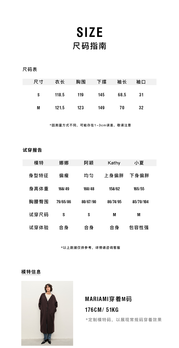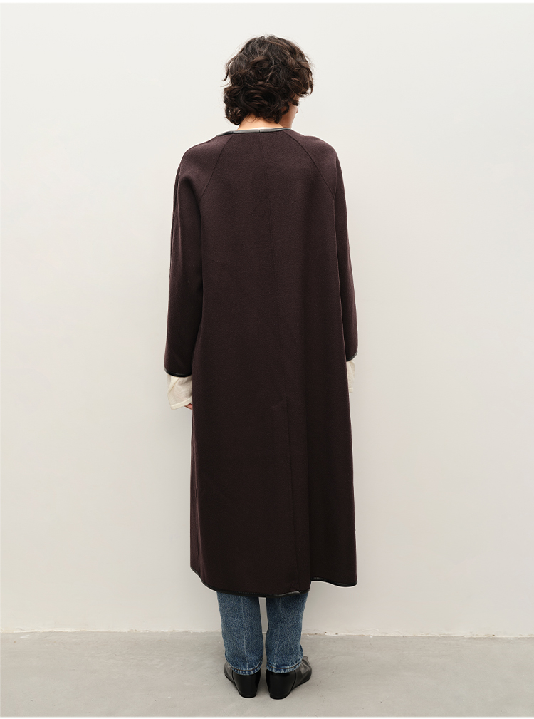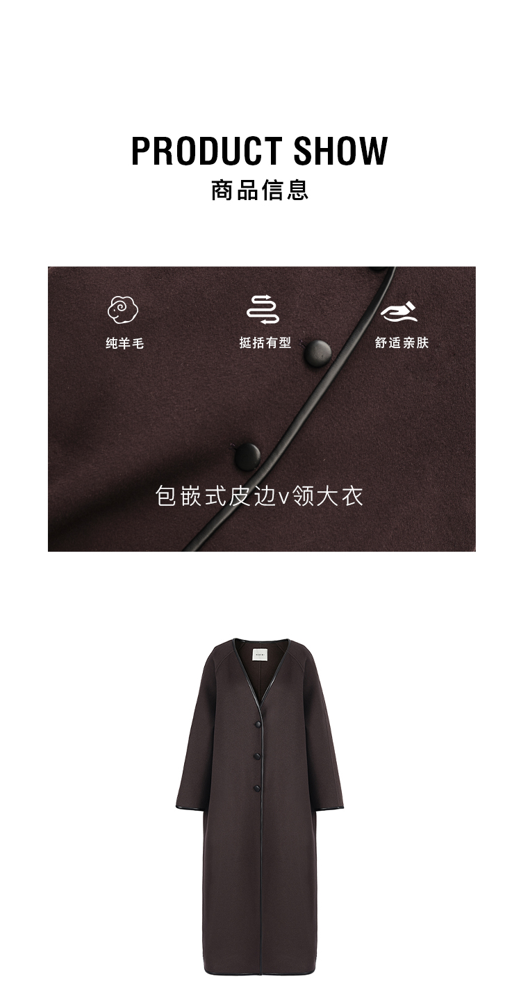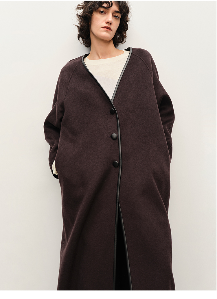 HIDEMI 简约设计感包嵌式皮边v领长款廓形美利奴羊毛双面呢大衣
