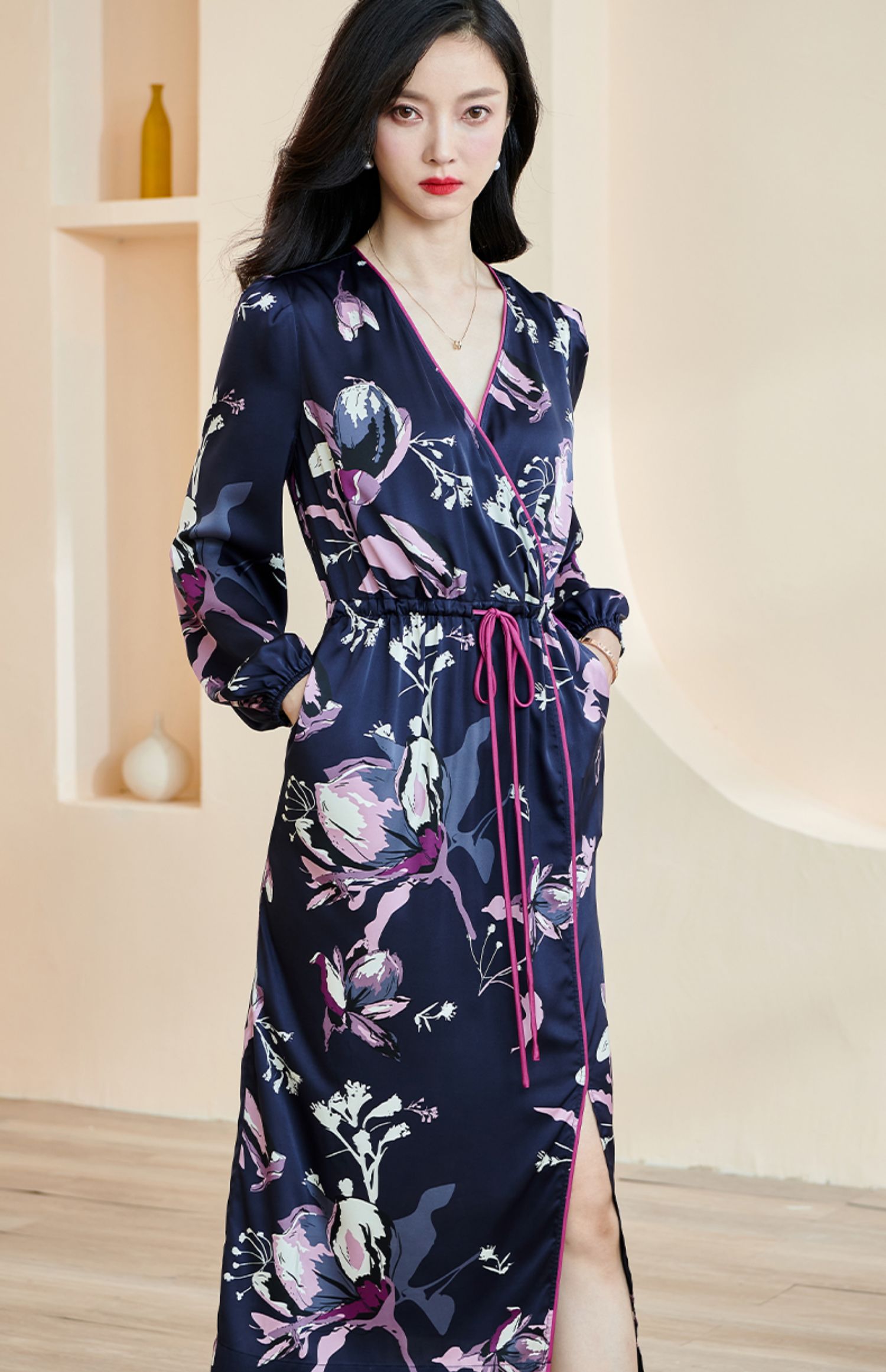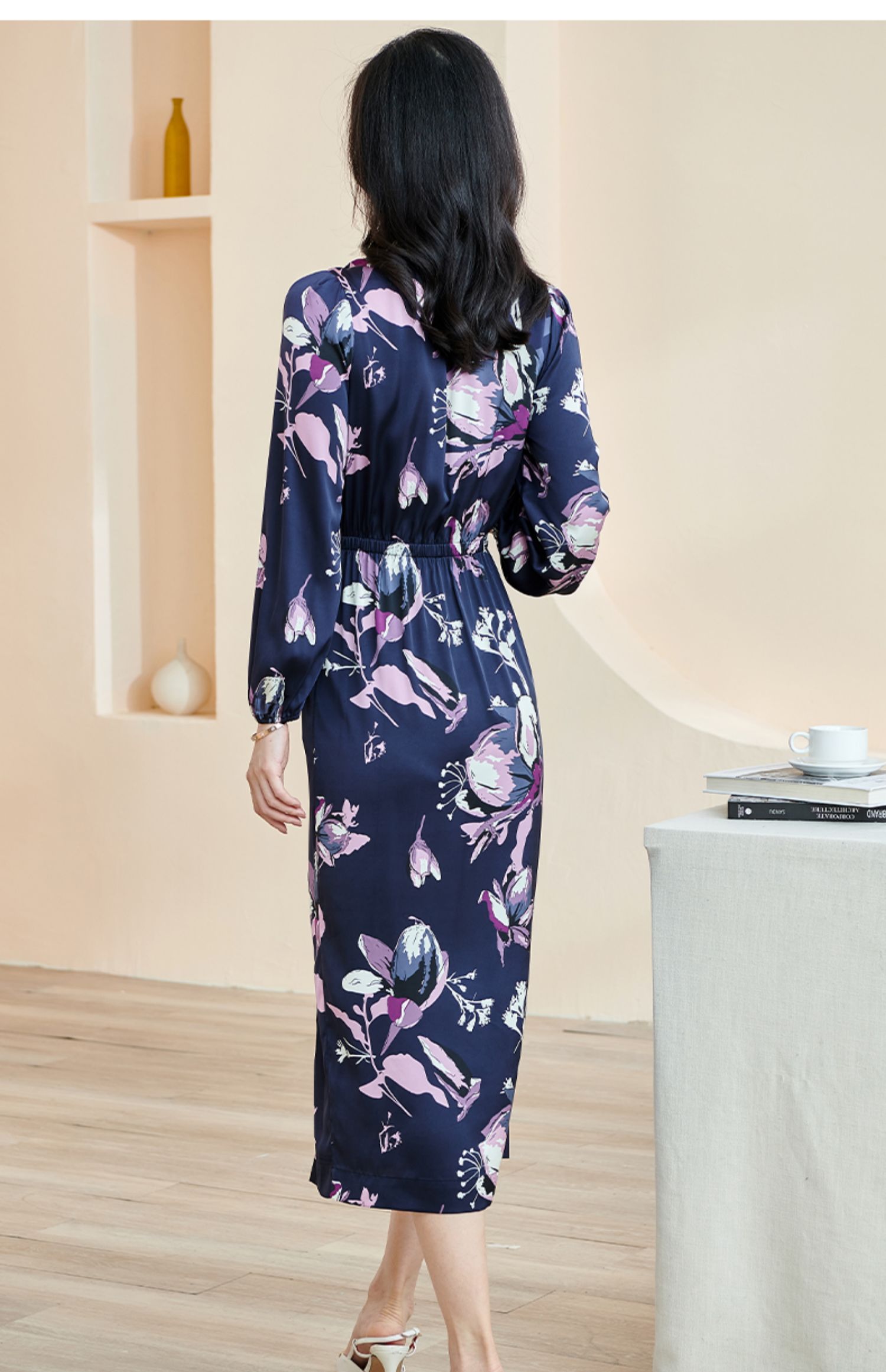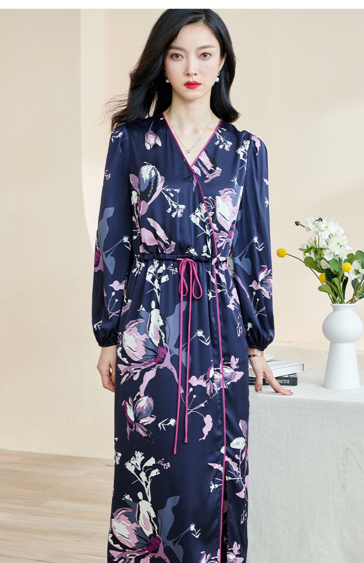 剩S/M 米思阳2024秋季新款知性优雅大花连衣裙垂感大摆收腰中长裙子2231