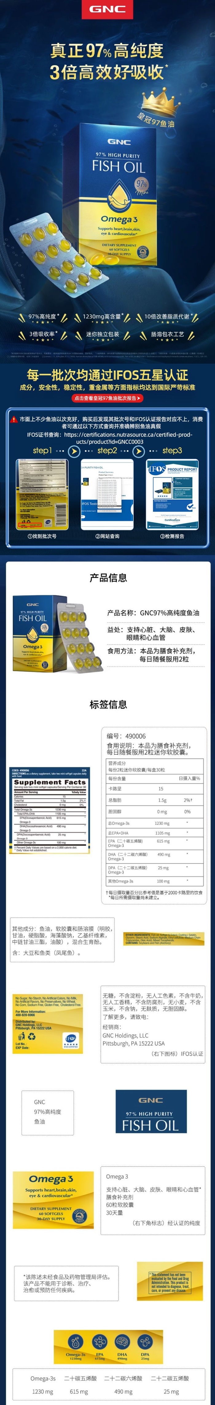 【保税仓】健安喜GNC97%高纯度鱼油软胶囊60粒/盒(胶囊)