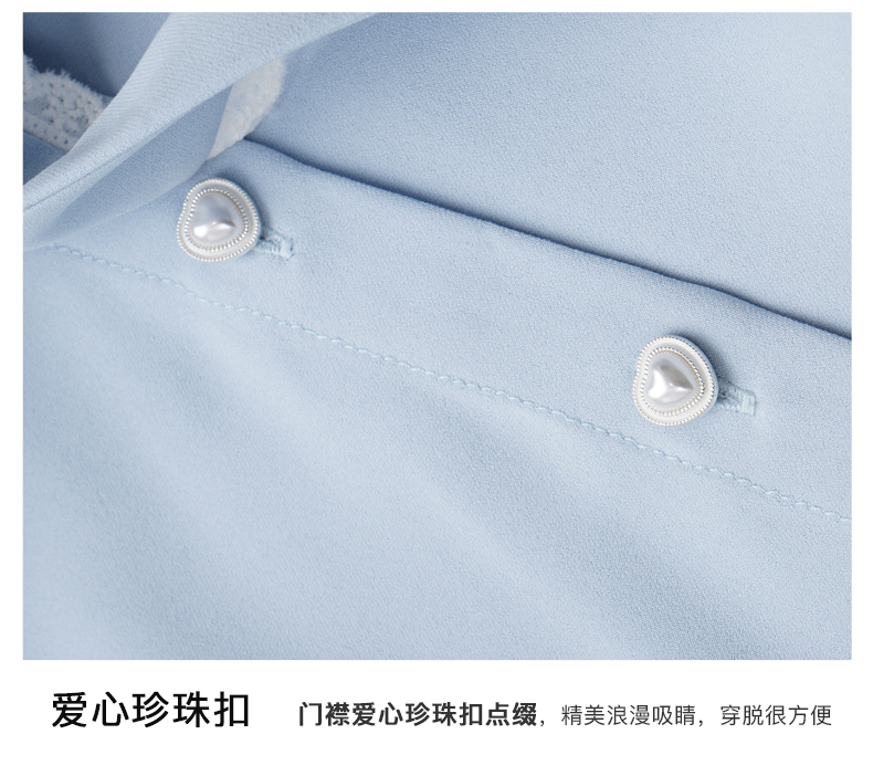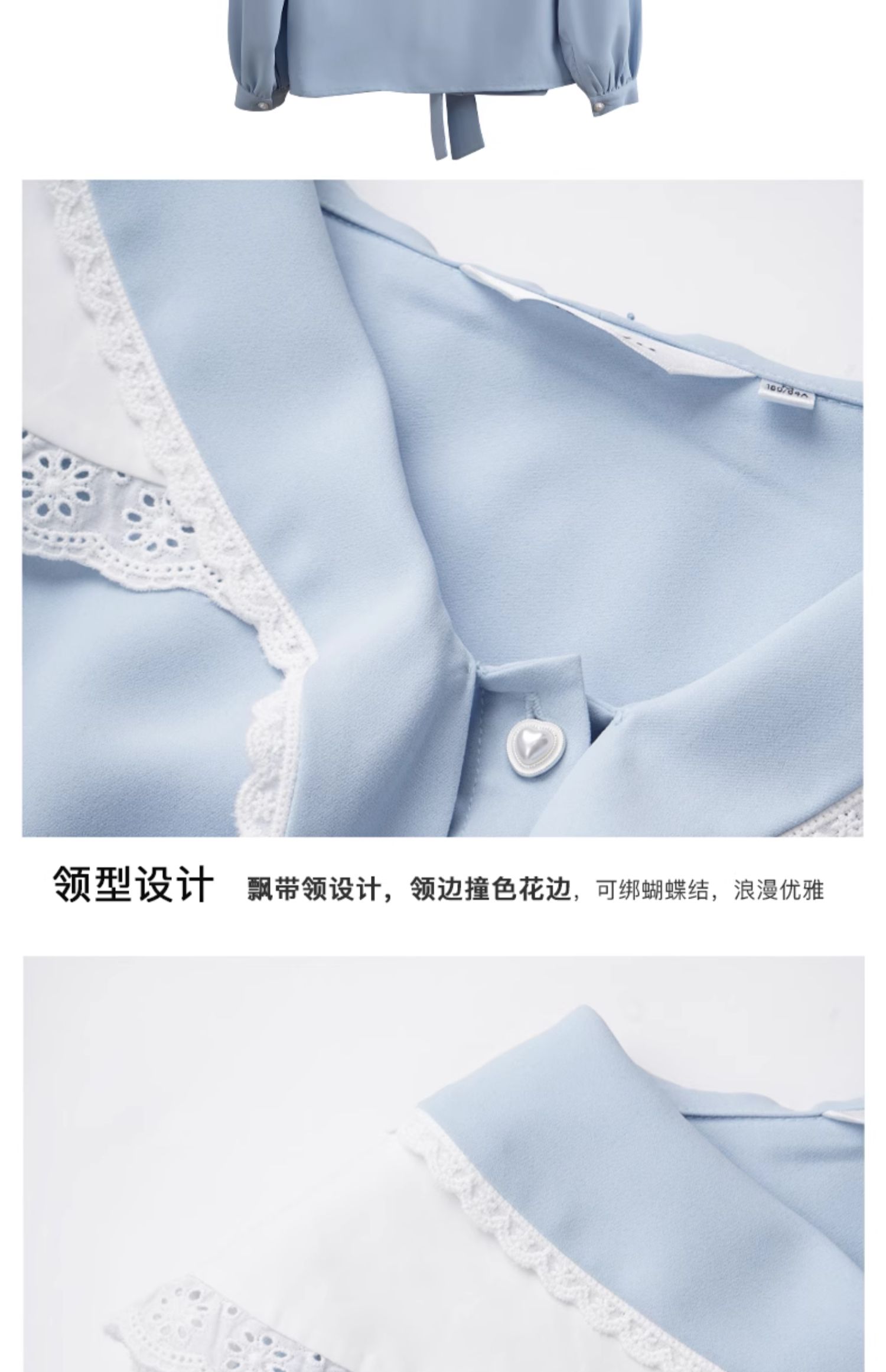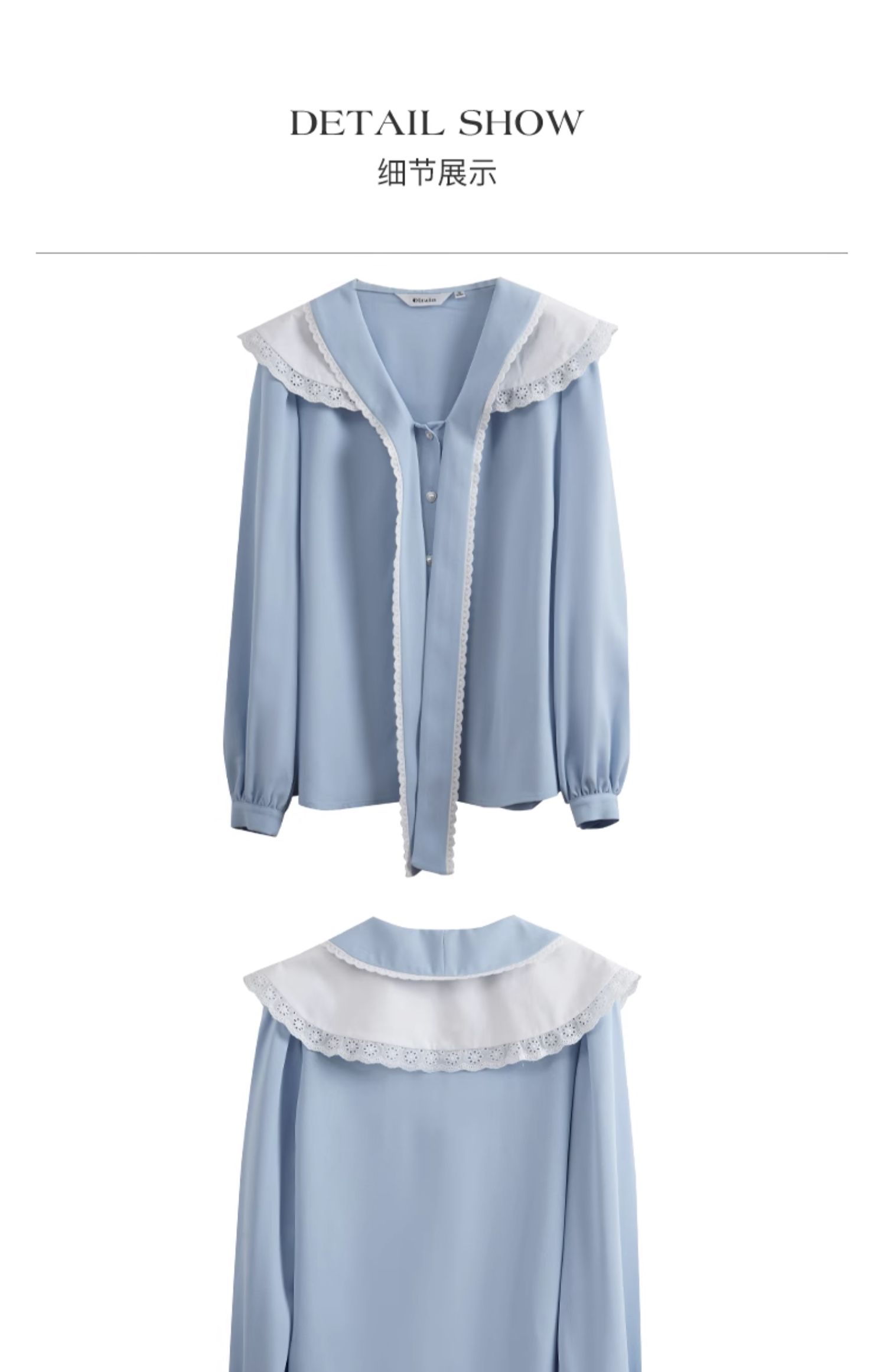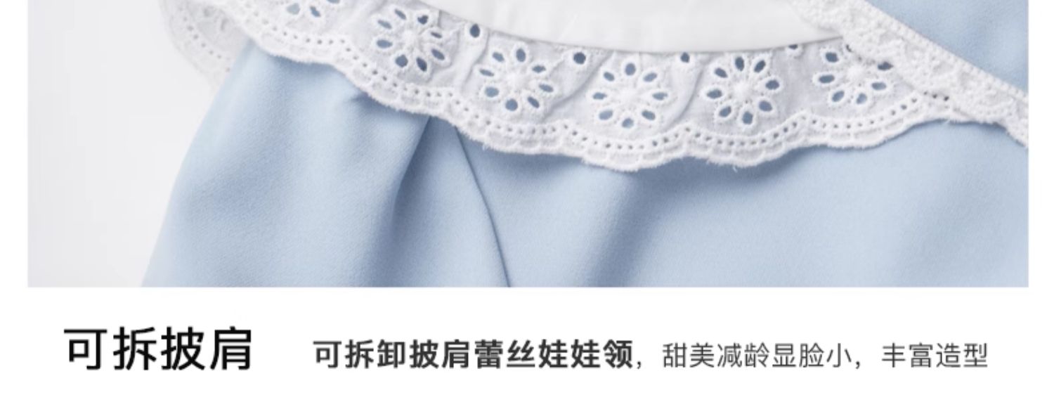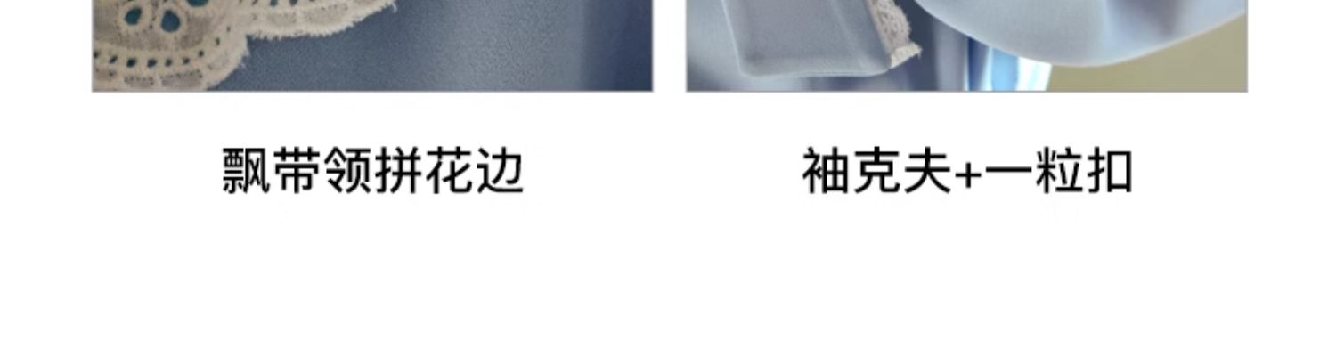 OLrain欧芮儿法式蓝色雪纺衫女早春2024新款蕾丝荷叶领小个子衬衫