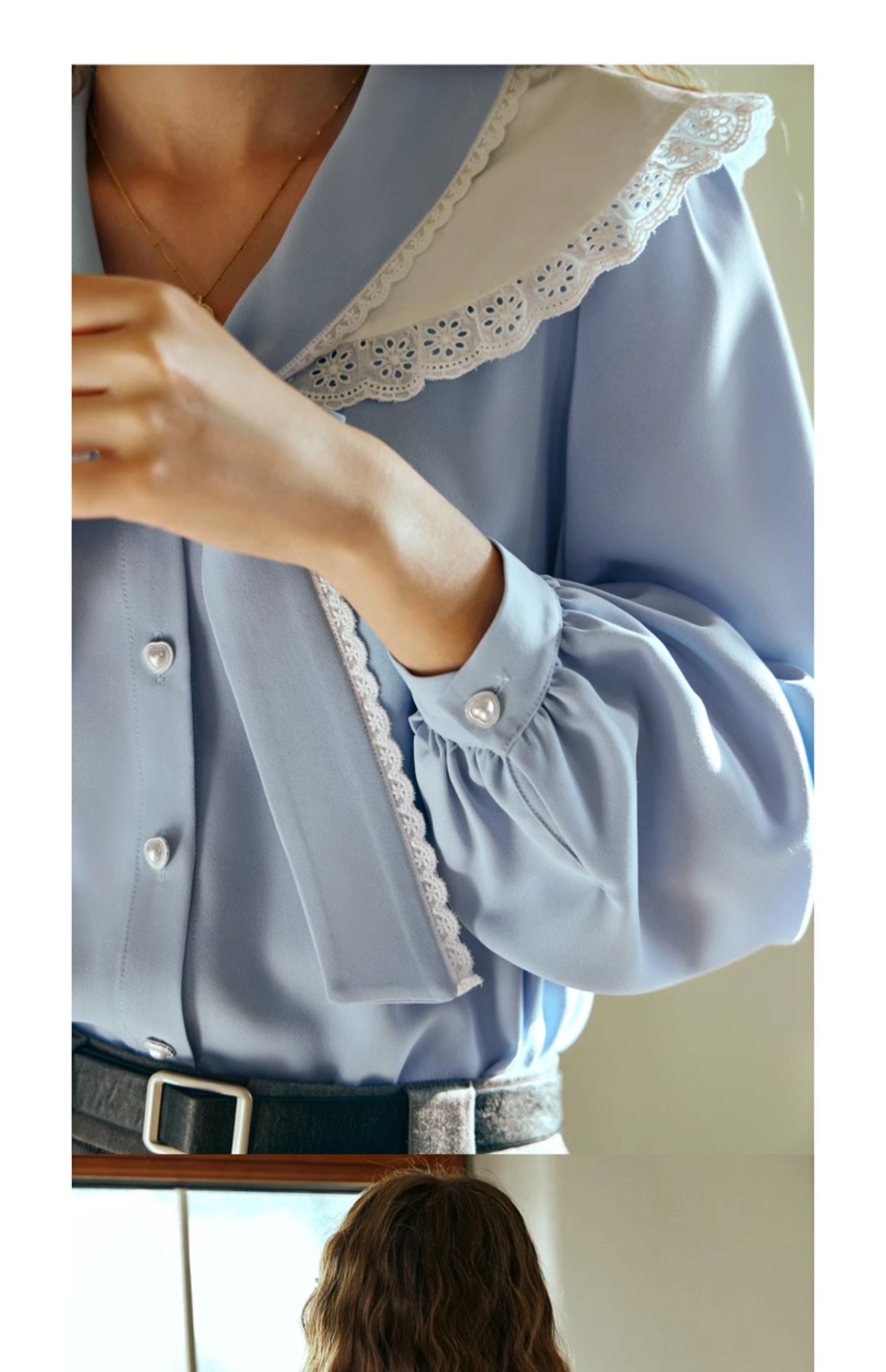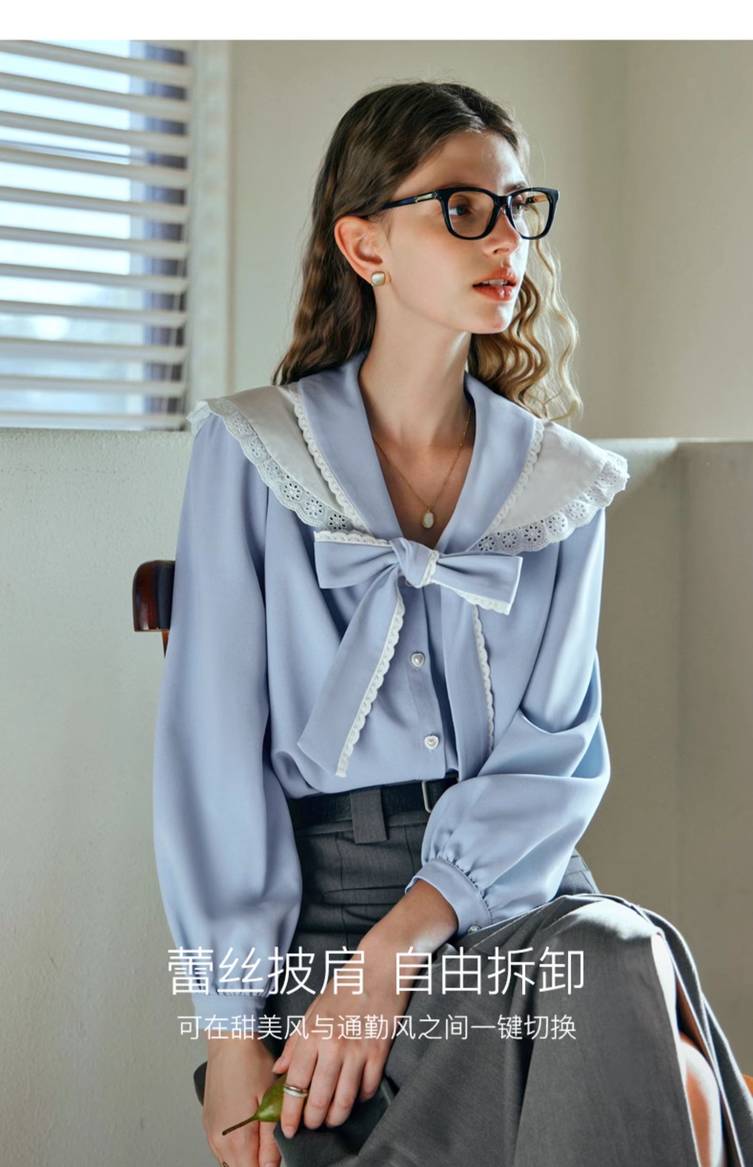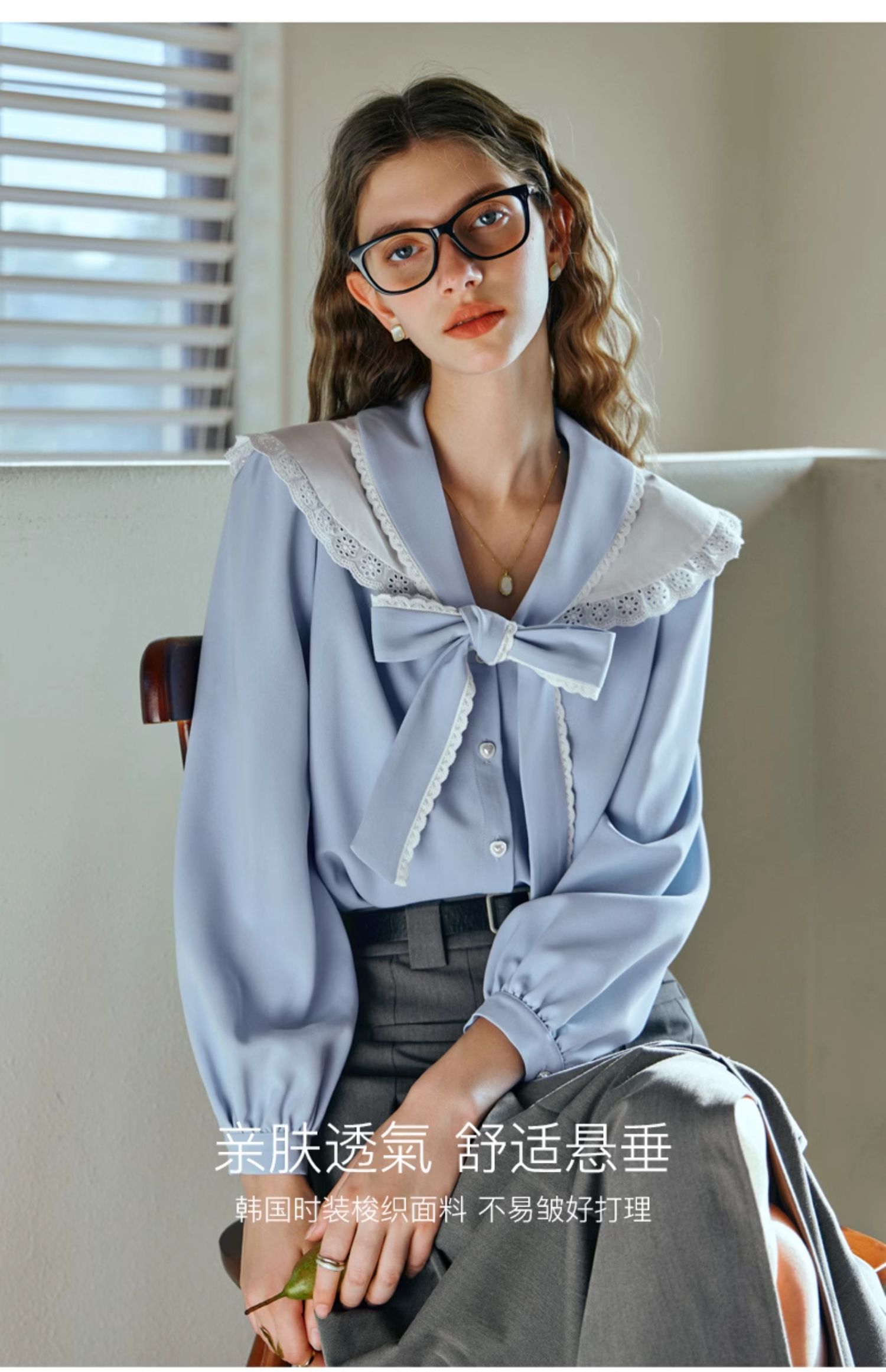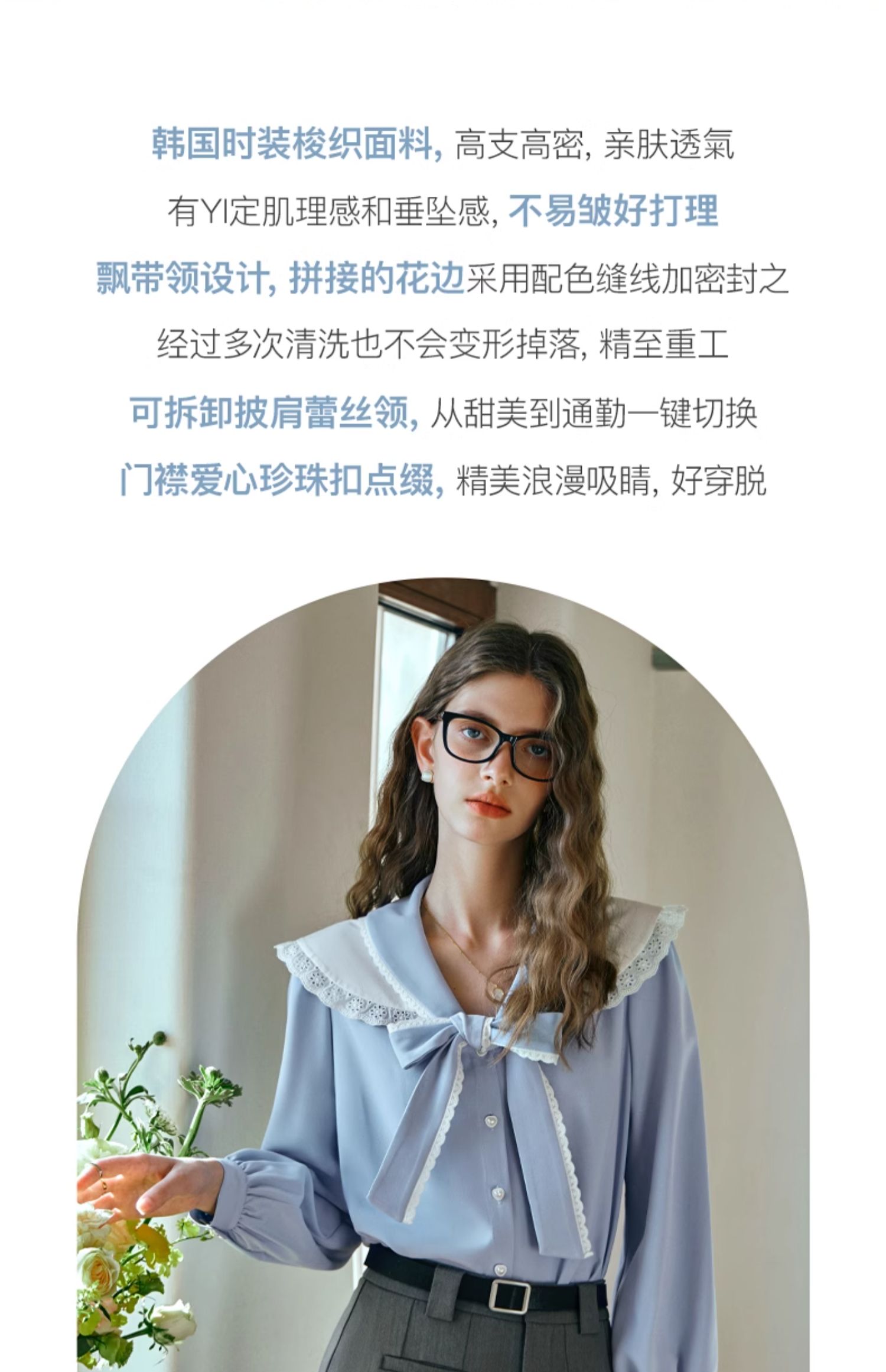OLrain欧芮儿法式蓝色雪纺衫女早春2024新款蕾丝荷叶领小个子衬衫