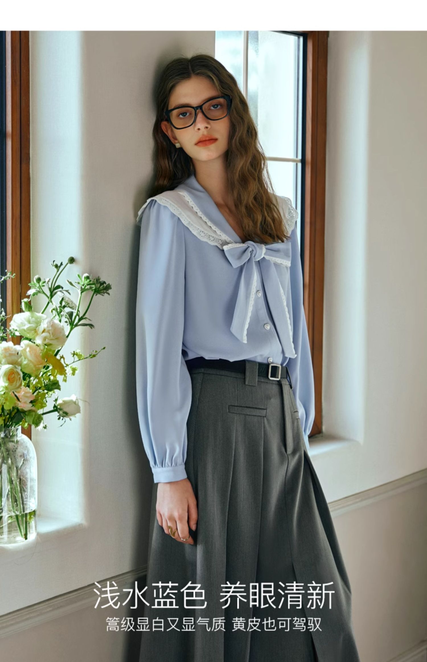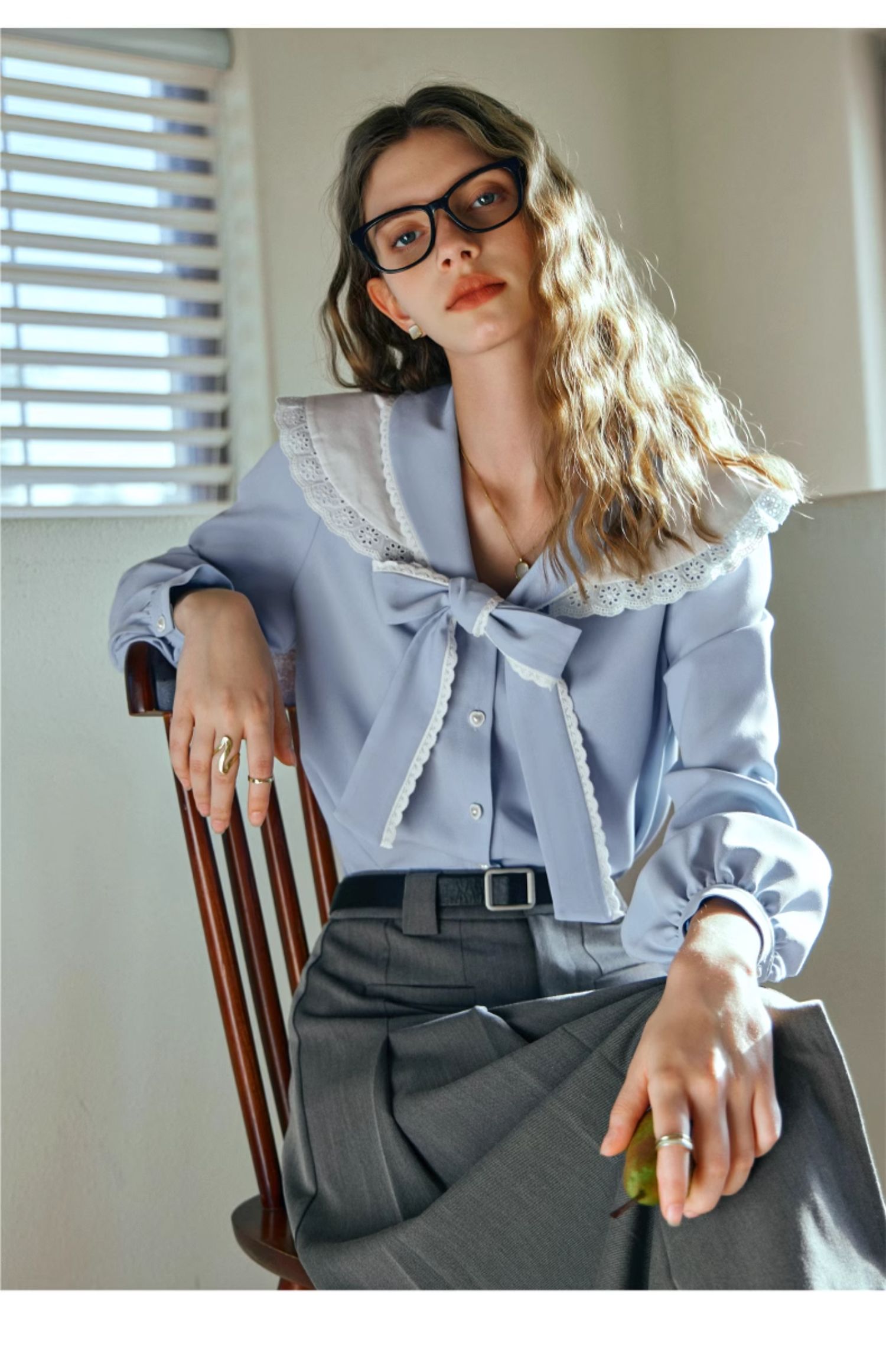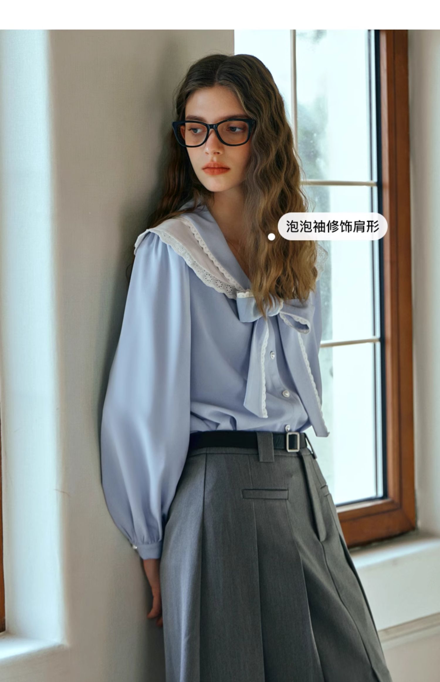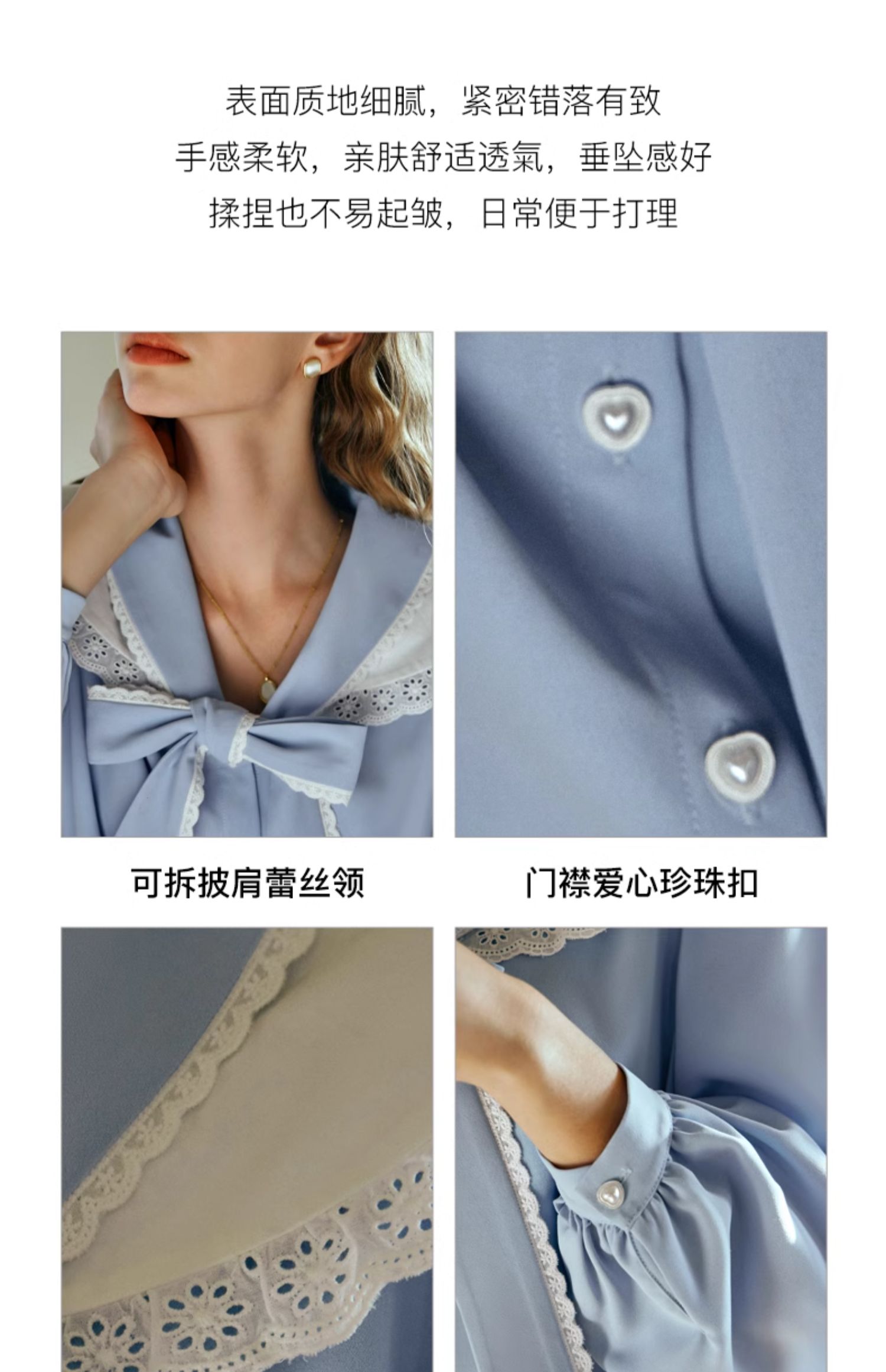 OLrain欧芮儿法式蓝色雪纺衫女早春2024新款蕾丝荷叶领小个子衬衫