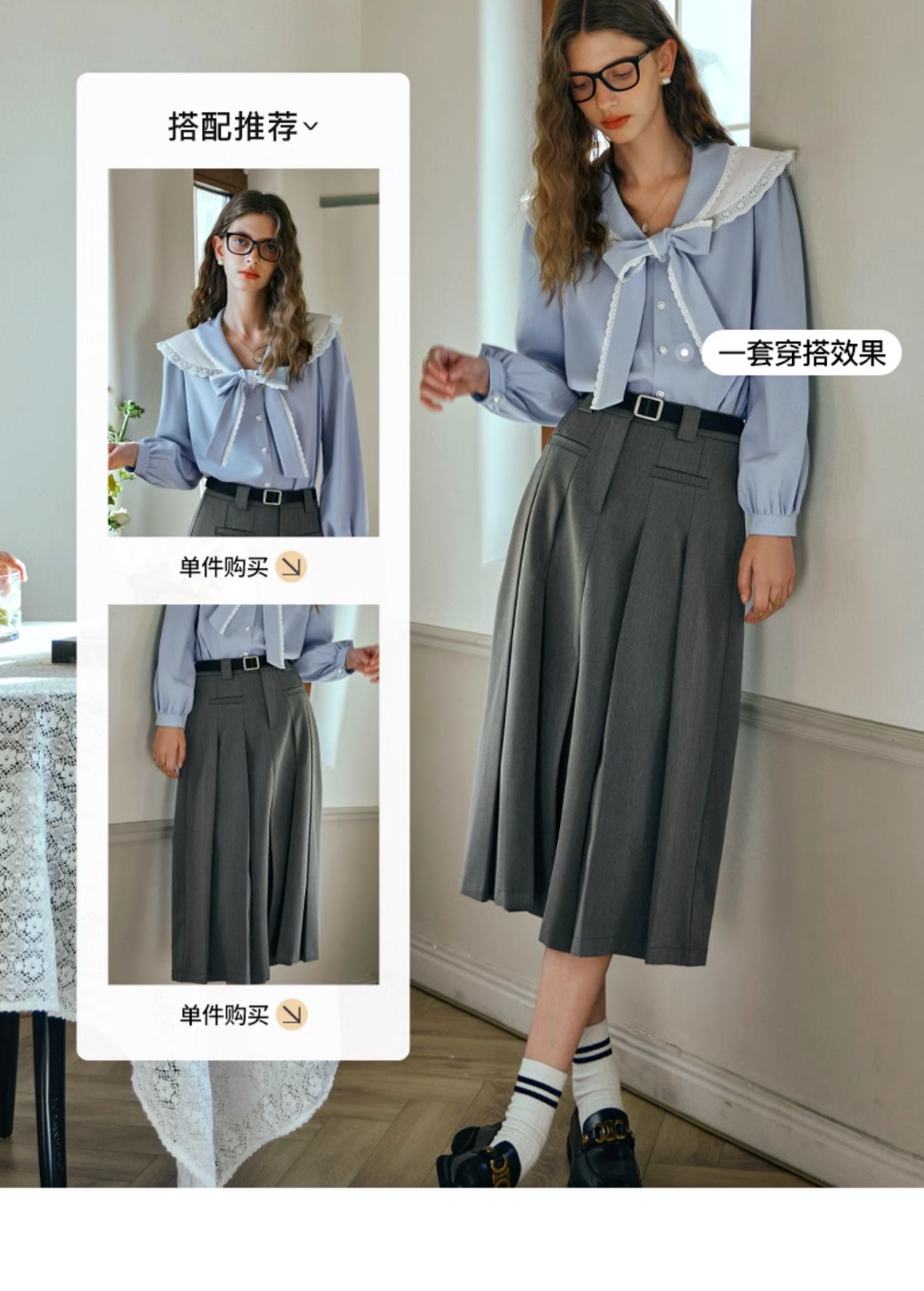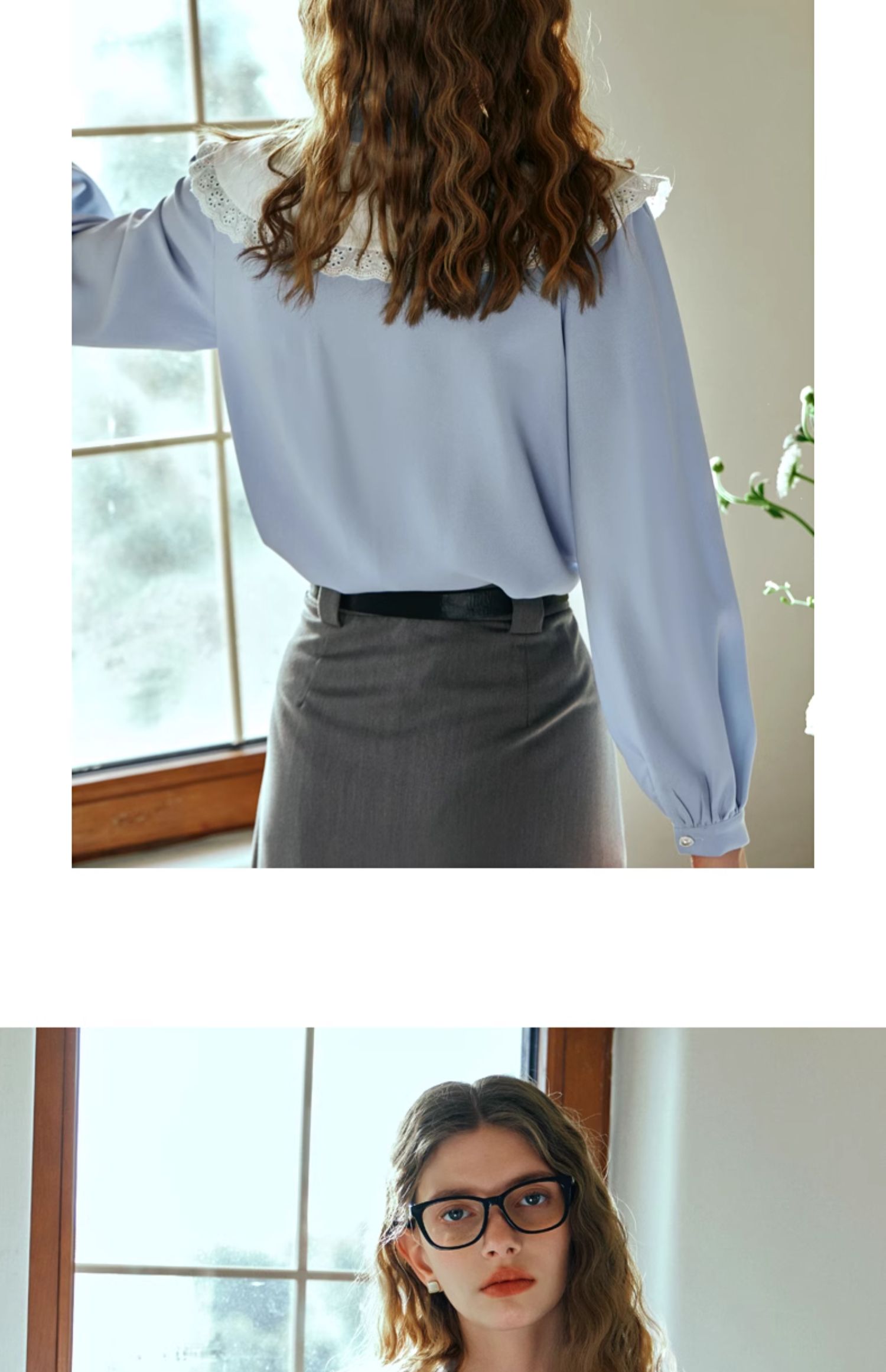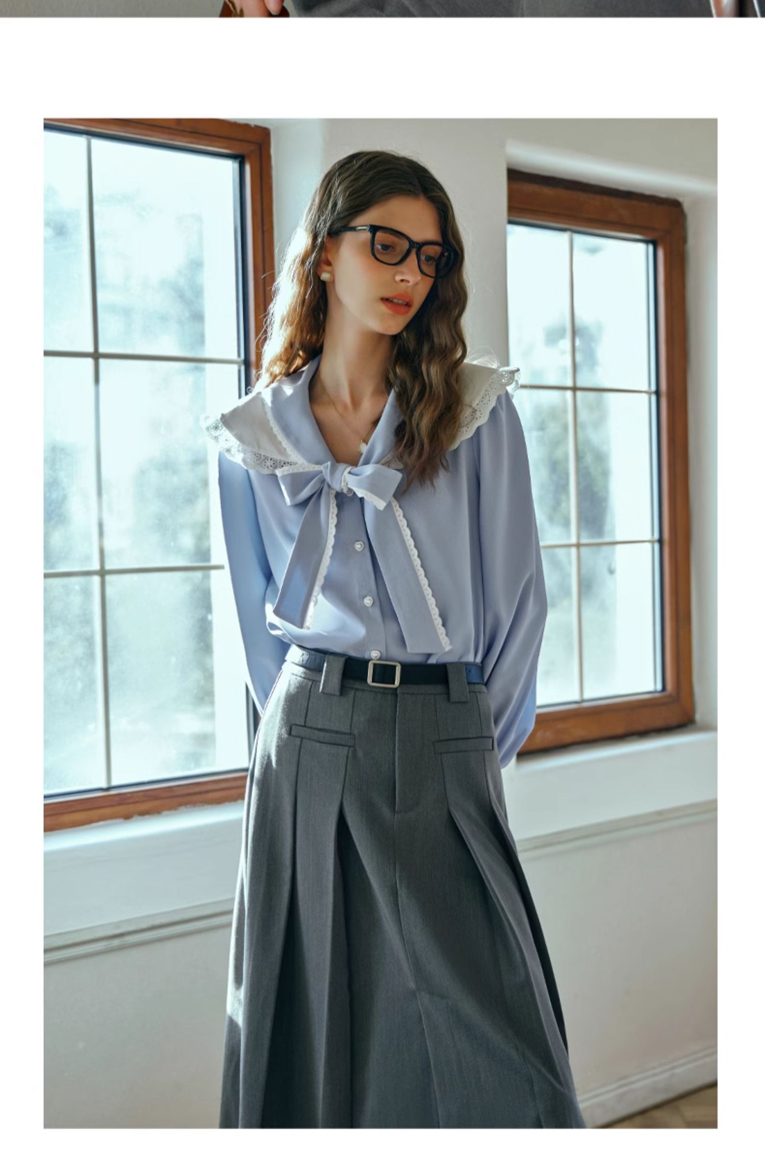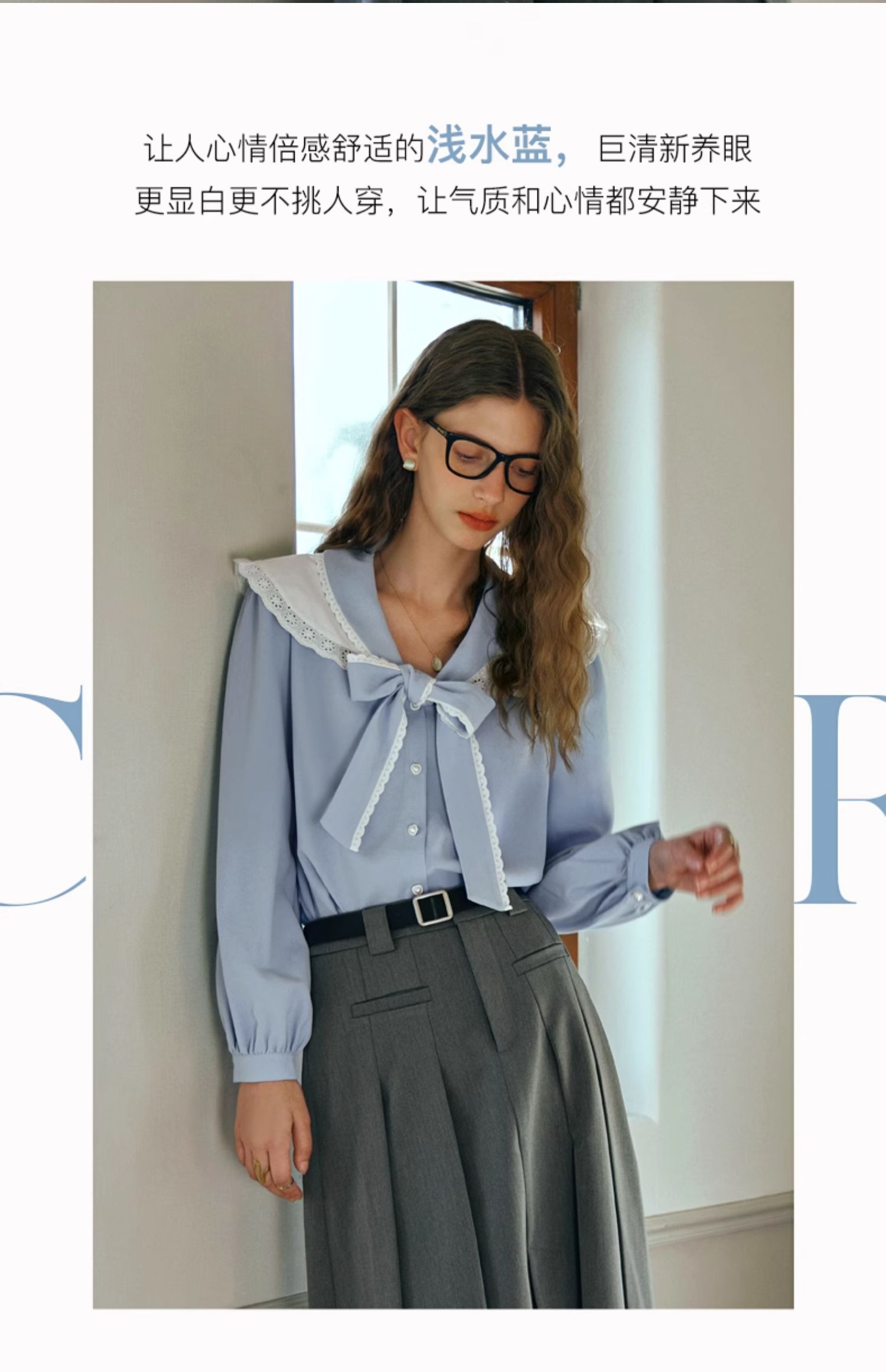 OLrain欧芮儿法式蓝色雪纺衫女早春2024新款蕾丝荷叶领小个子衬衫