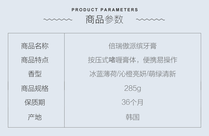 【海关保税直发】韩国/倍瑞傲派缤牙膏285g(冰蓝薄荷/沁橙亮妍/萌绿清新)-会员5折