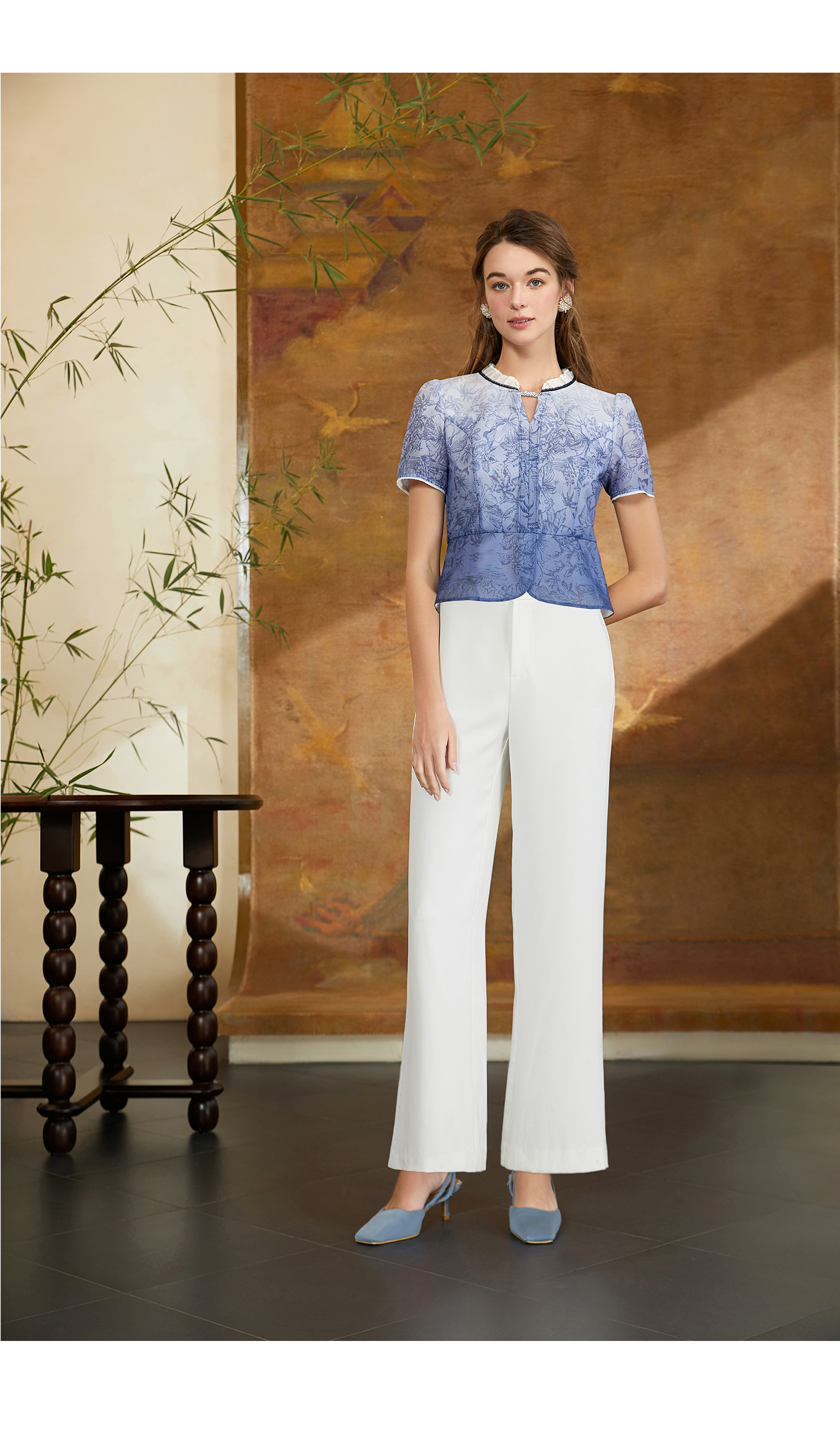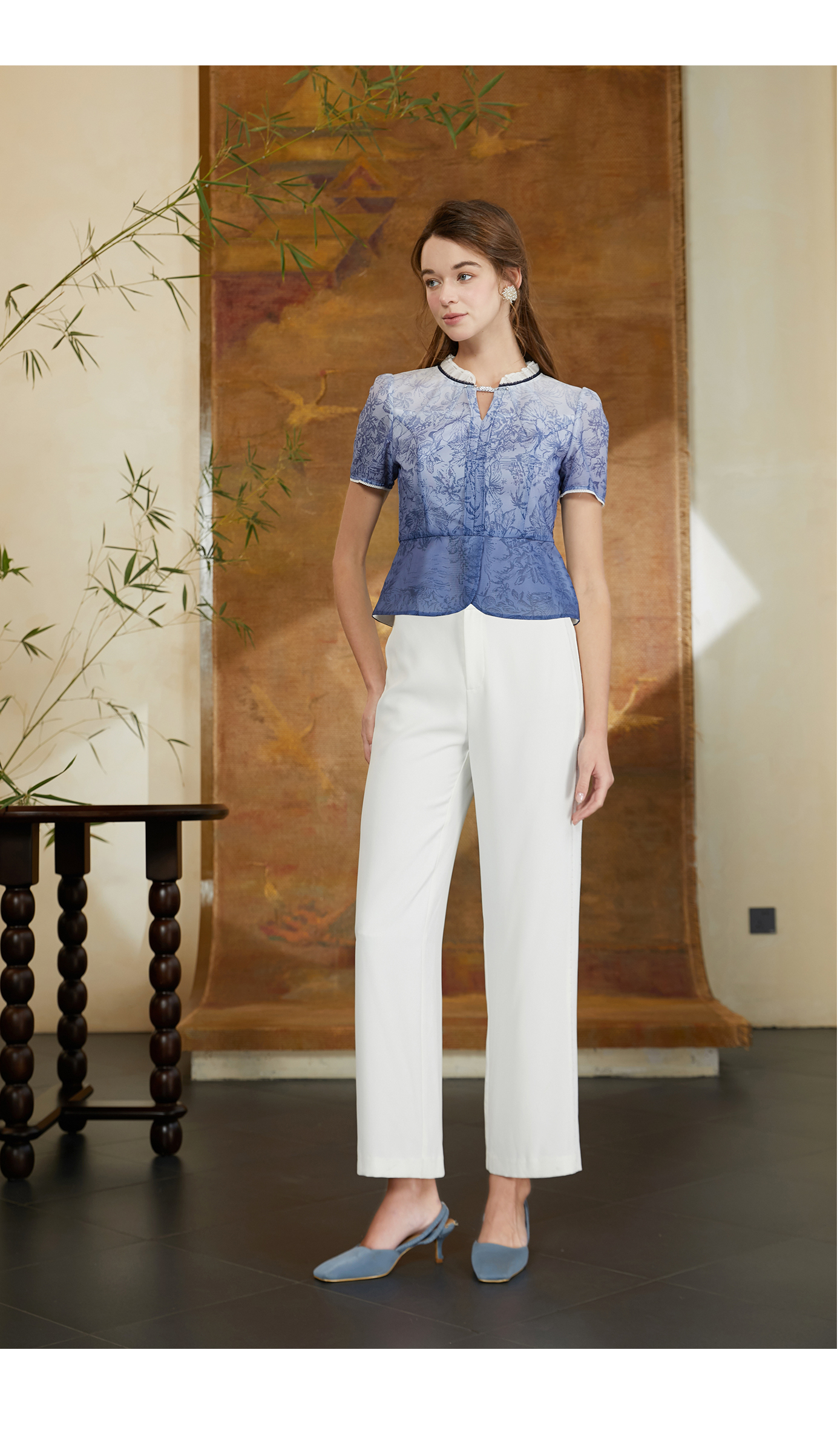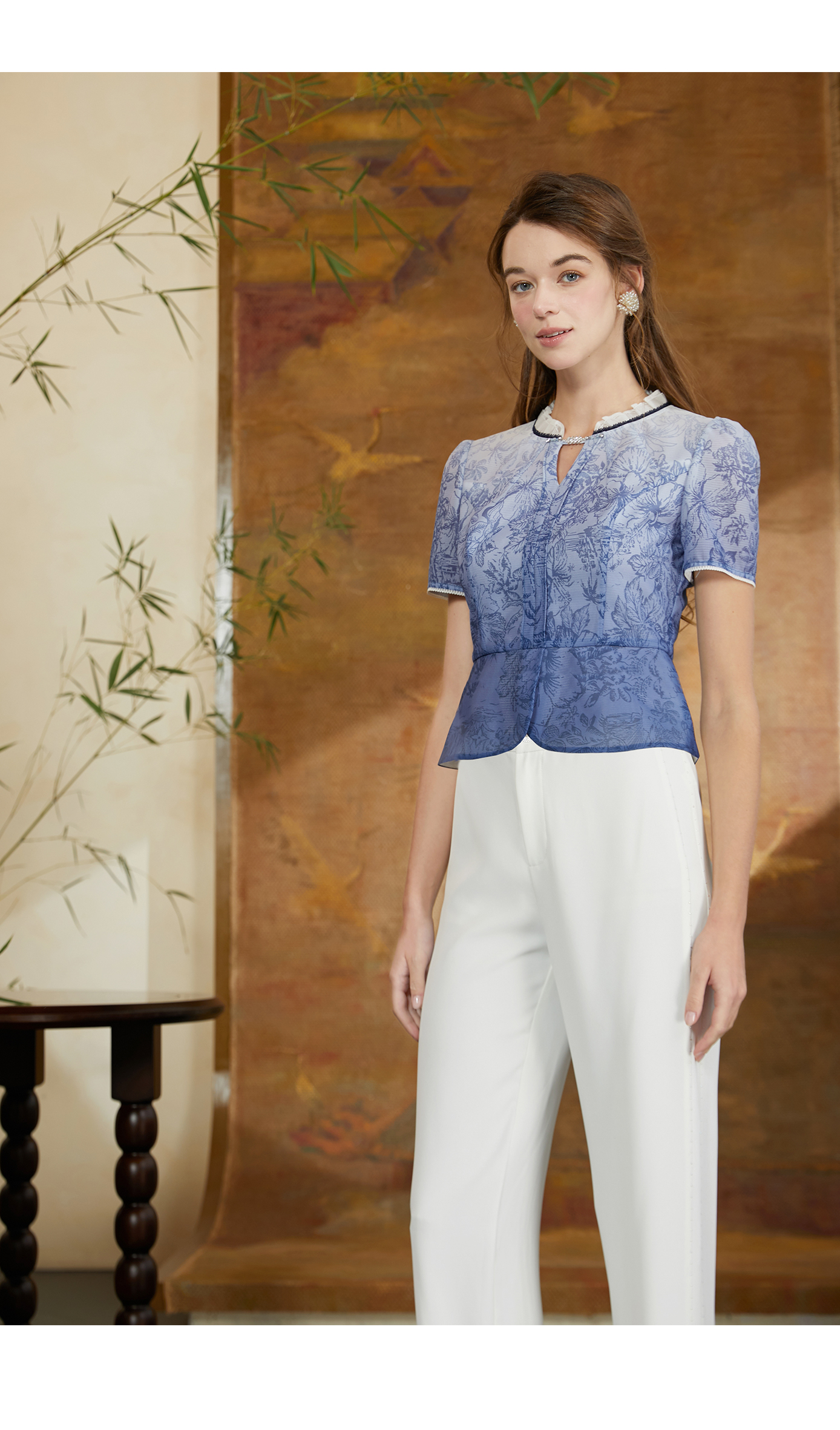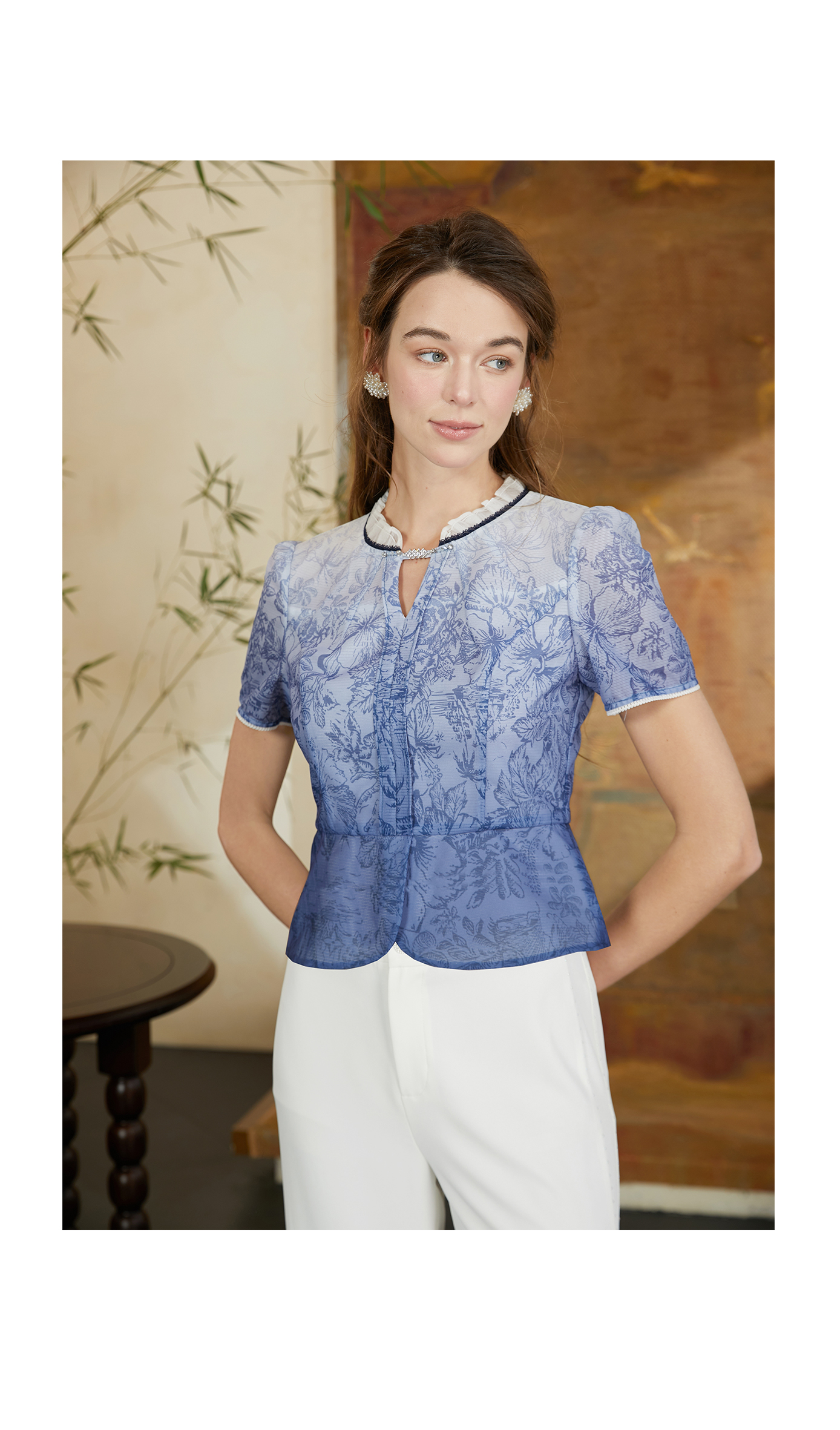 EIIR司歌修身泡泡袖V领扣扭衬衫端庄气质上衣ET881350