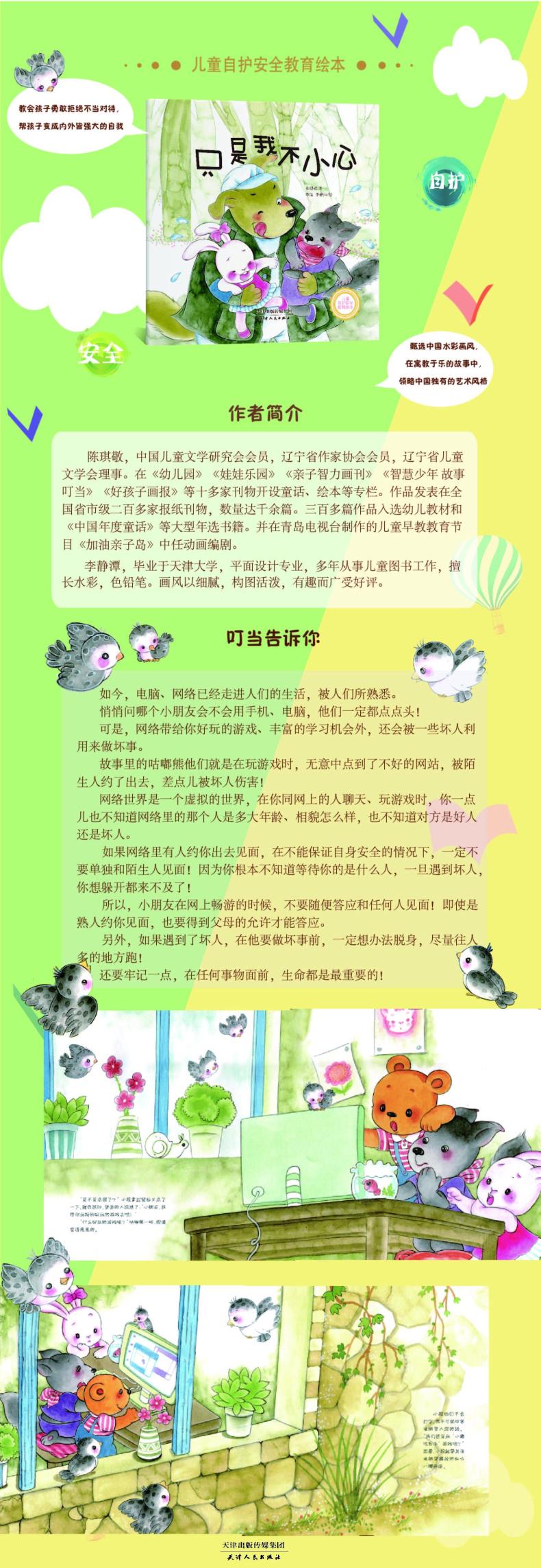 本书是一本儿童自护安全教育绘本。讲述了这样一个故事:小狼家买了新电脑,他叫来长耳兔和咕噜熊一起打游戏。他们正在玩一款名叫“小猪吃西瓜”的游戏,突然画面中出现了陌生人说话的声音,约他们去巴拉巴拉广场,玩一个特别特别好玩的游戏。咕嘟熊也不等小狼和长耳兔,自己先跑了过去。小狼和长耳兔赶到时发现一个陌生的叔叔正对着咕噜熊动手动脚,他们便大喊起来,坏人被吓跑了。本书告诫小朋友不要随意去见陌生人,听信他们的花言巧语,更不要让他们随便触碰自己的身体,遇到特殊情况则要大声呼救以摆脱危险。