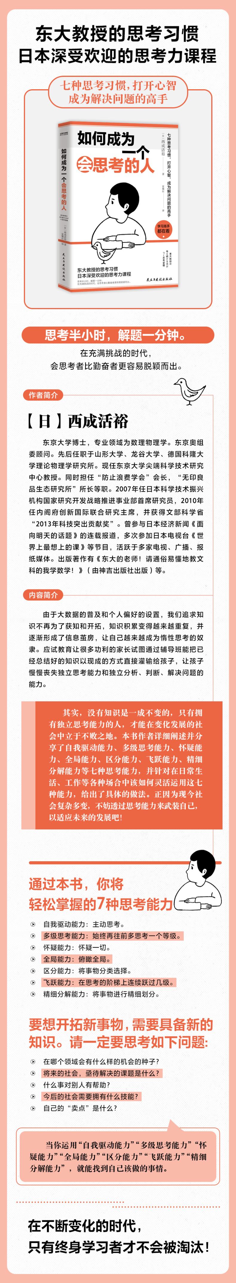 由于大数据的普及和个人偏好的设置,我们追求知识不再为了获知和开拓,知识积累变得越来越重复,并逐渐形成了信息茧房,让自己越来越成为惰性思考的奴隶。应试教育让很多功利的家长试图通过辅导班能把已经总结好的知识以现成的方式直接灌输给孩子,让孩子慢慢丧失独立思考能力和独立分析、判断、解决问题的能力。其实,没有知识是一成不变的,只有拥有独立思考能力的人,才能在变化发展的社会中立于不败之地。本书作者详细阐述并分享了自我驱动能力、多级思考能力、怀疑能力、全局能力、区分能力、飞跃能力、精细分解能力等七种思考能力,并针对在日常生活、工作等各种场合中该如何灵活运用这七种能力,给出了具体的做法。正因为现今社会复杂多变,不妨透过思考能力来武装自己,以适应未来的发展吧!