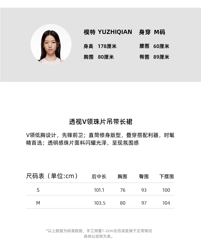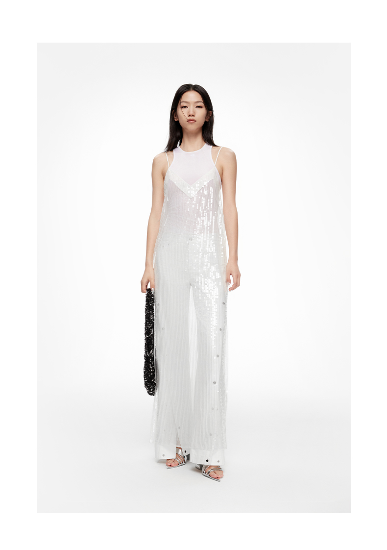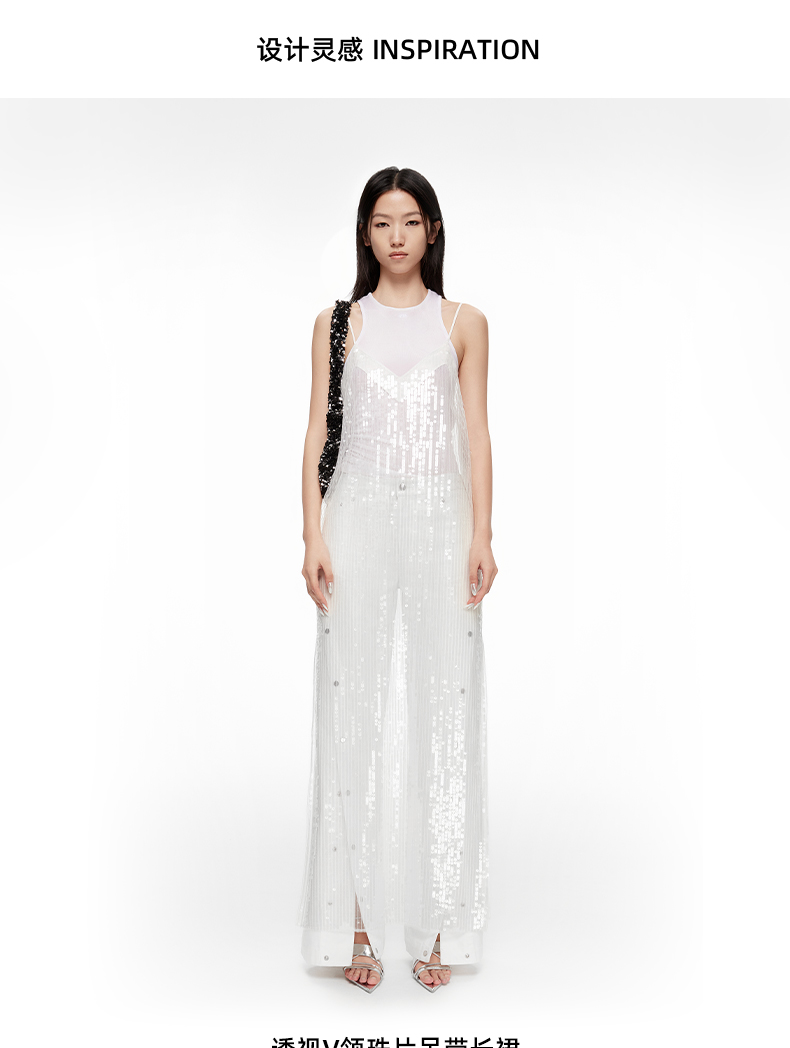 lost in echo2024春季新款设计师品牌透视V领珠片直筒吊带长裙