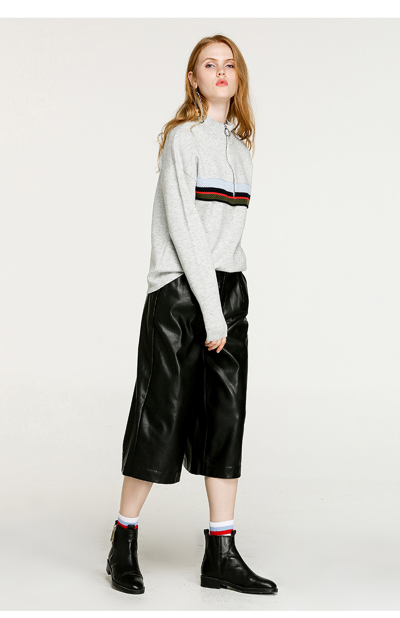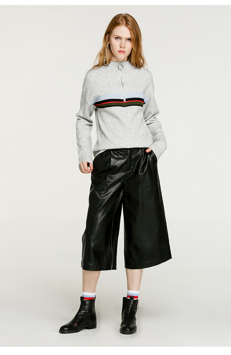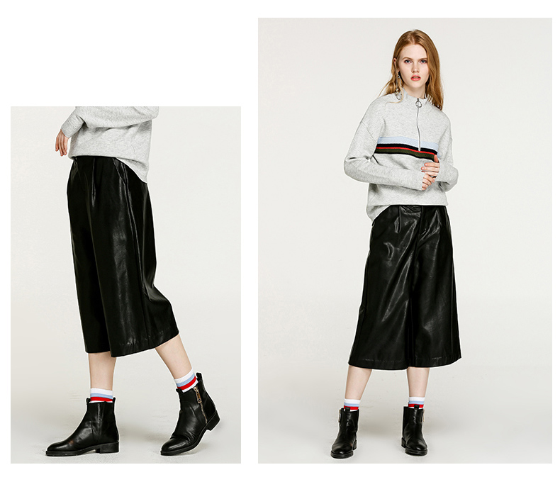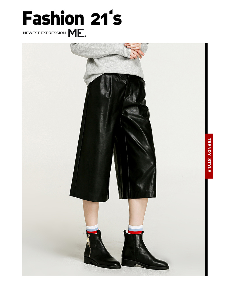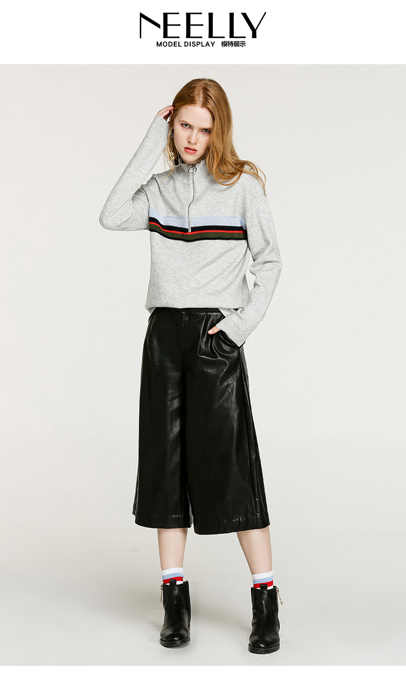 NEELLY/纳俪女街头黑色朋克休闲PU自然腰皮裤子七分裤N096808070