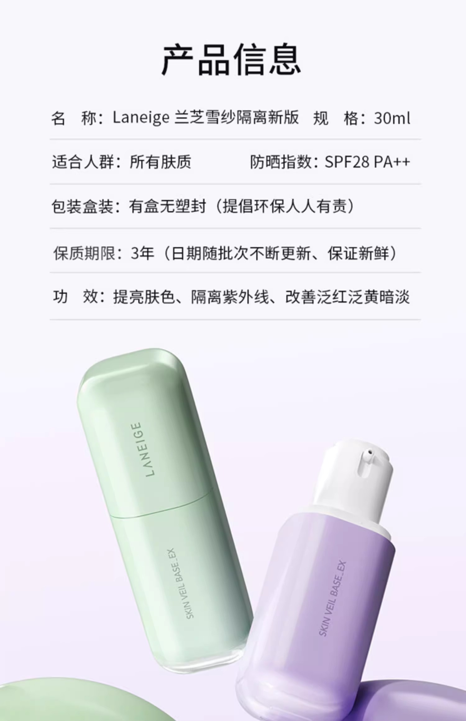 【限时特惠】新款 Laneige兰芝雪纱丝柔修颜隔离乳30ml 修颜遮瑕防晒打底清透提亮