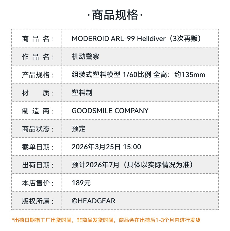 【GSC预售定金】MODEROID ARL-99 Helldiver 机动警察 手办模玩