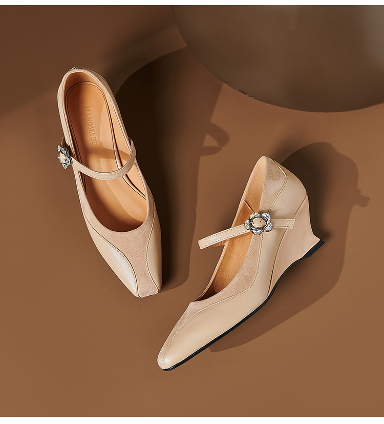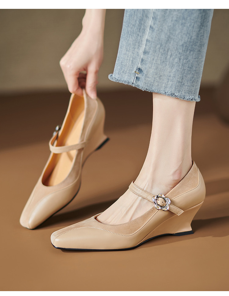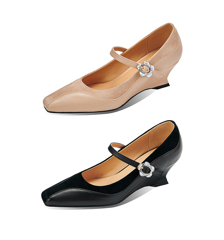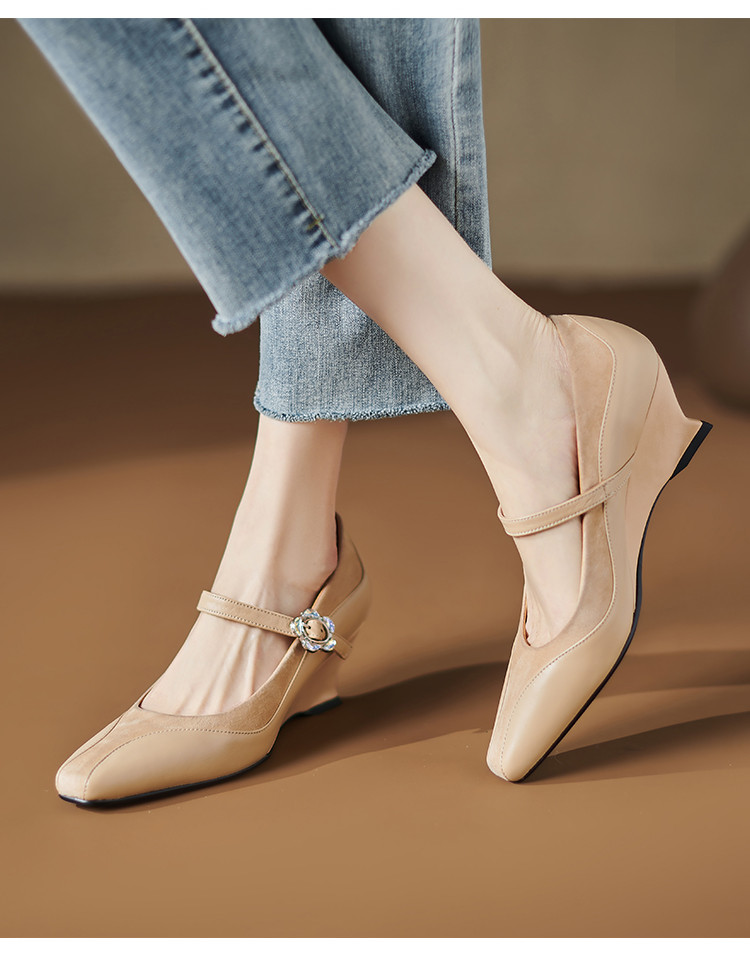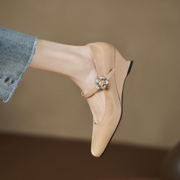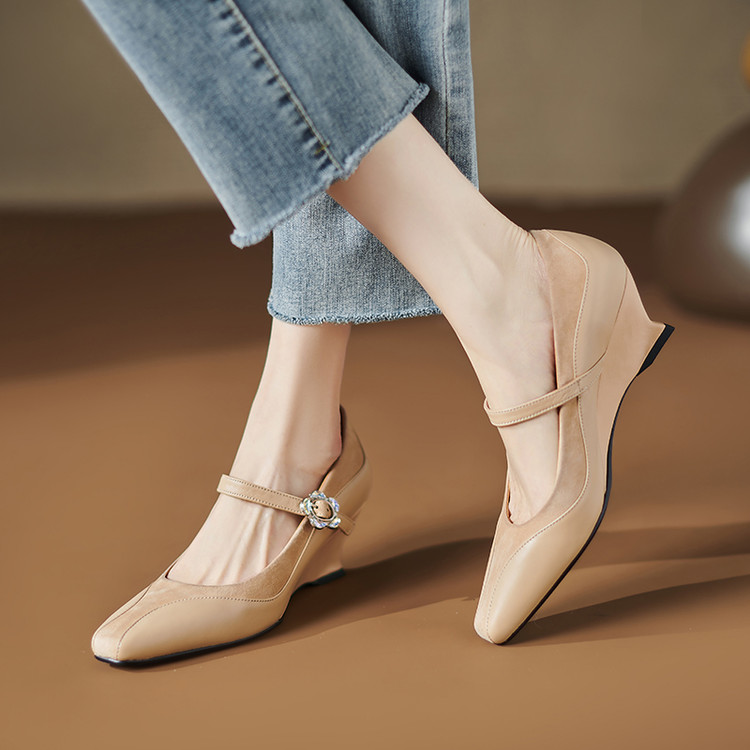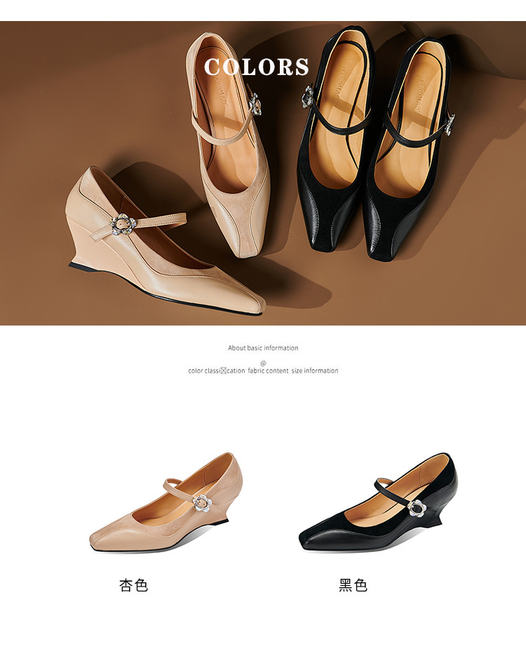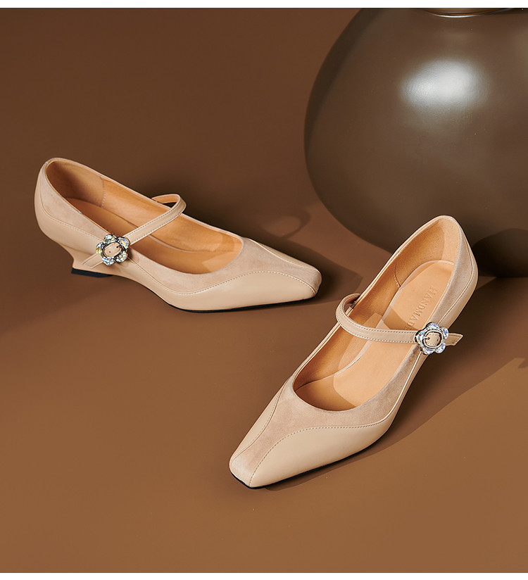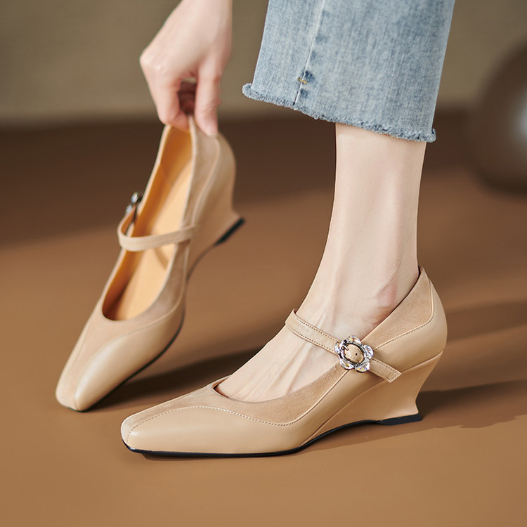 【预售5天】杏色方头一字带扣坡跟浅口单鞋,牛皮拼接时尚女鞋子QS&6091