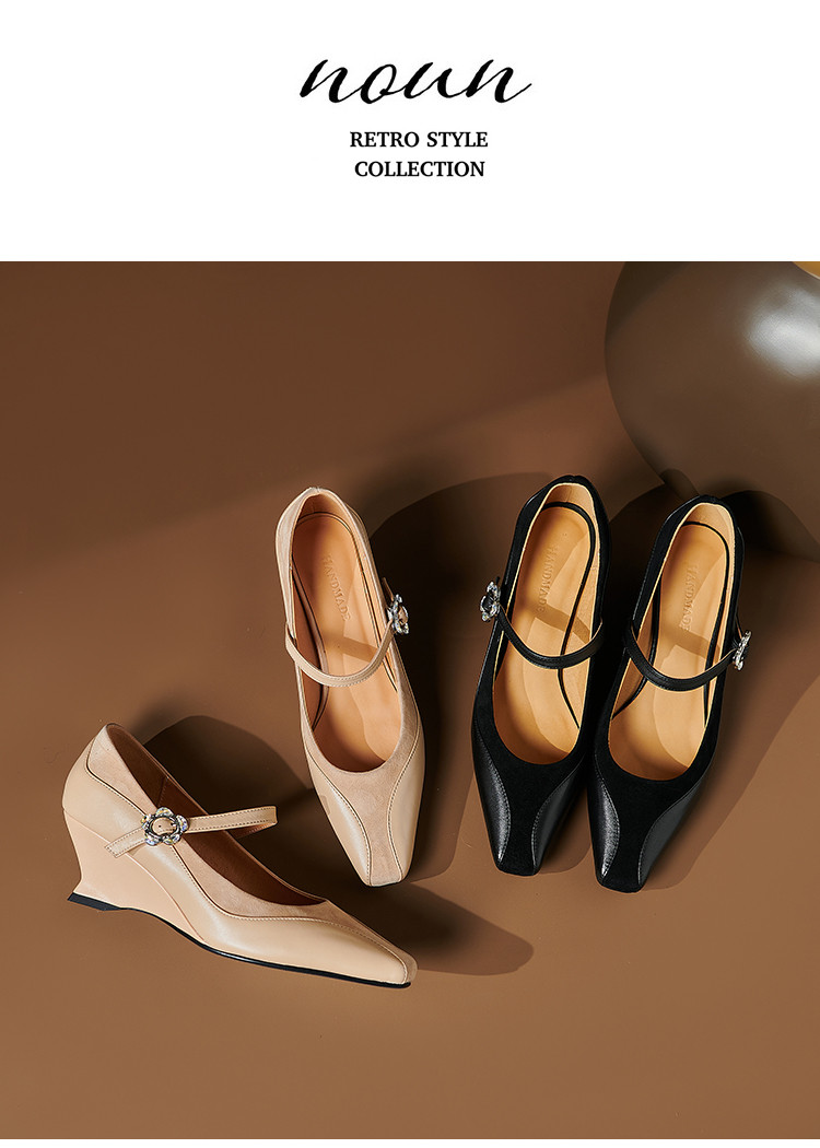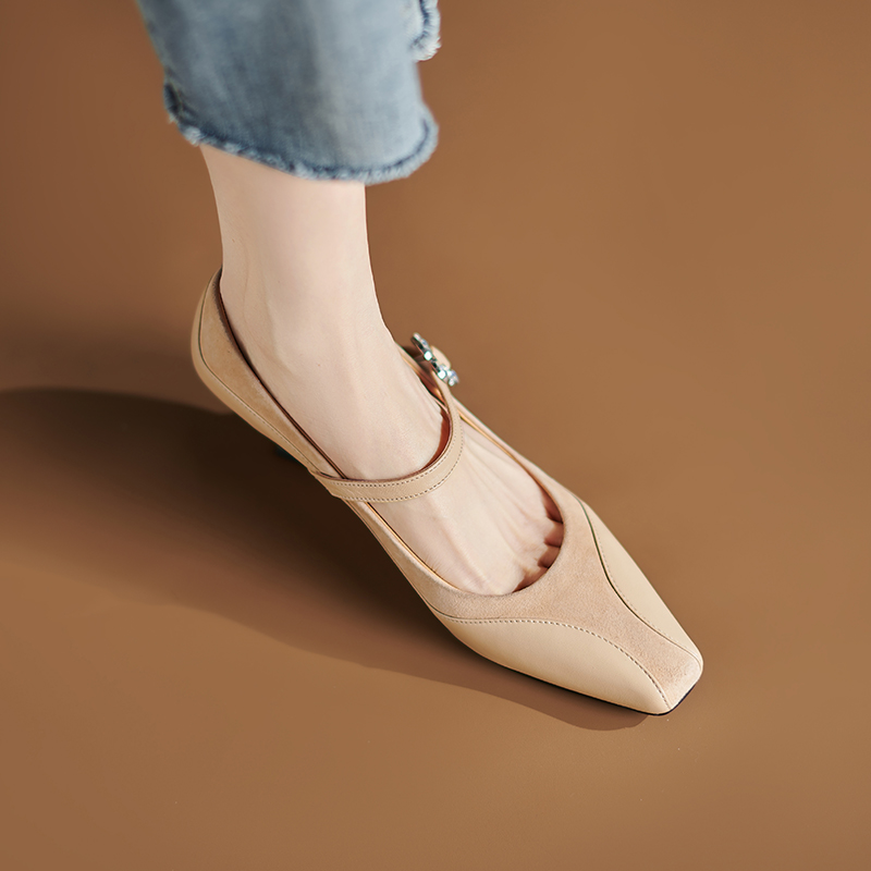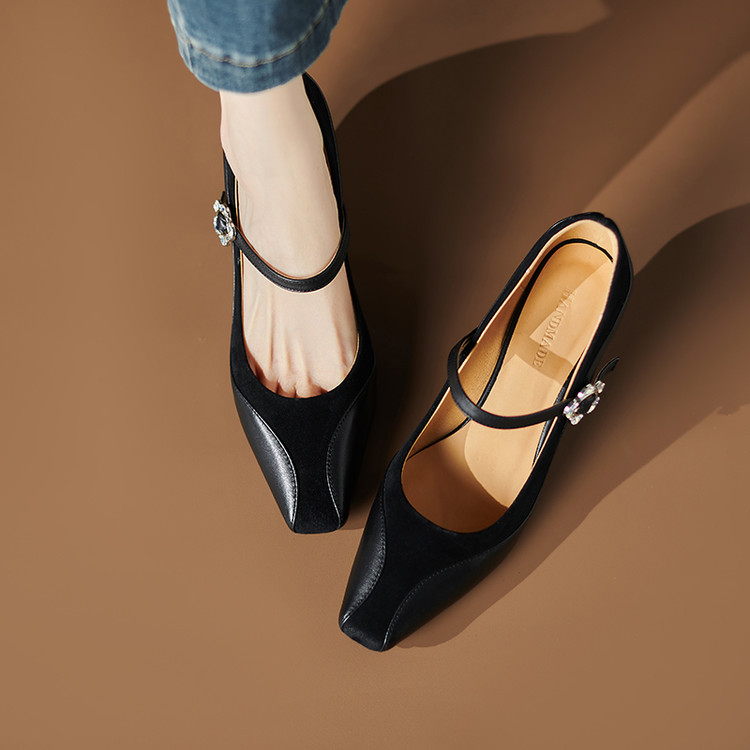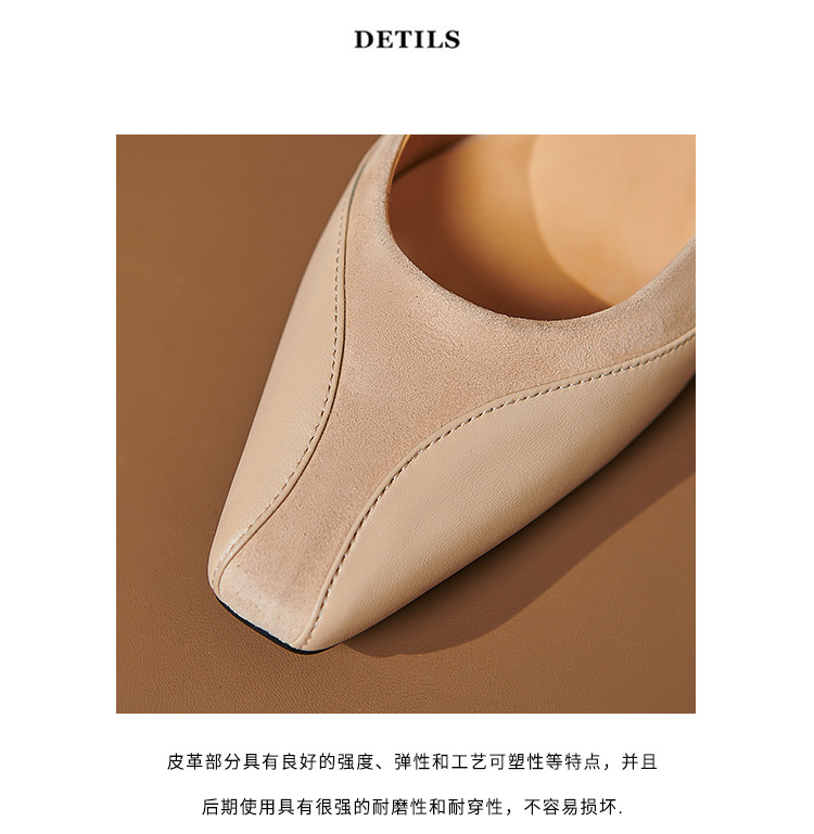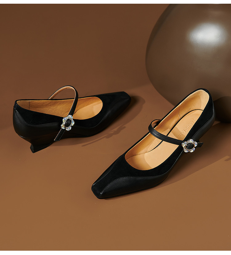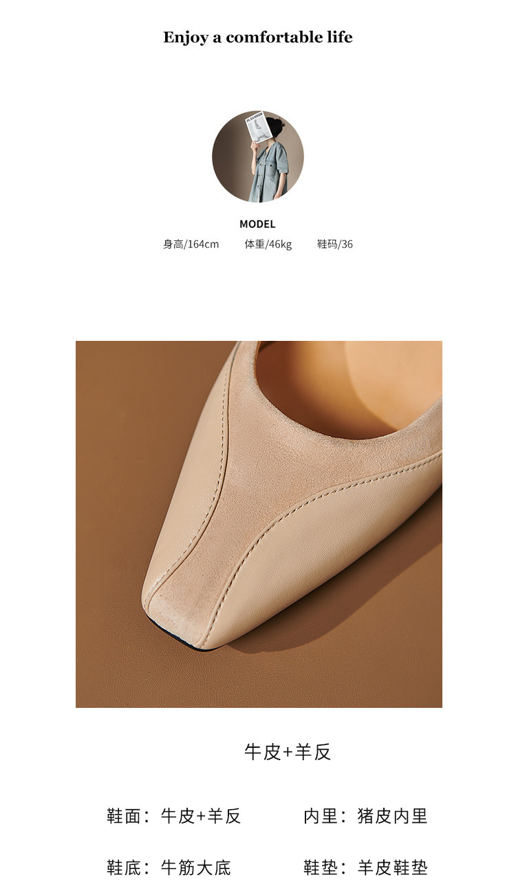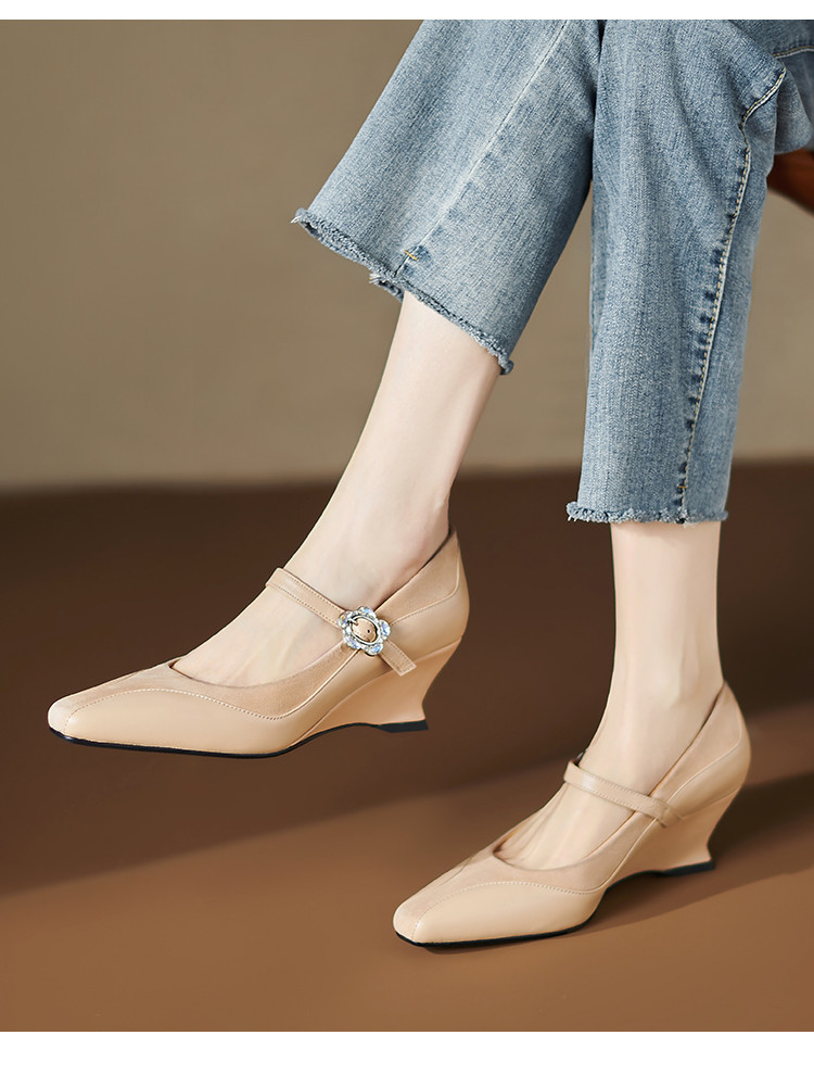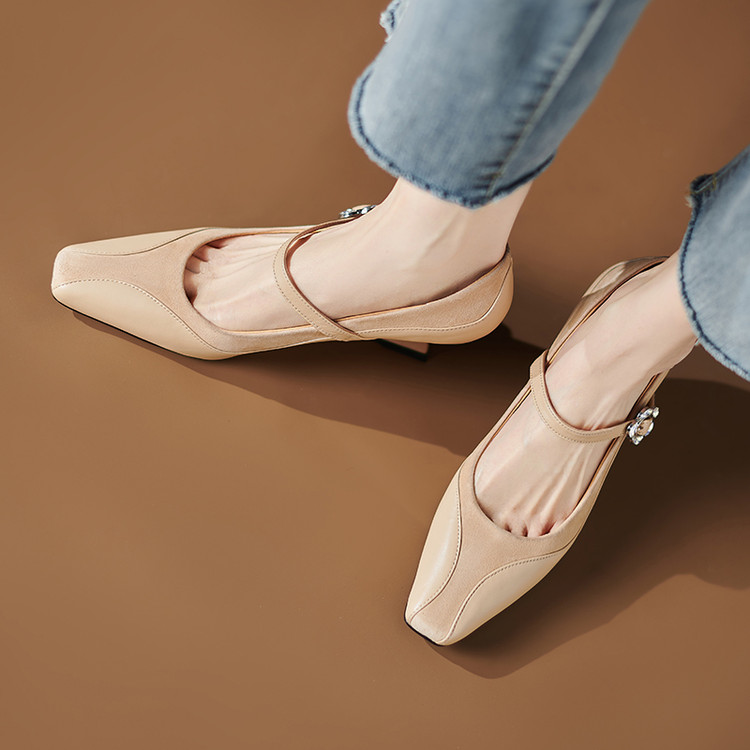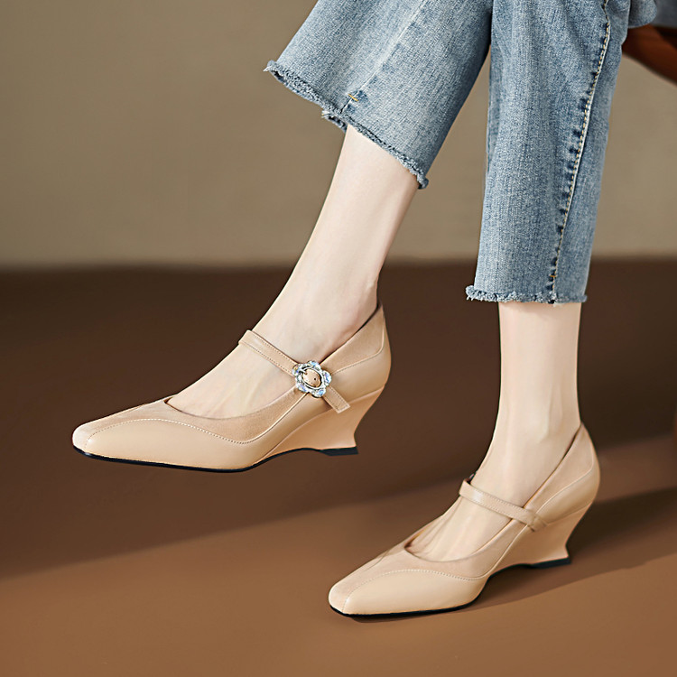 【预售5天】杏色方头一字带扣坡跟浅口单鞋,牛皮拼接时尚女鞋子QS&6091