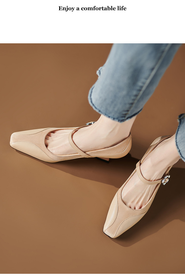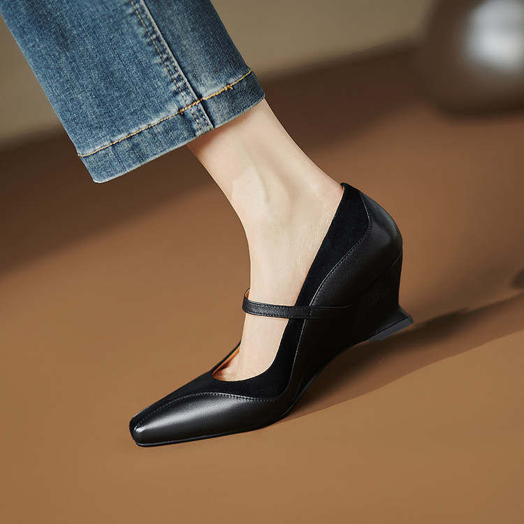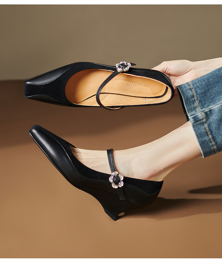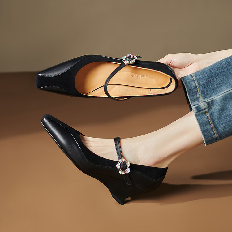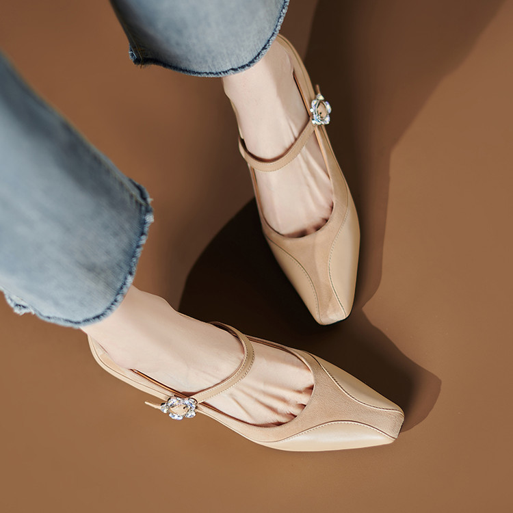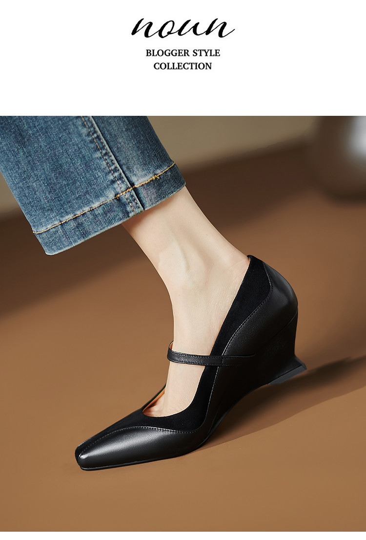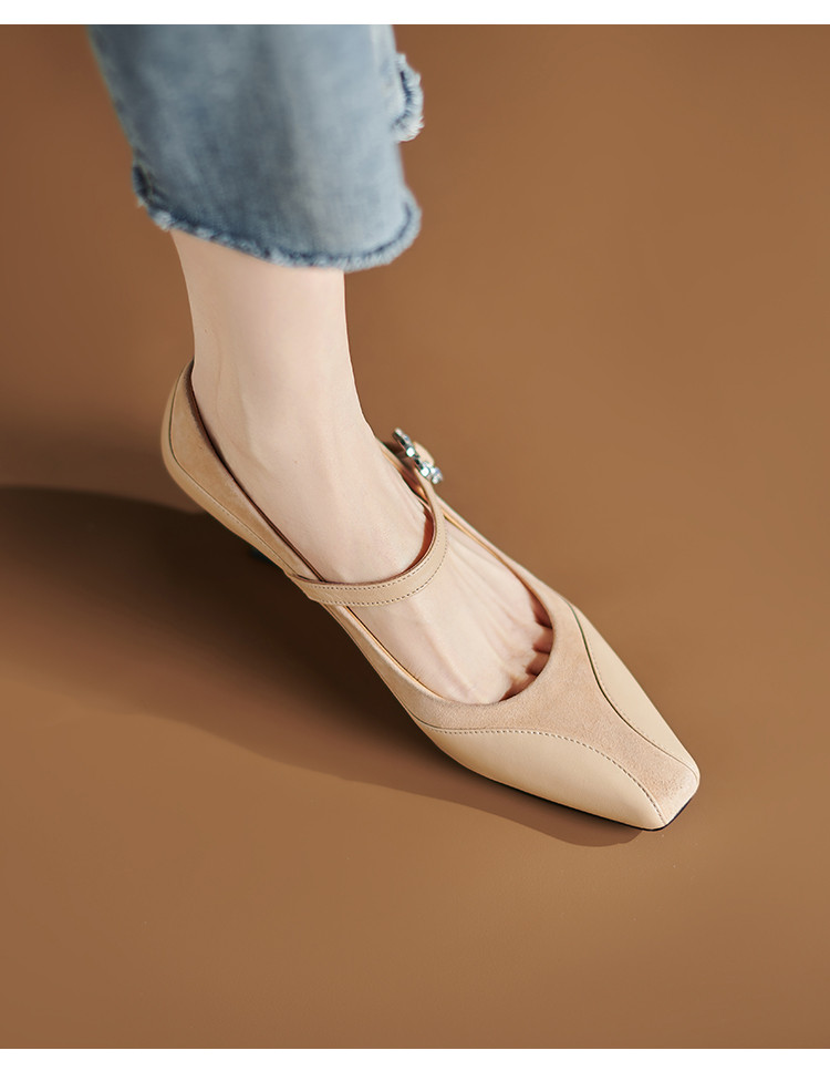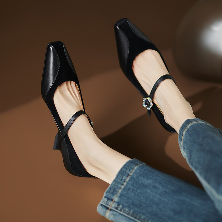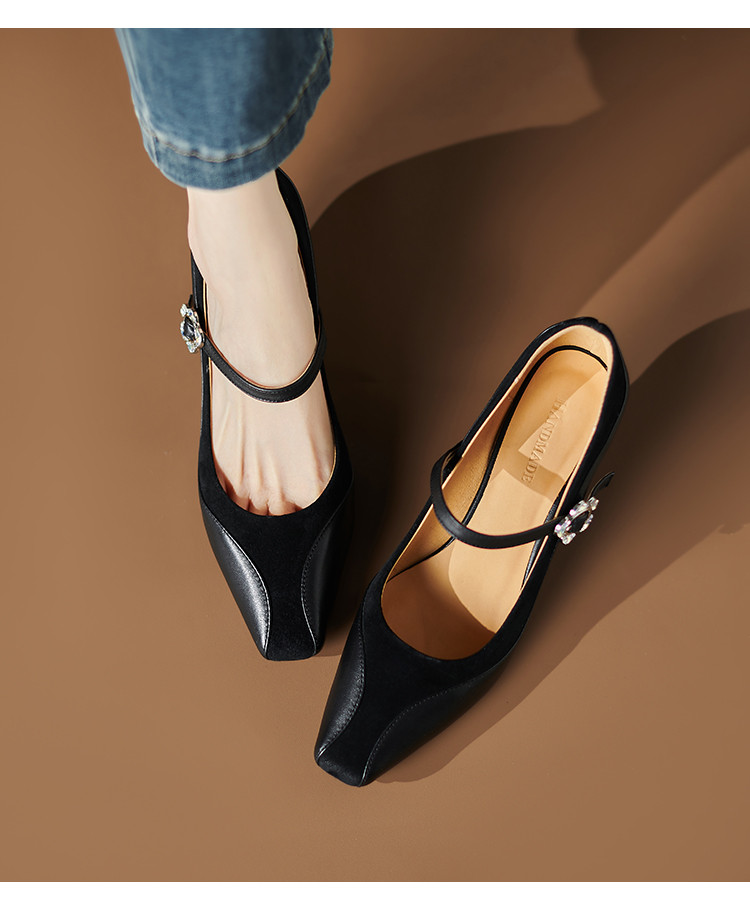 【预售5天】杏色方头一字带扣坡跟浅口单鞋,牛皮拼接时尚女鞋子QS&6091