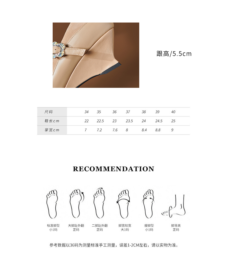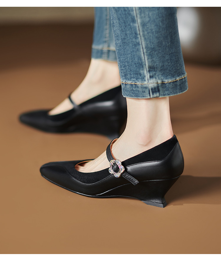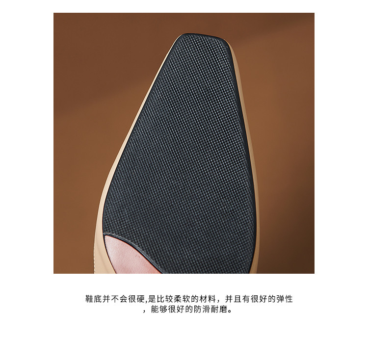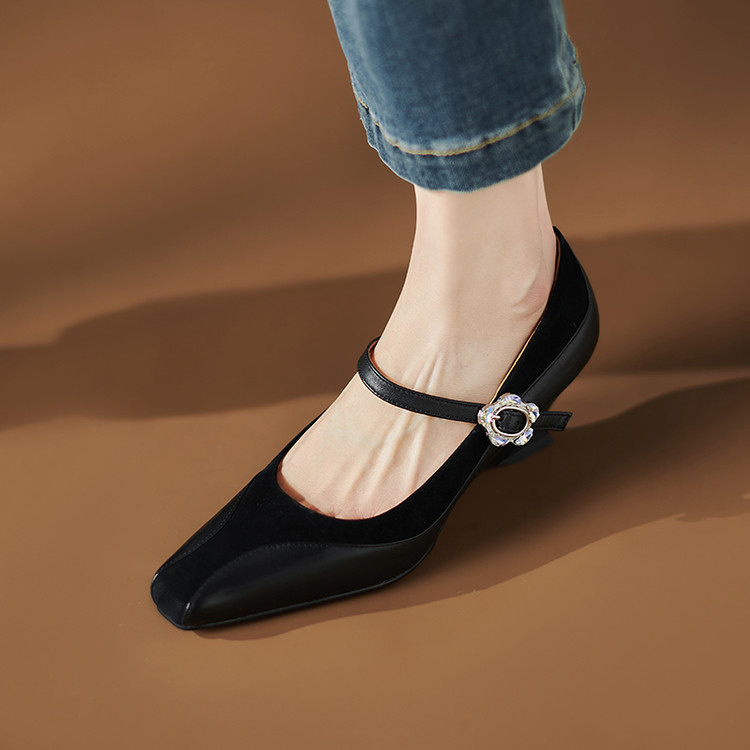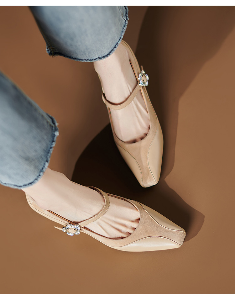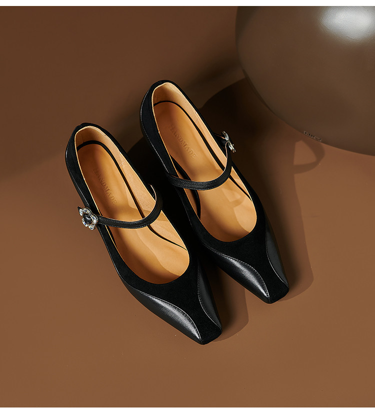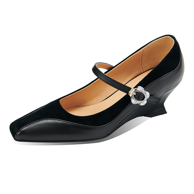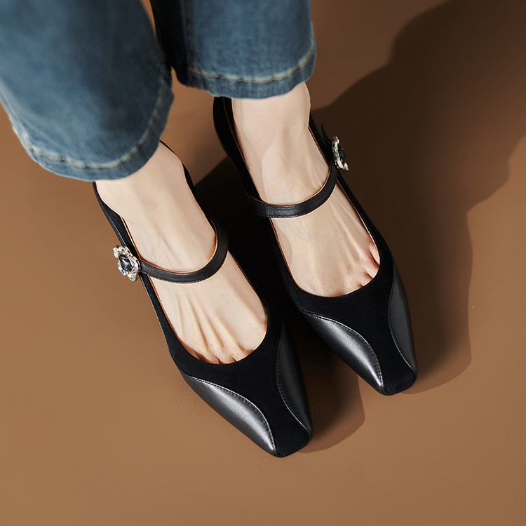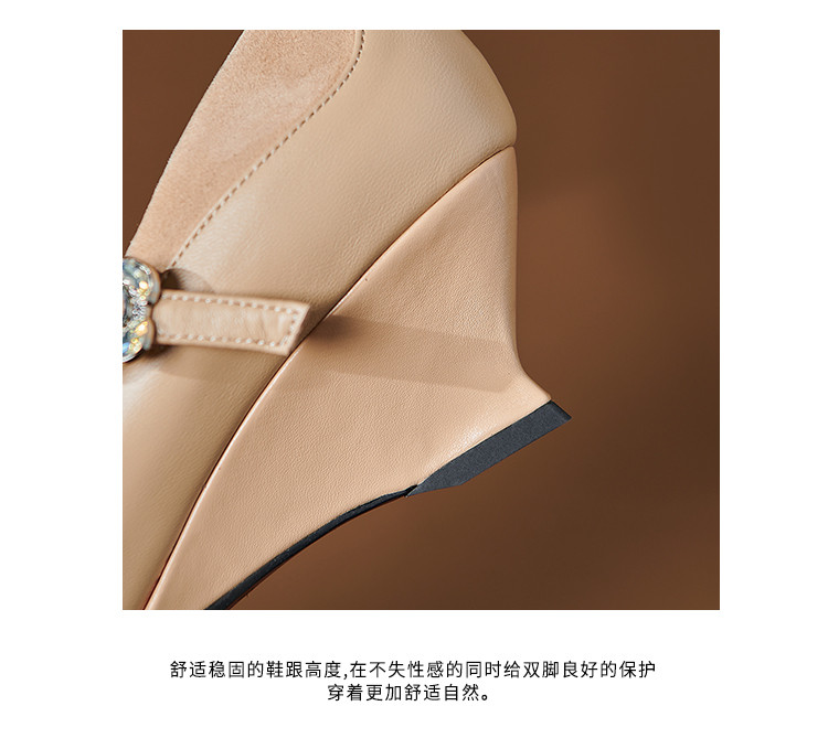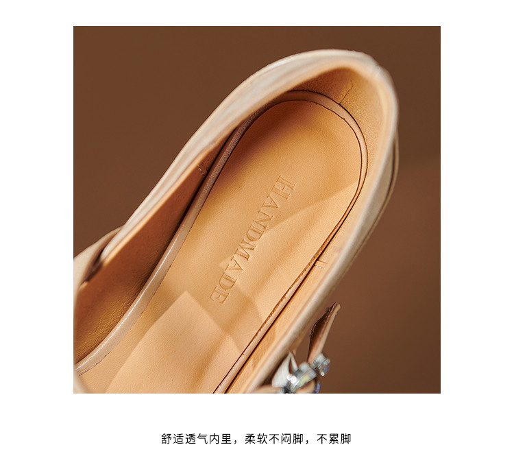【预售5天】杏色方头一字带扣坡跟浅口单鞋,牛皮拼接时尚女鞋子QS&6091