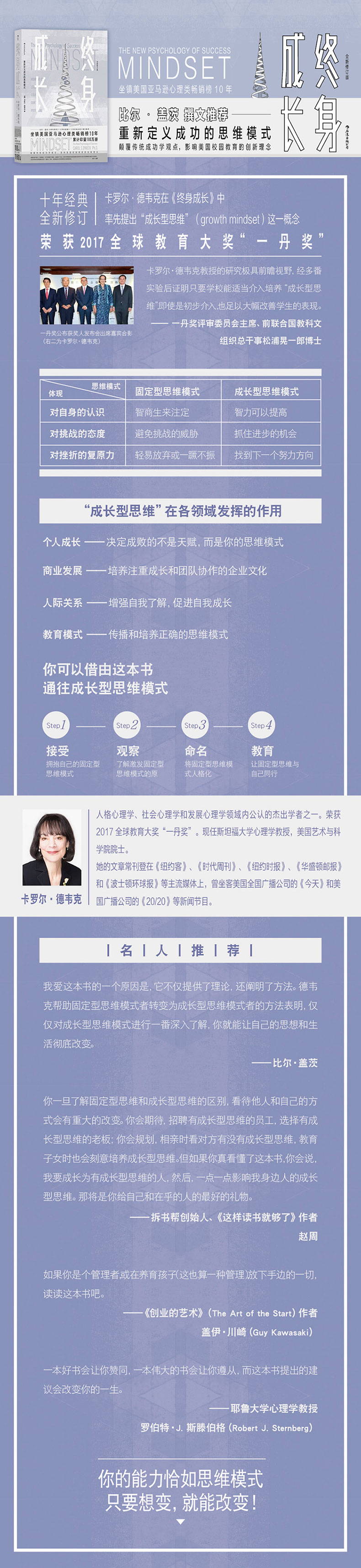 你一旦了解固定型思维和成长型思维的区别,看待他人和自己的方式会有重大的改变。你会期待,招聘有成长型思维的员工,选择有成长型思维的老板;你会规划,相亲时看对方有没有成长型思维,教育子女时也会刻意培养成长型思维。但如果你真看懂了这本书,你会说,我要成长为有成长型思维的人,然后,一点一点影响我身边人的成长型思维。那将是你给自己和在乎的人的好的礼物。