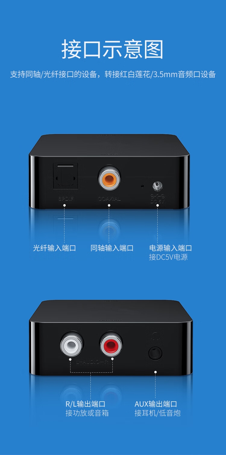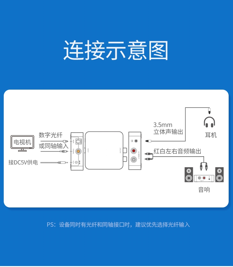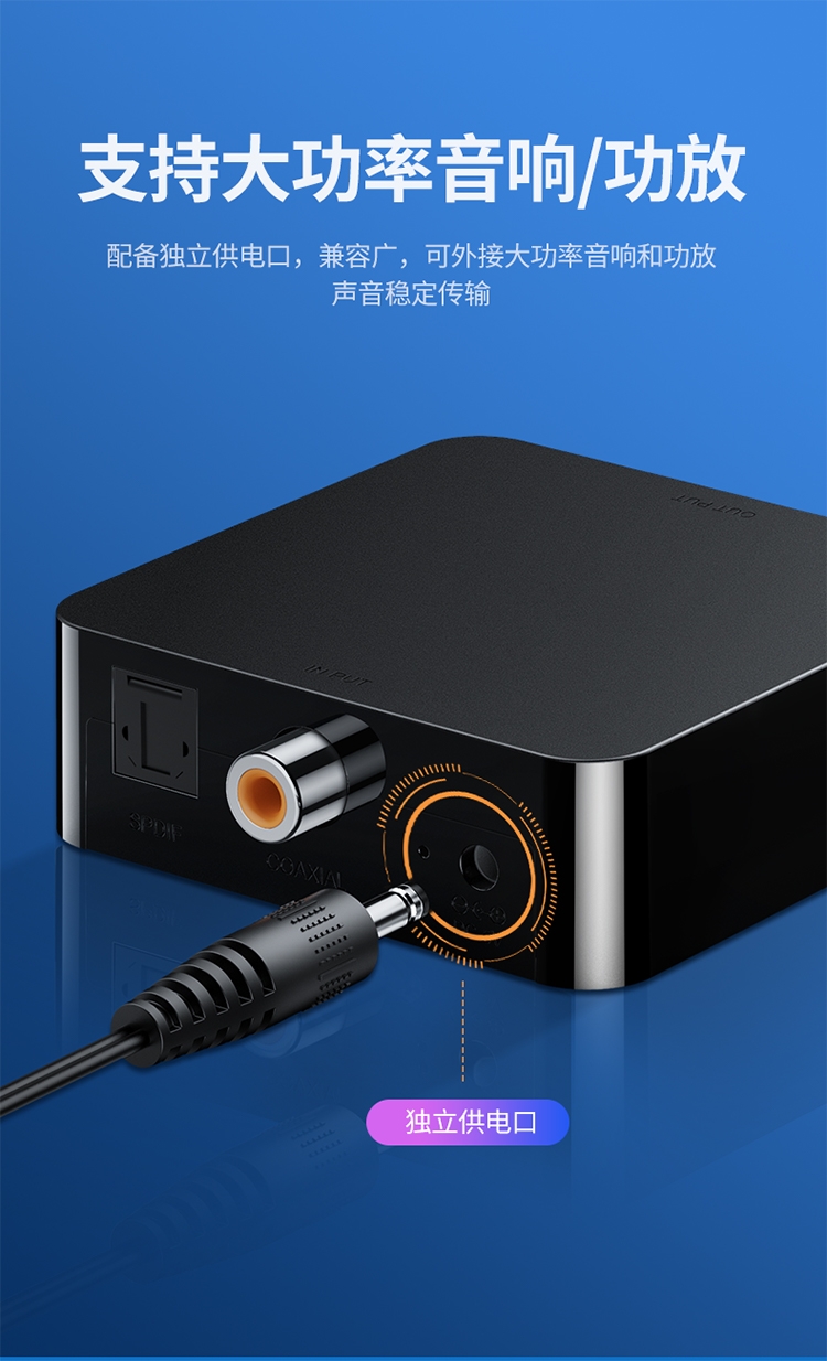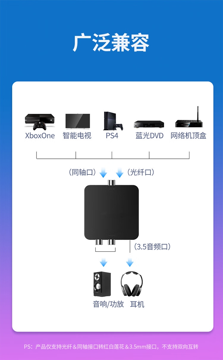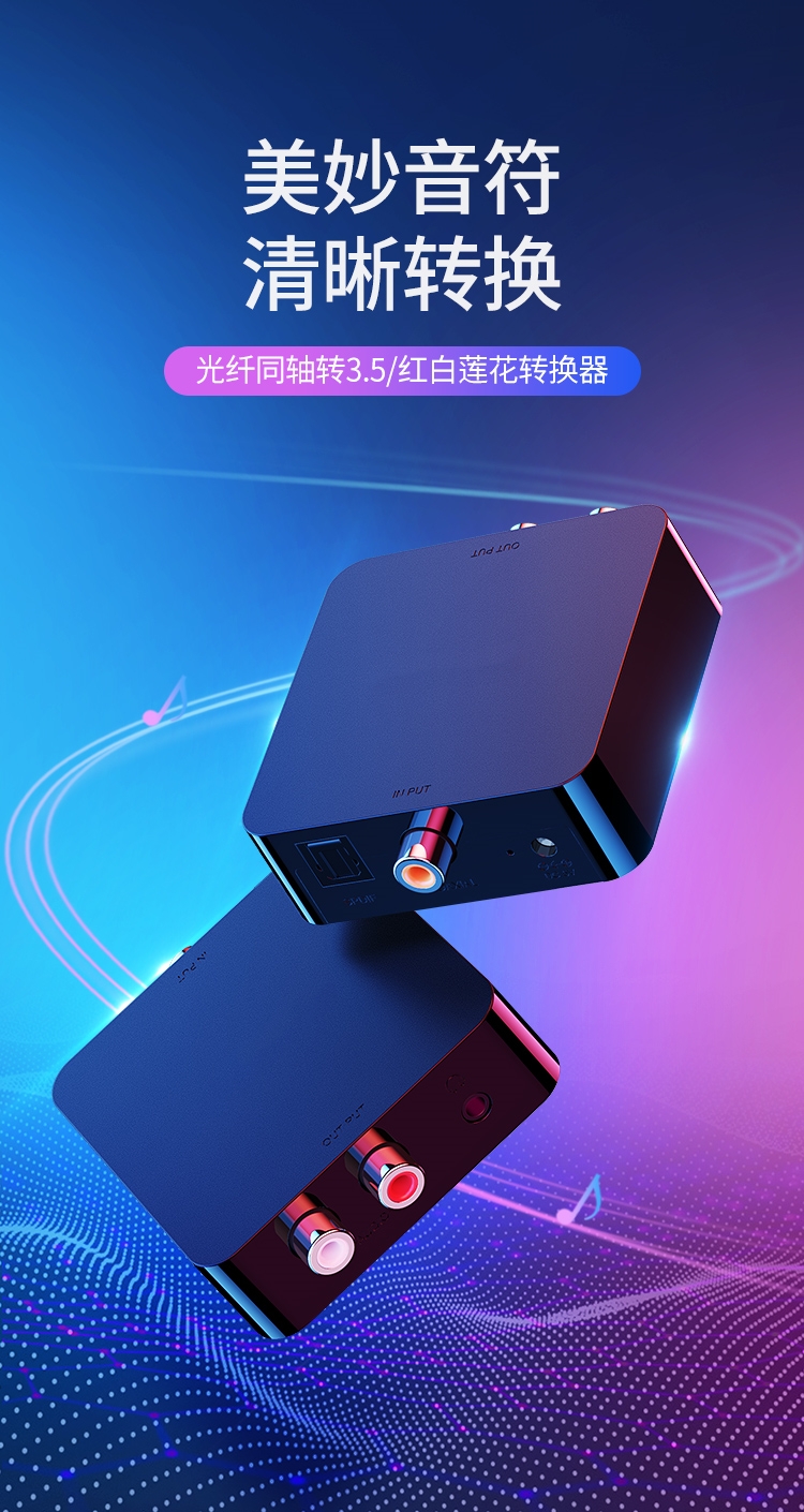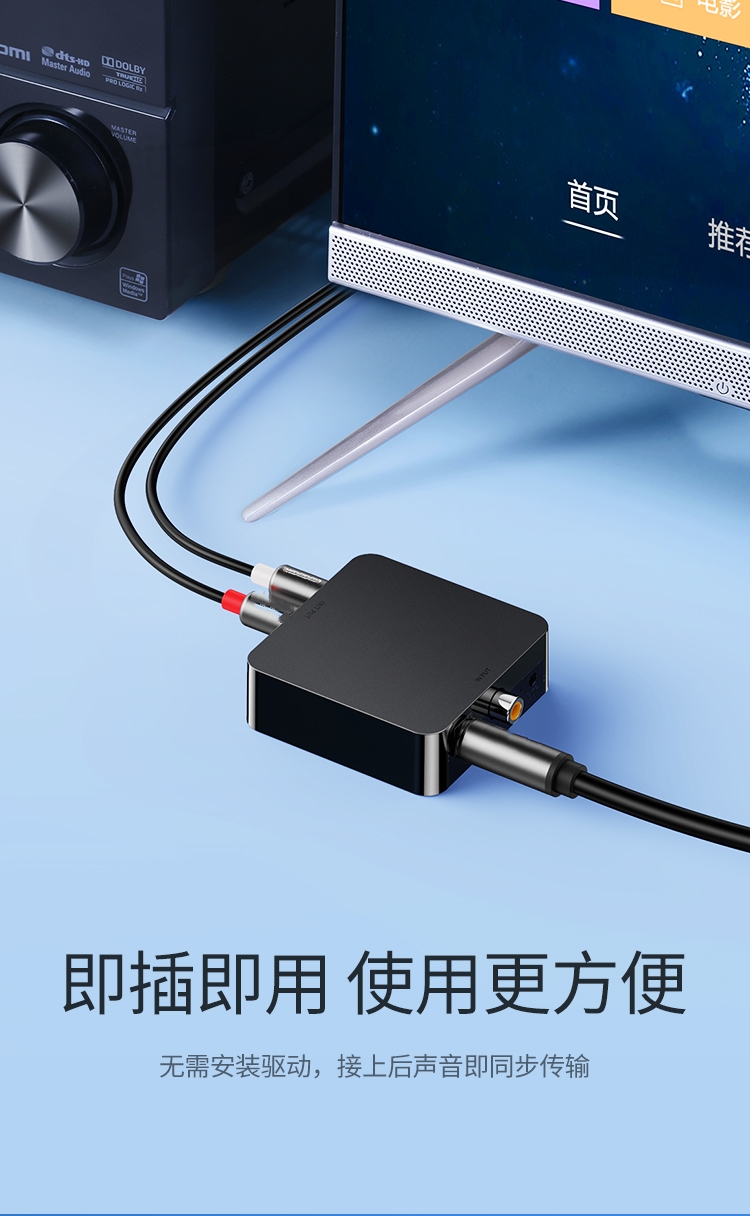 商品名称:数字光纤同轴音频转换器 支持电视机顶盒PS4接双莲花2RAC音响功放SPDIF转模拟3.5mm 产品不带音频线,支持立体声,3.5+双莲花接口同时用,高性能芯片适用电视机顶盒PS4接音箱功放回音壁