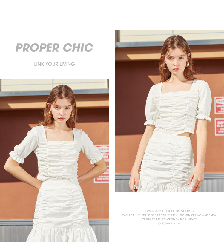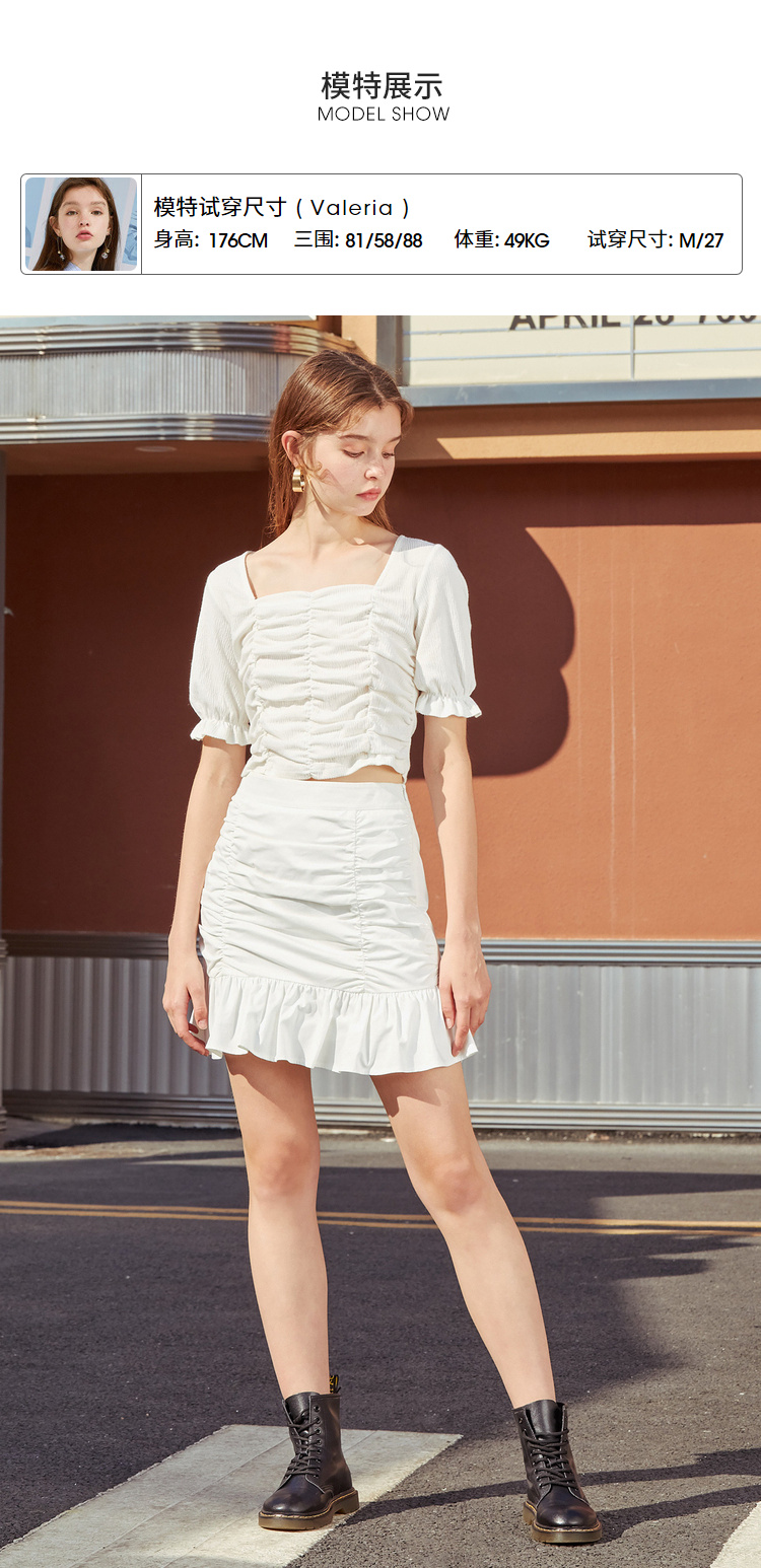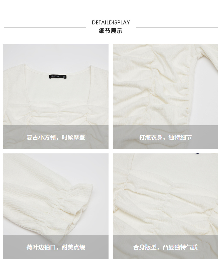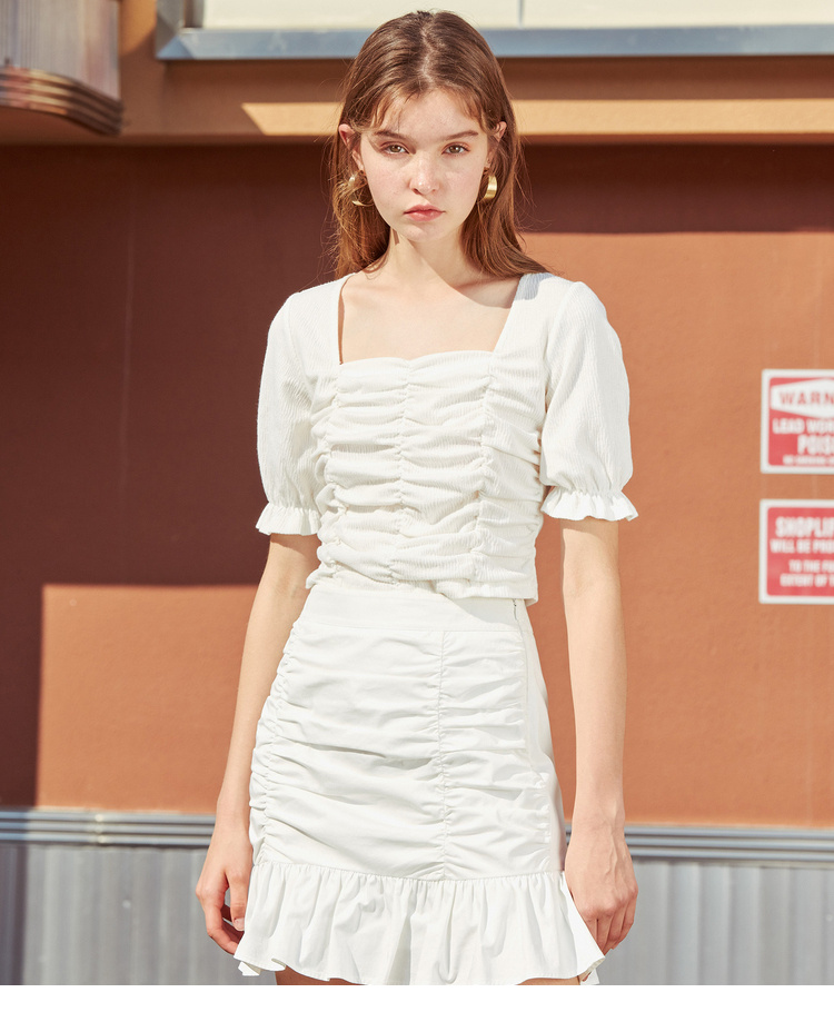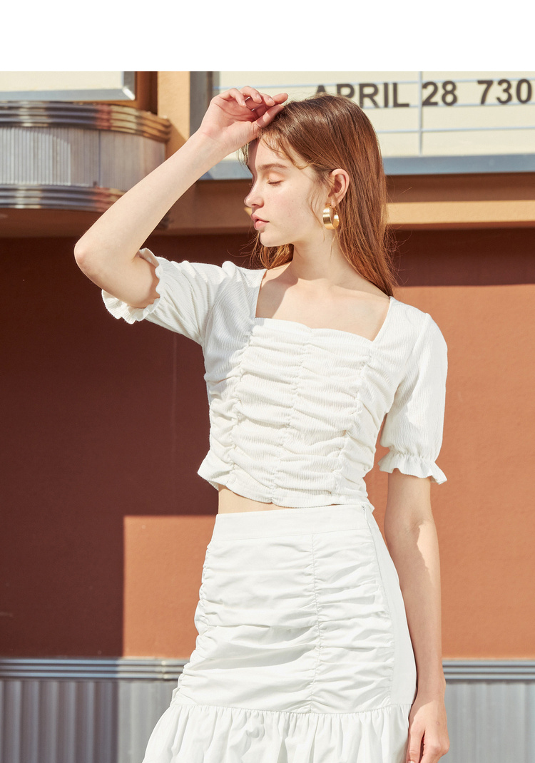 西遇T恤女方领荷叶边短款2020新款复古褶皱纯色短袖D0300204