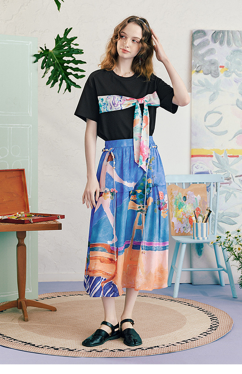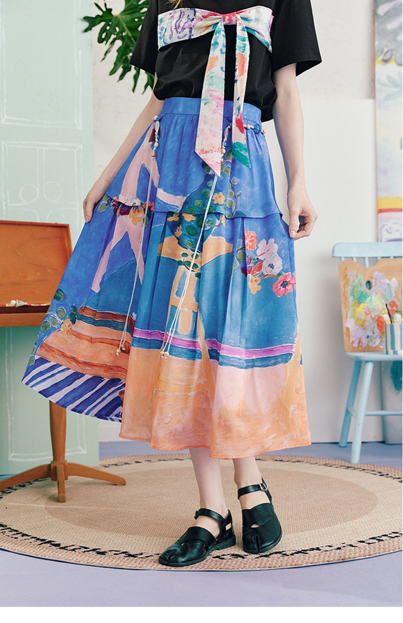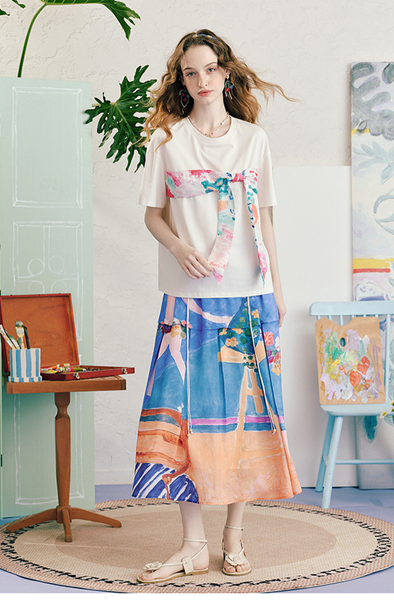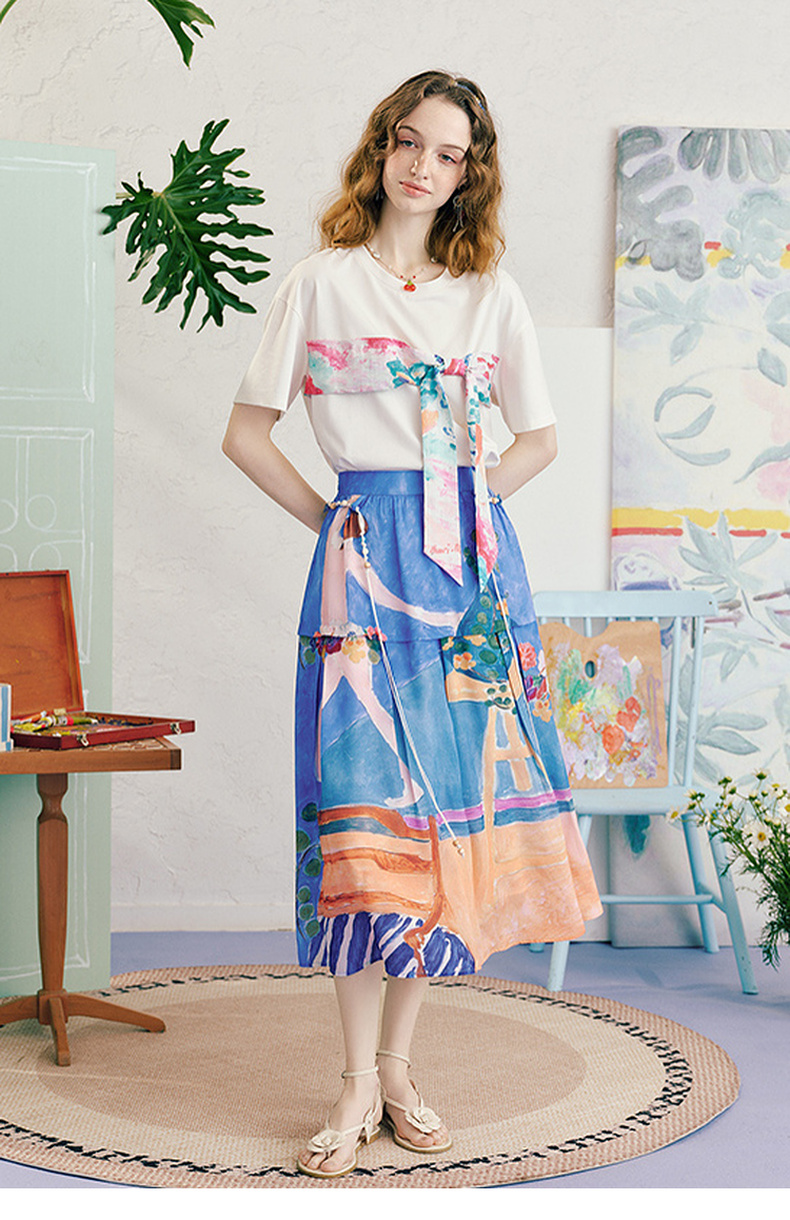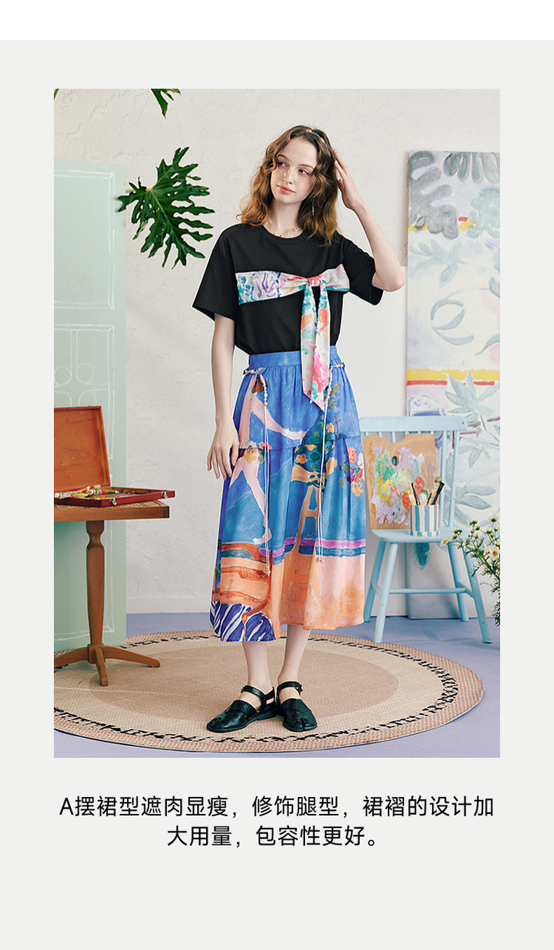 两三事 浓彩炽舞 2025夏季新款法式画作印花系带A字半身裙