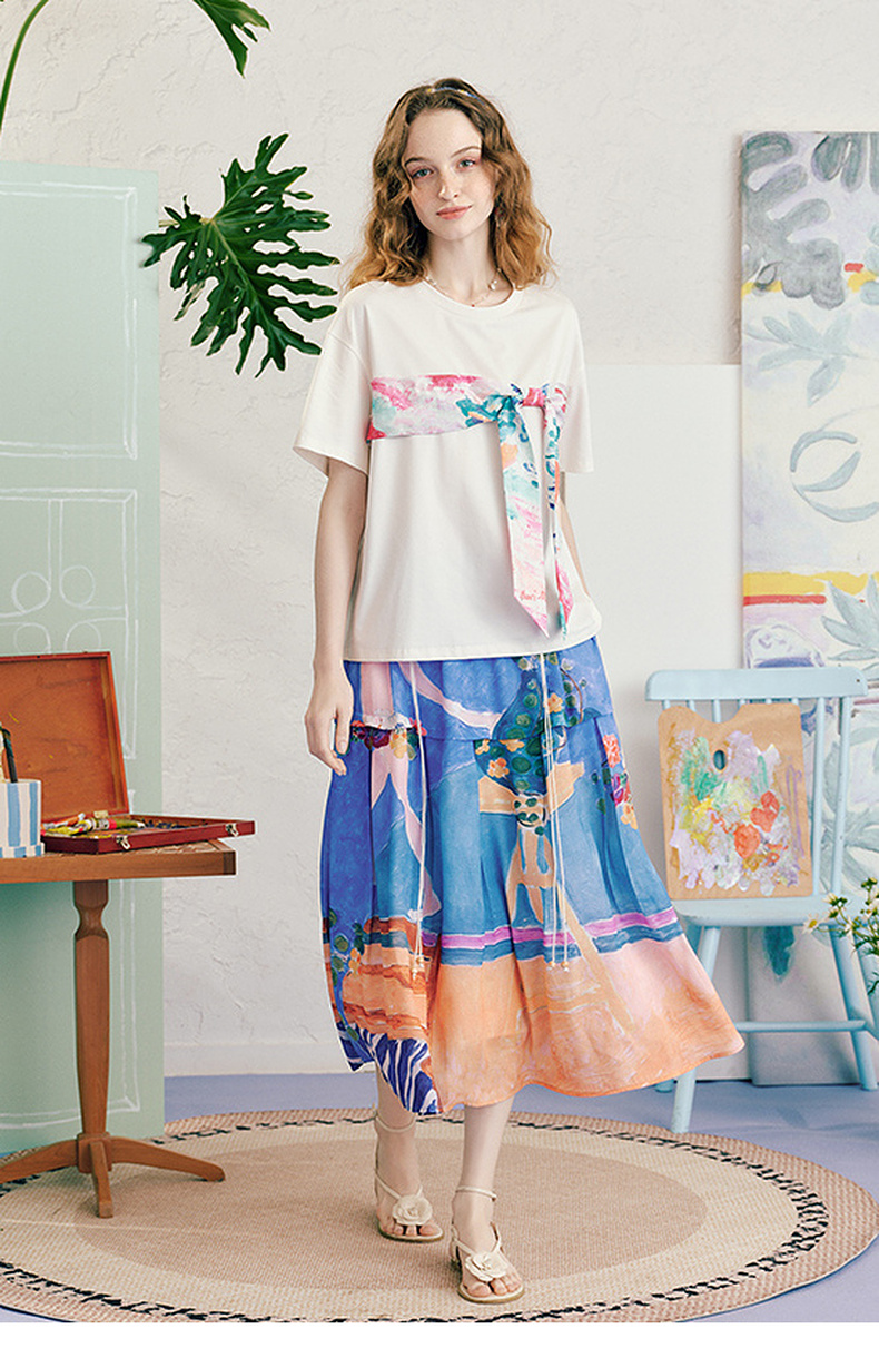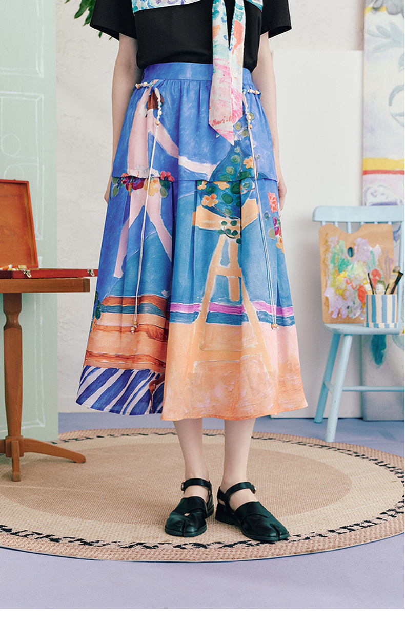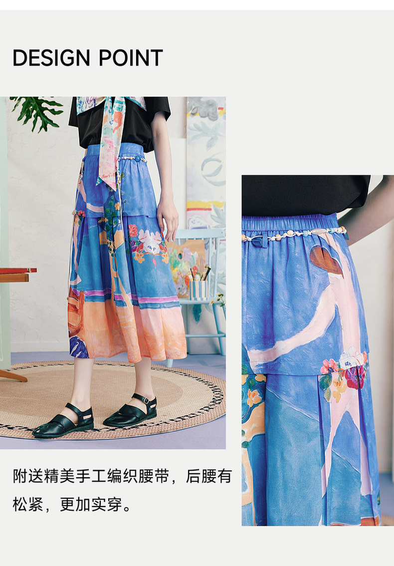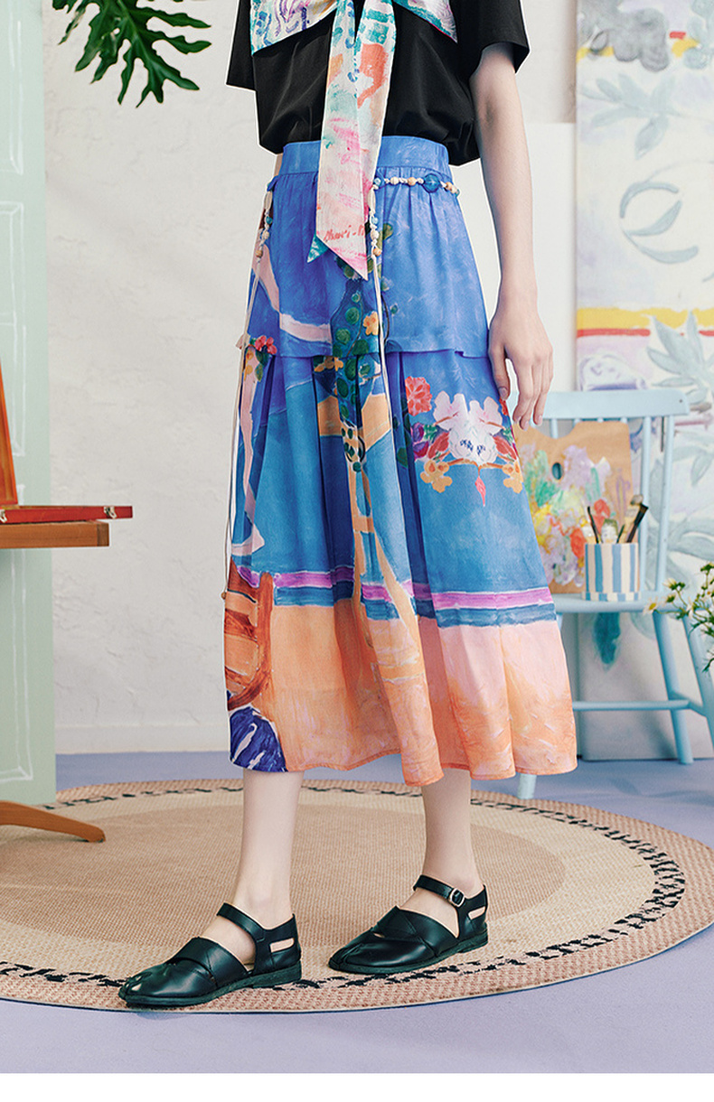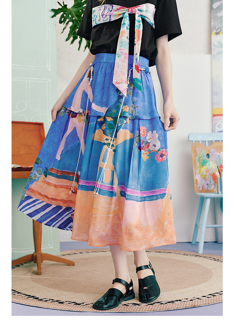 两三事 浓彩炽舞 2025夏季新款法式画作印花系带A字半身裙