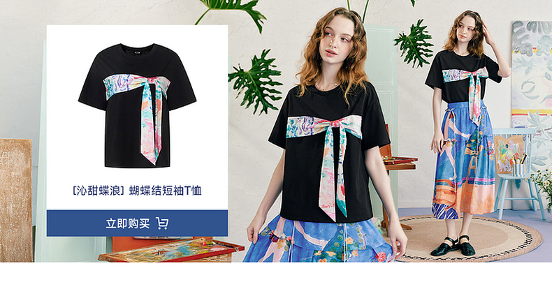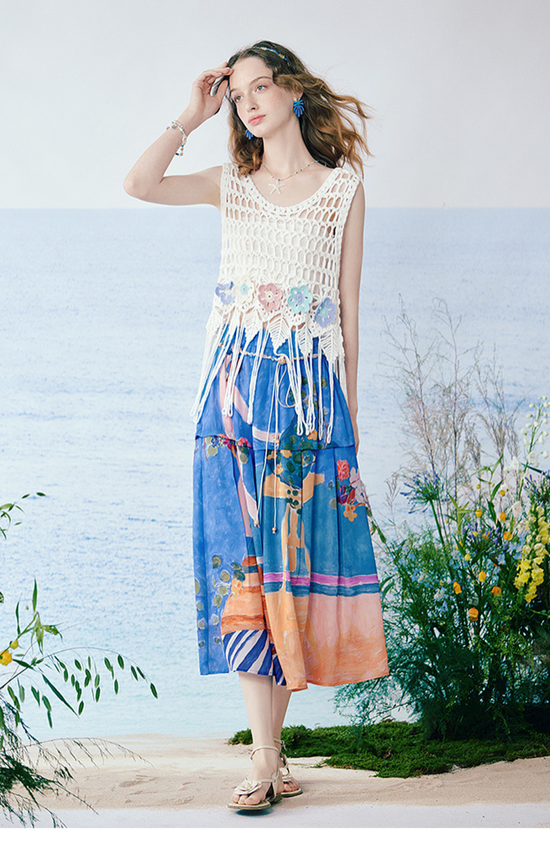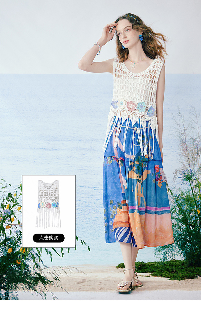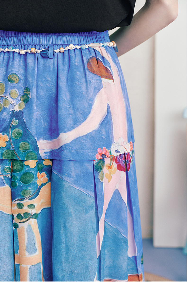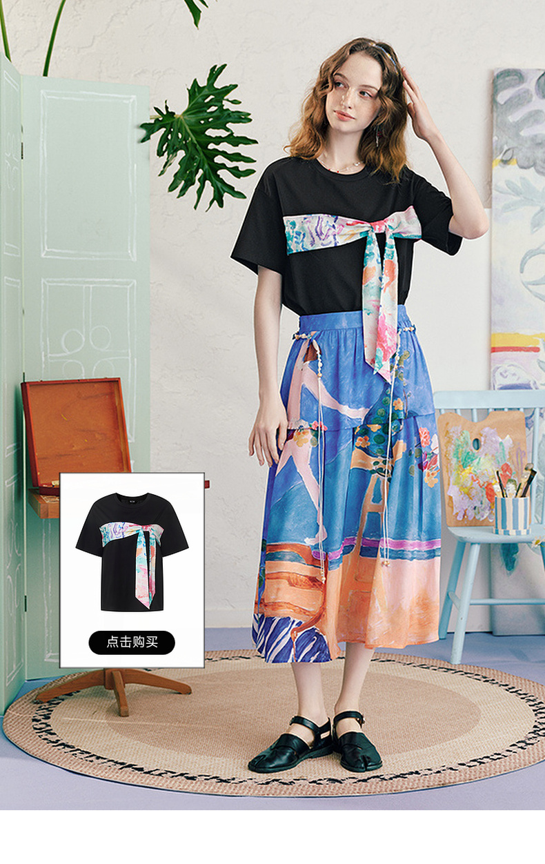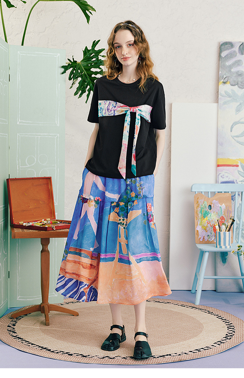 两三事 浓彩炽舞 2025夏季新款法式画作印花系带A字半身裙