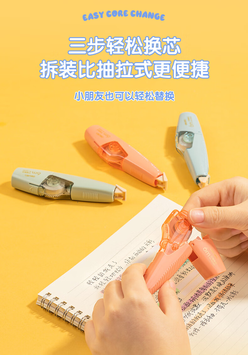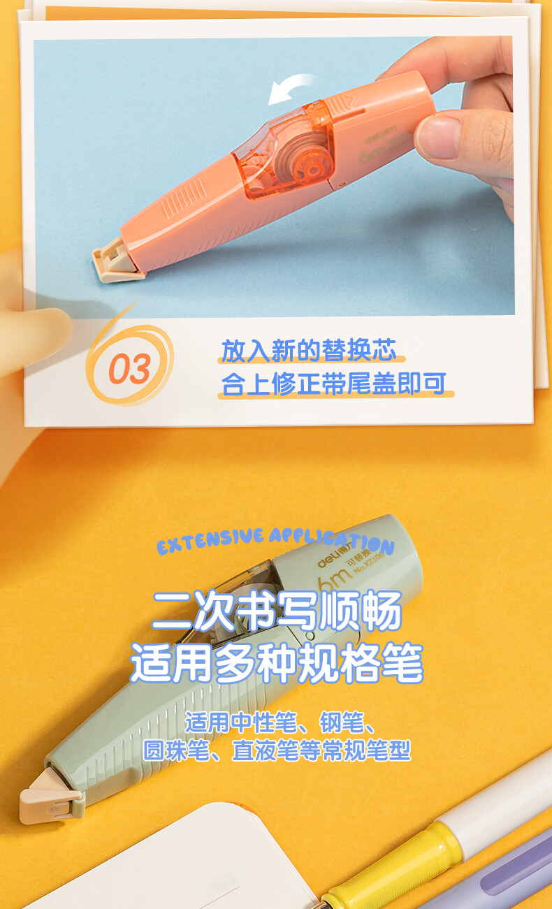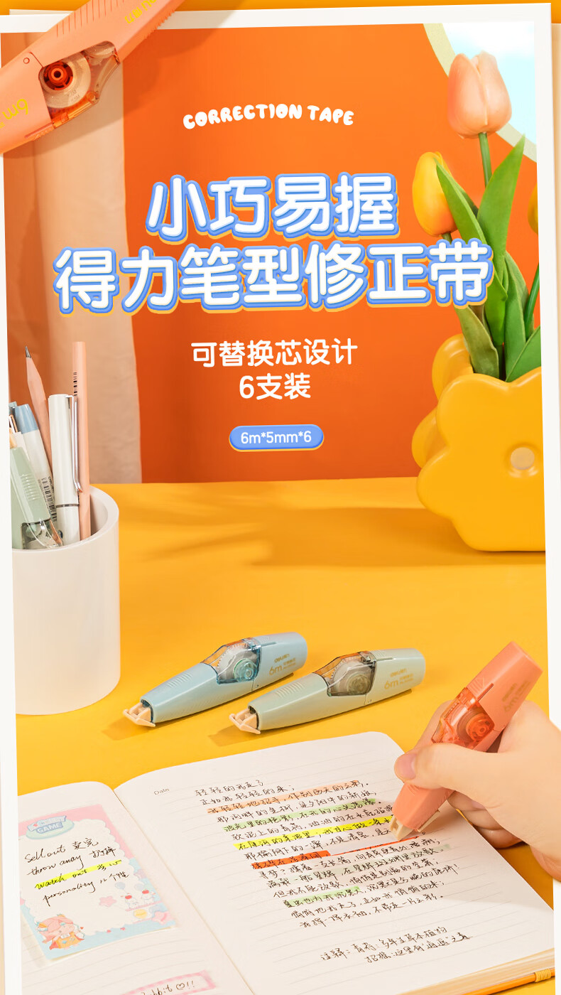 得力(deli)36m笔型修正带替芯 大容量可换替芯 学生开学文具用品涂改带改正带 6只装 100030624013