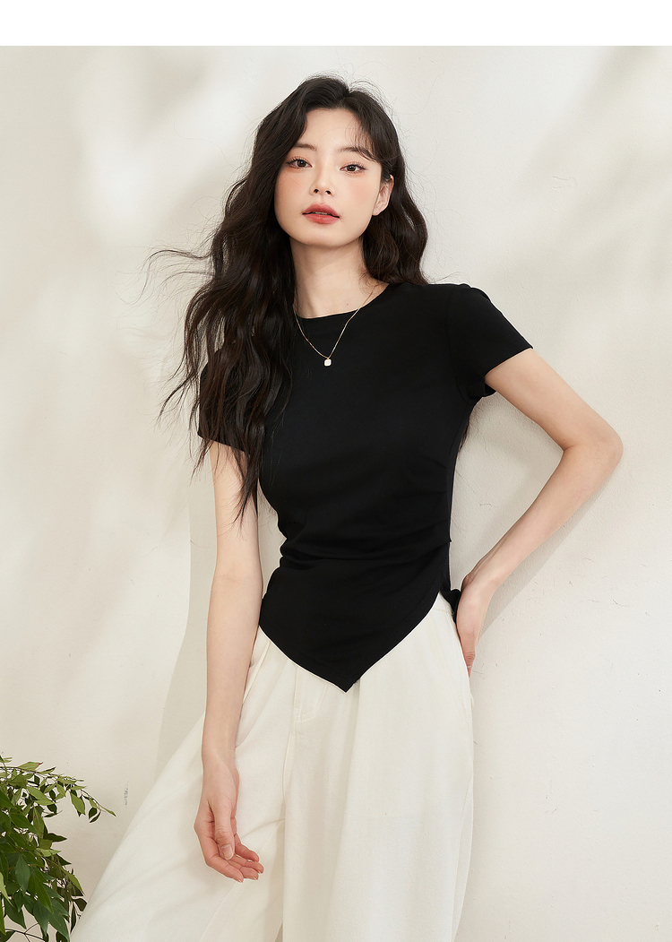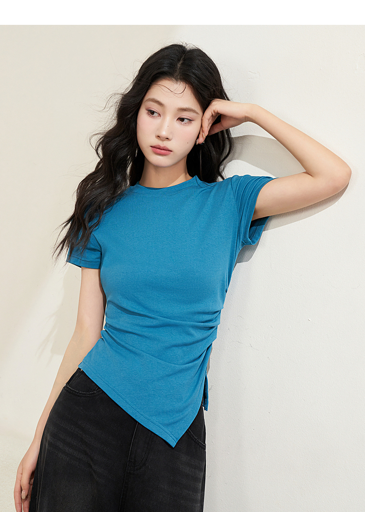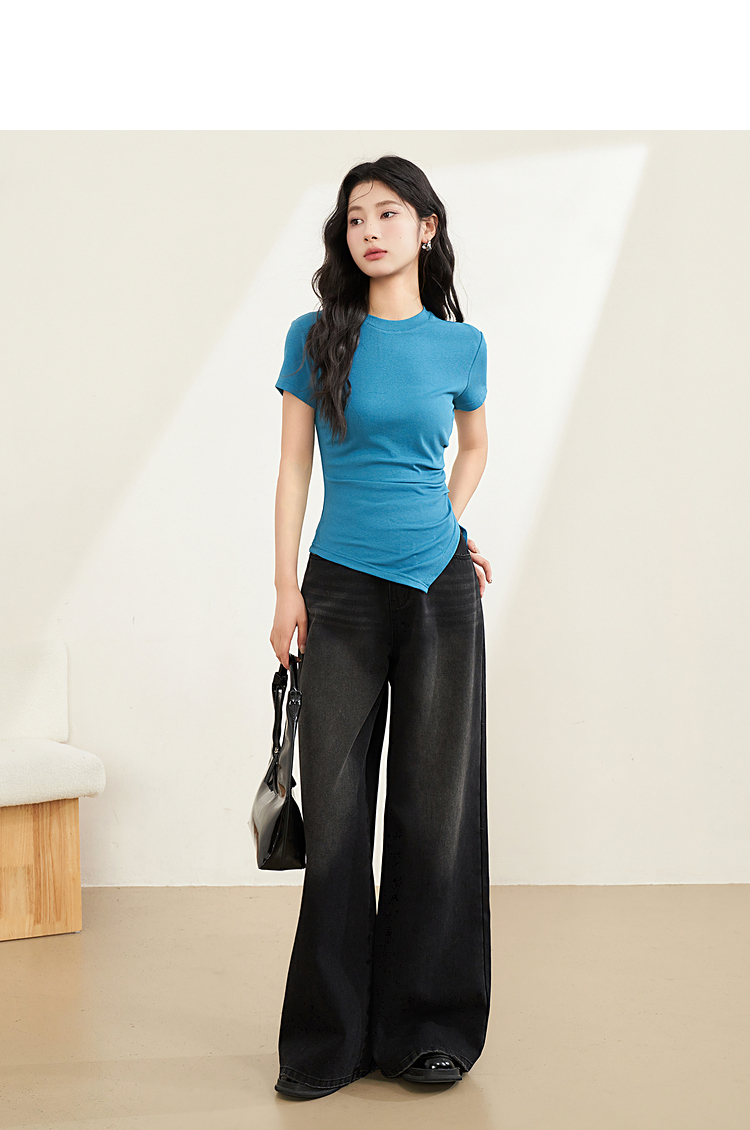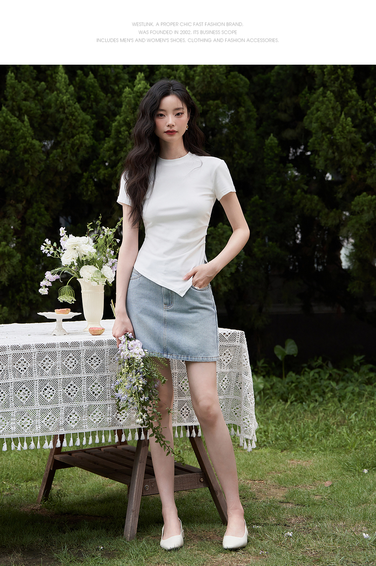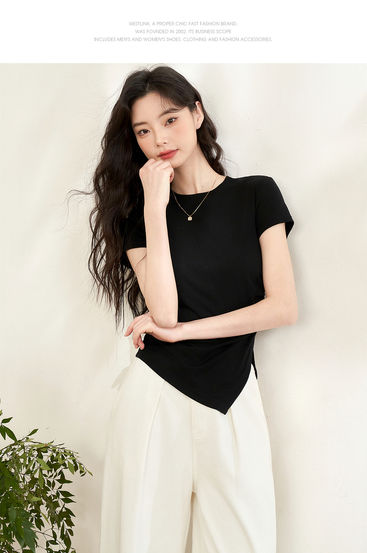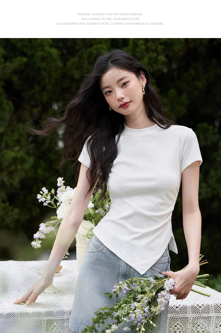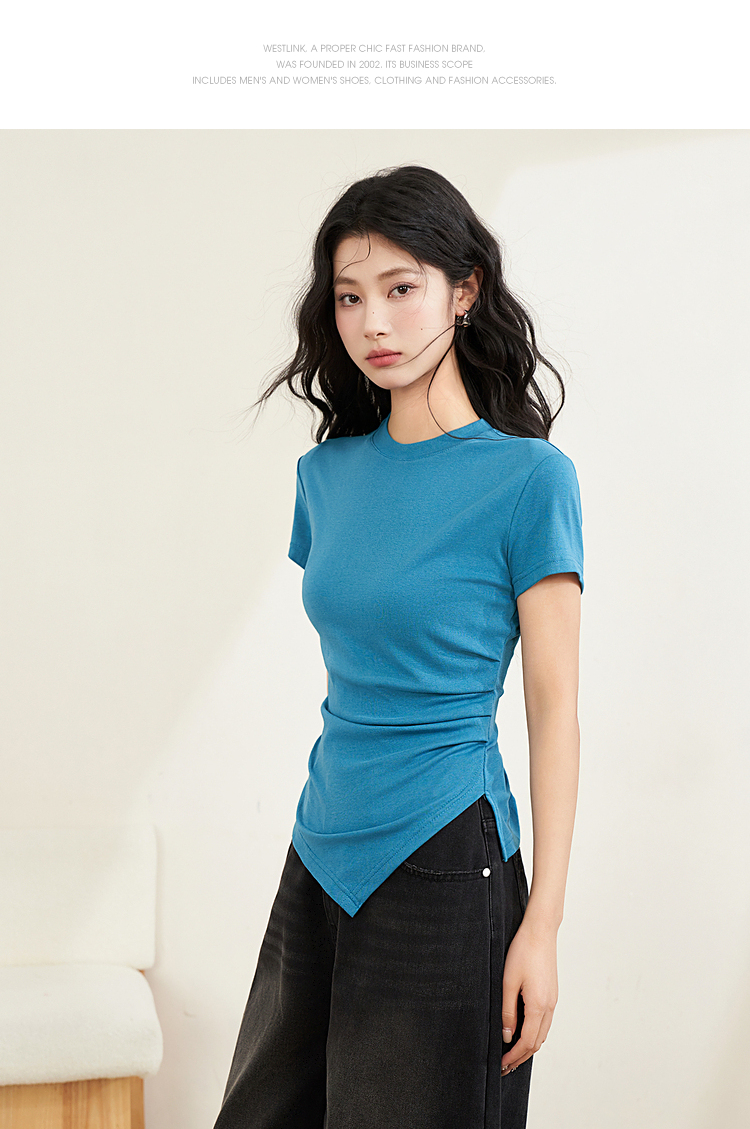 西遇黑色气质紧身T恤女新款不规则下摆设计感短袖蓝色V0050525/10740173
