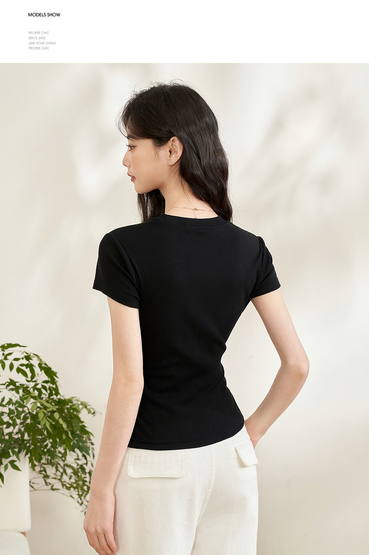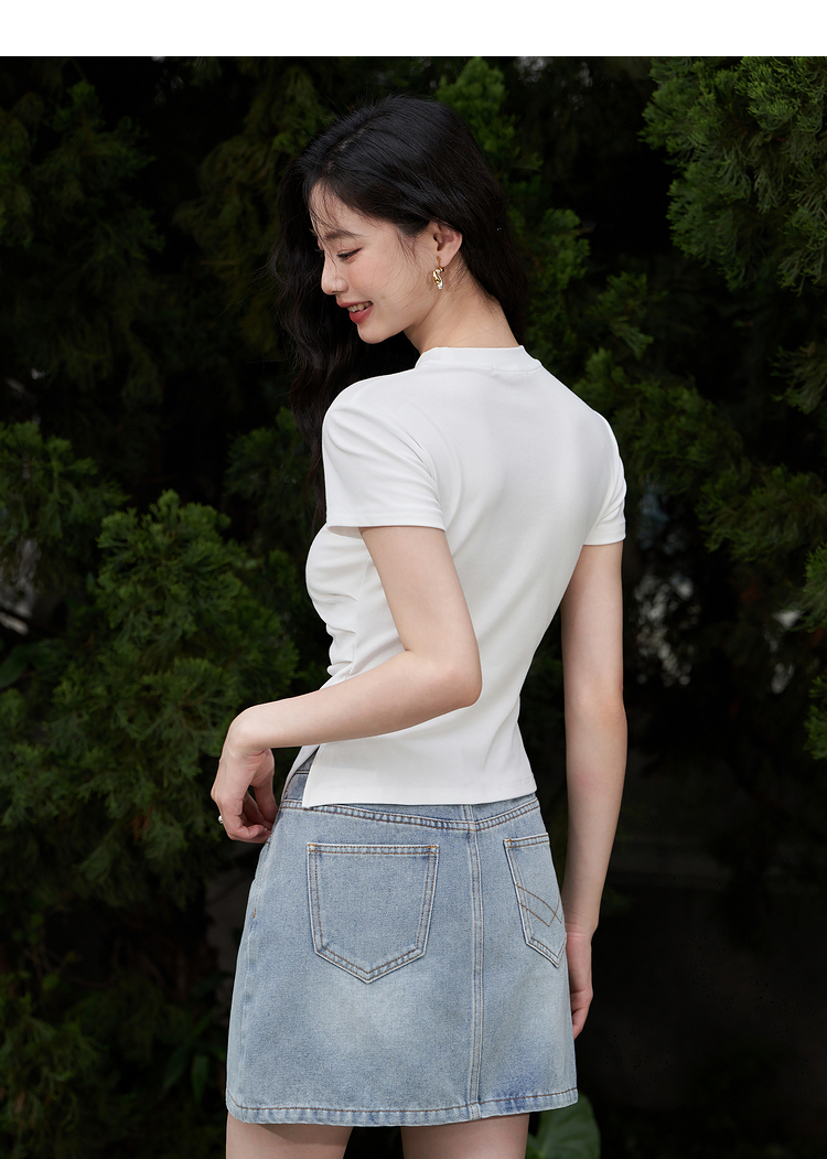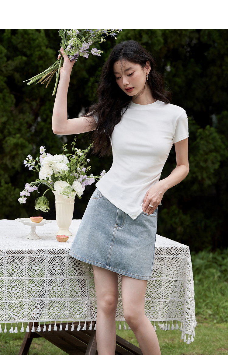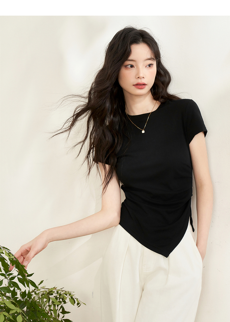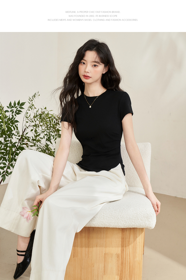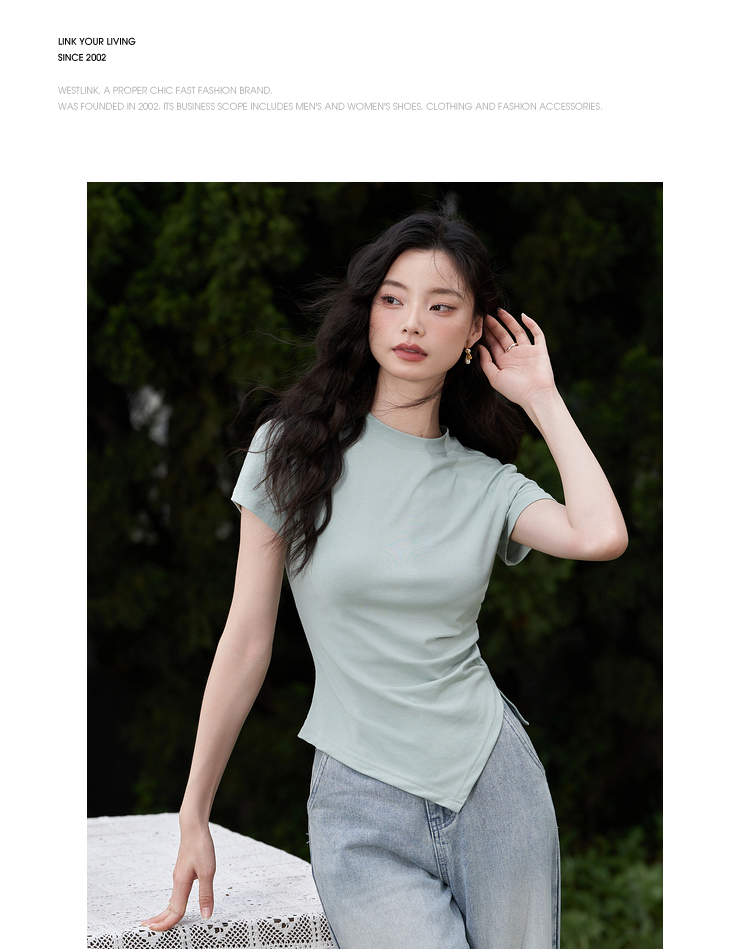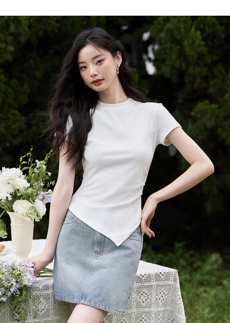 西遇黑色气质紧身T恤女新款不规则下摆设计感短袖蓝色V0050525/10740173