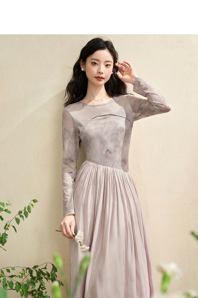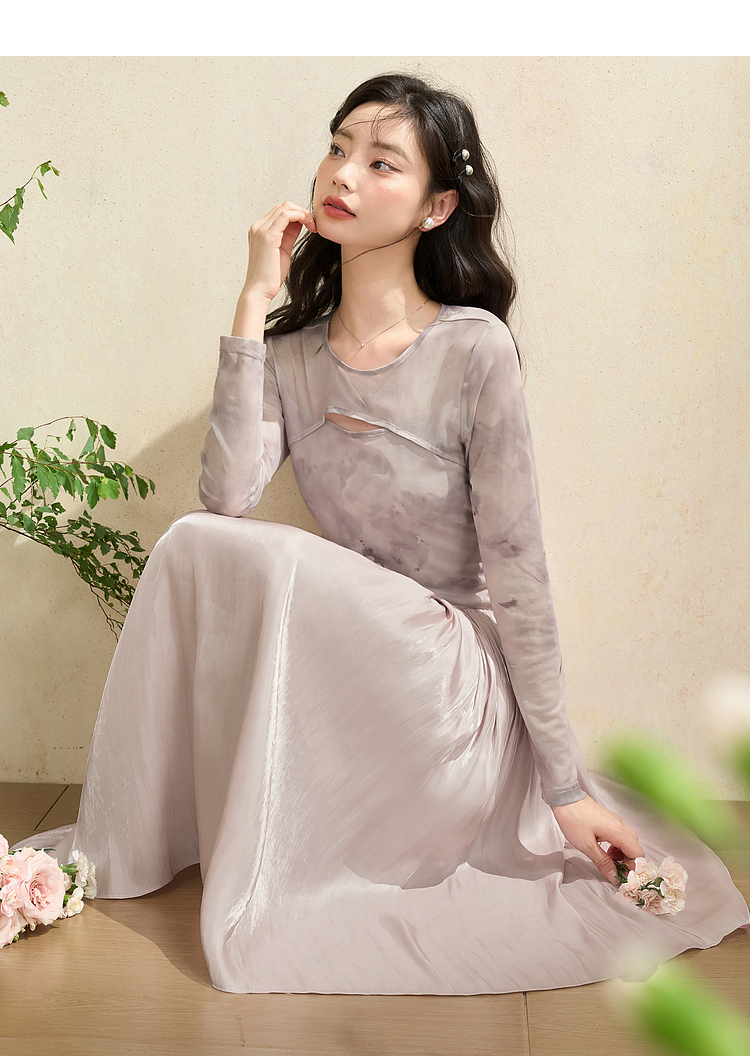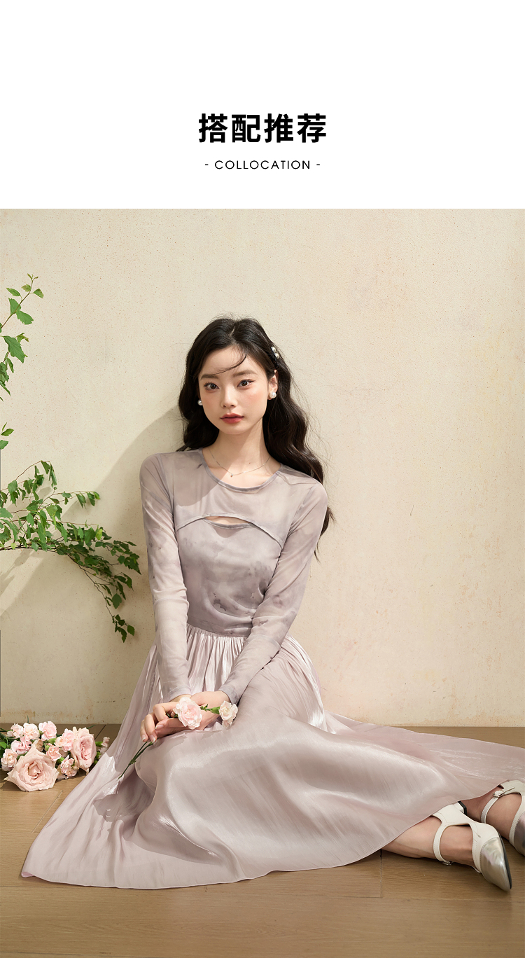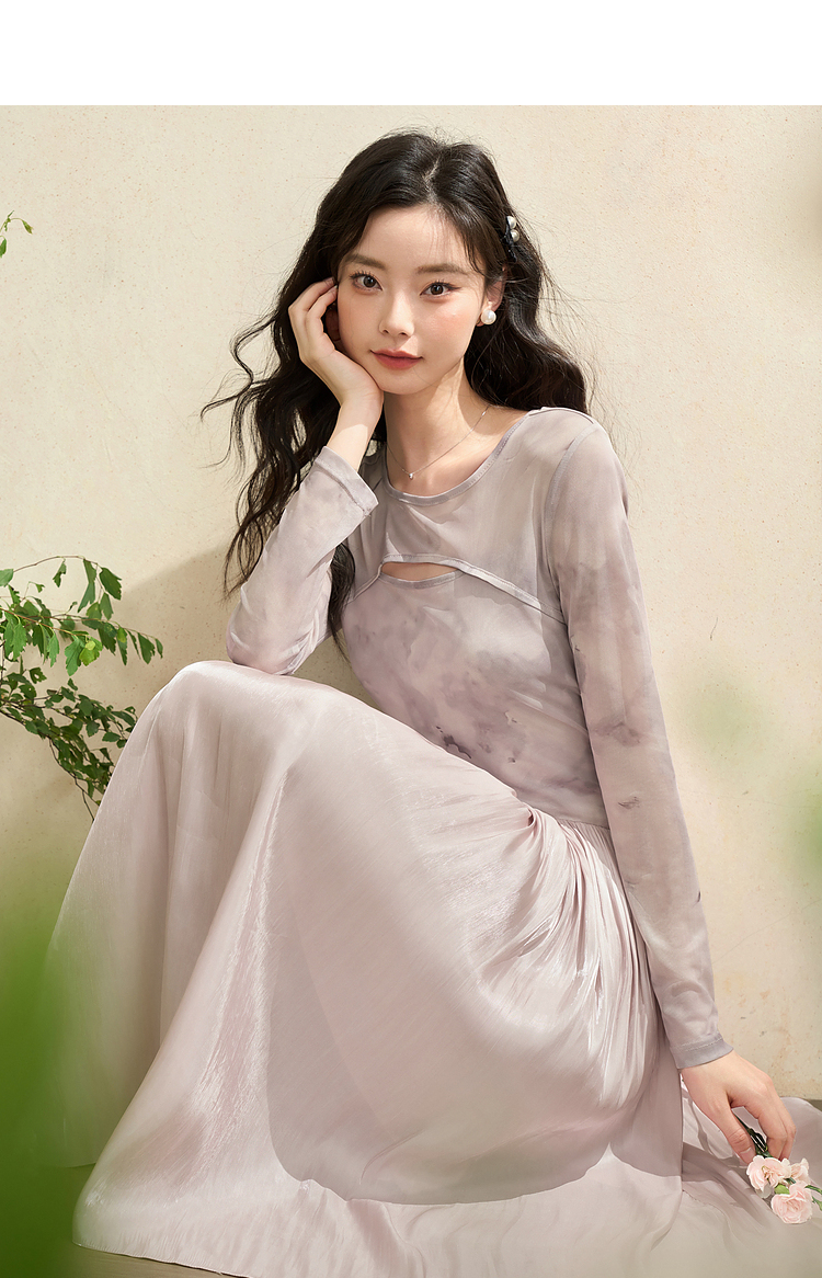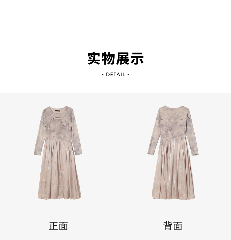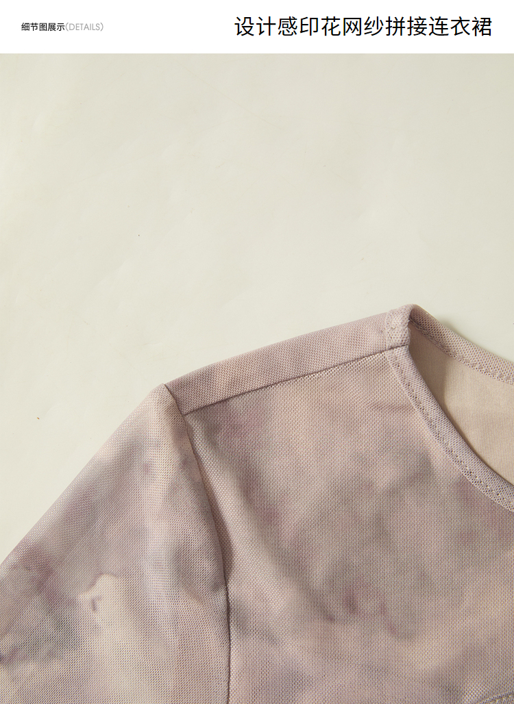 假两件设计感印花网纱拼接镂空连衣裙女轻奢温柔长裙V2942193